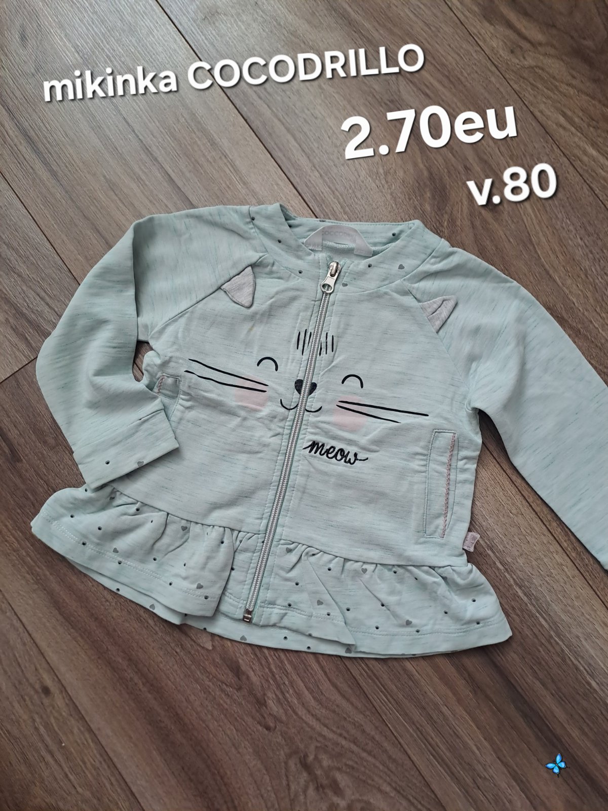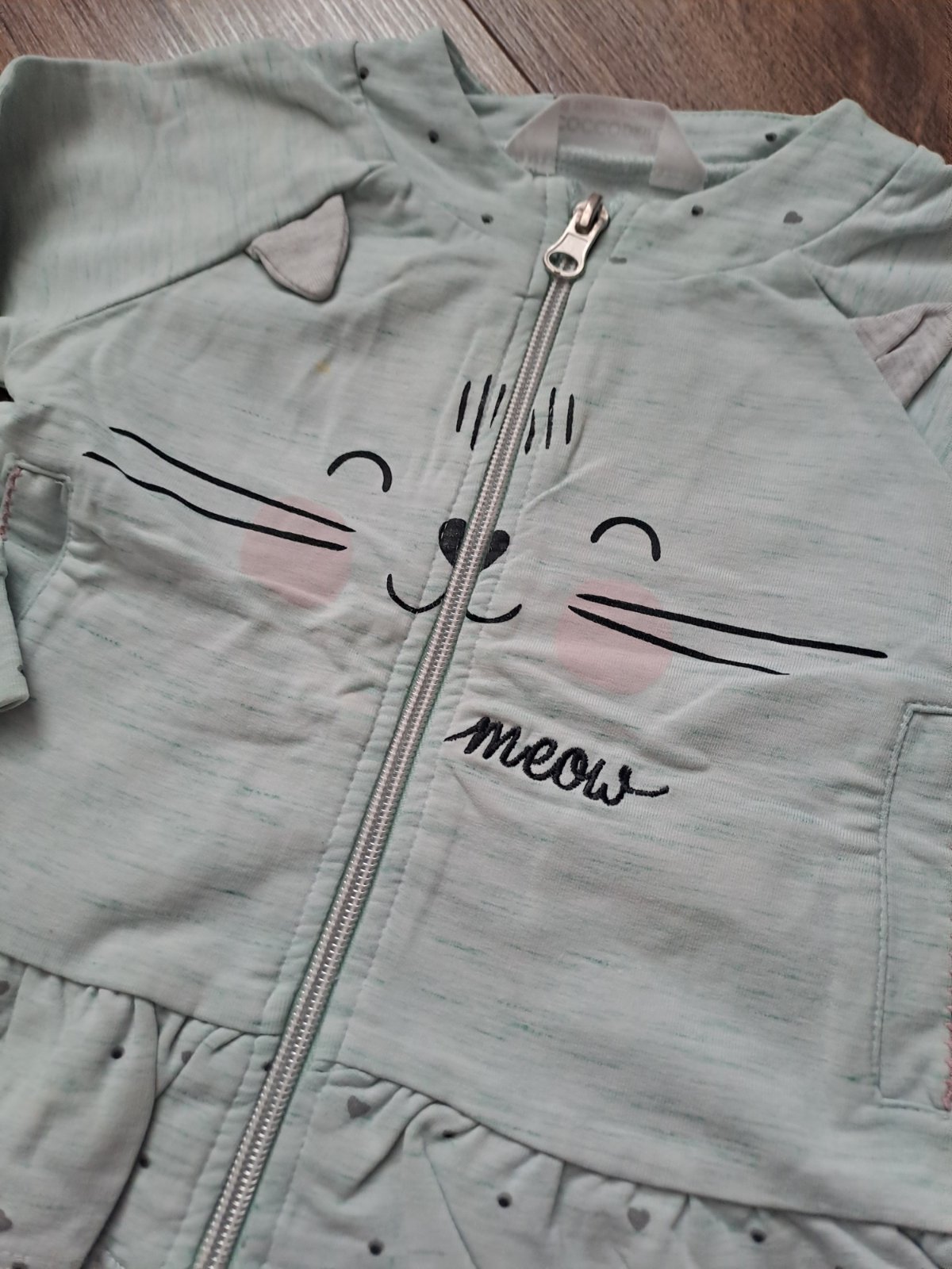 Náš nejoblíbenější mačičkovský kompletík. Dá se nosit až do 2 let. Velmi milá, pěkné detaily. Dobrý stav, na rukávu mikro zašitá dírka, při nošení, ale nejde nic vidět.