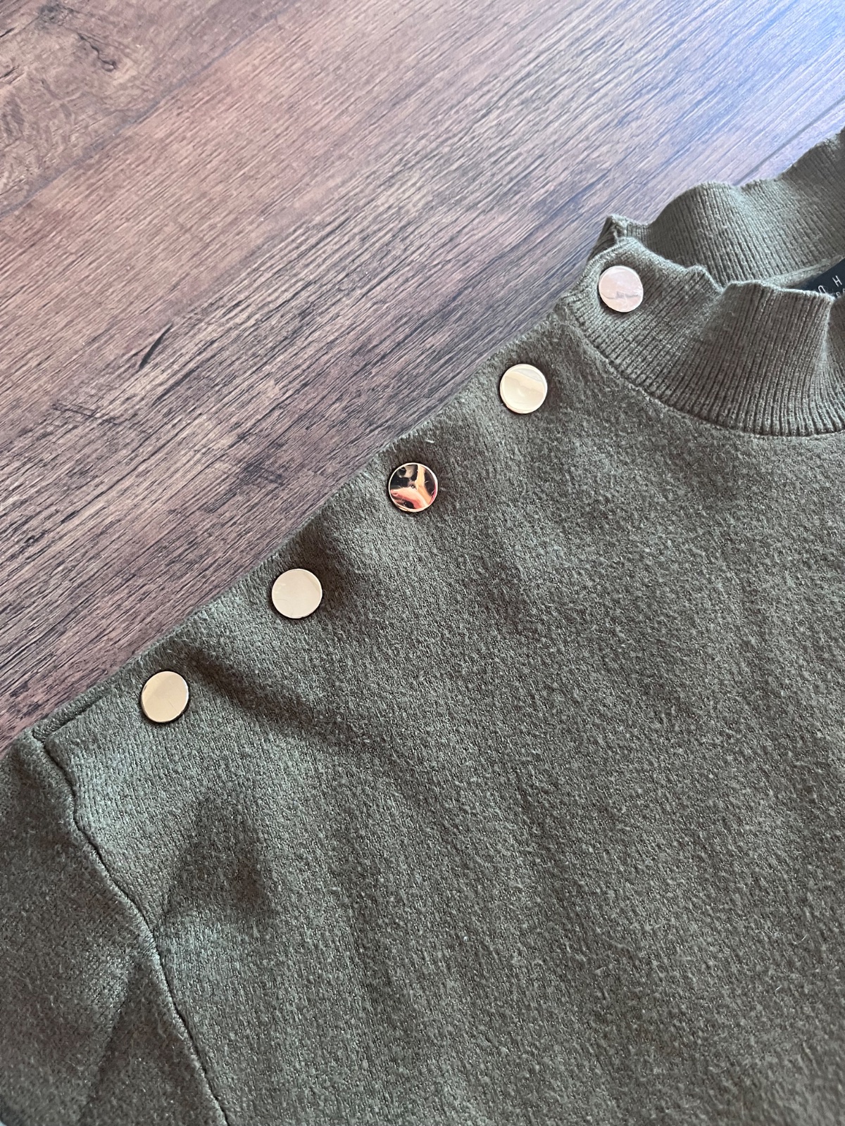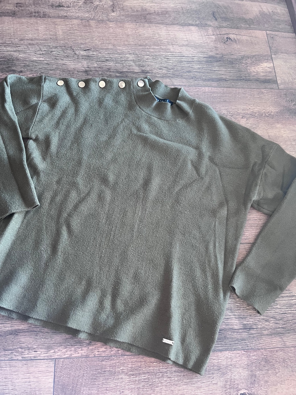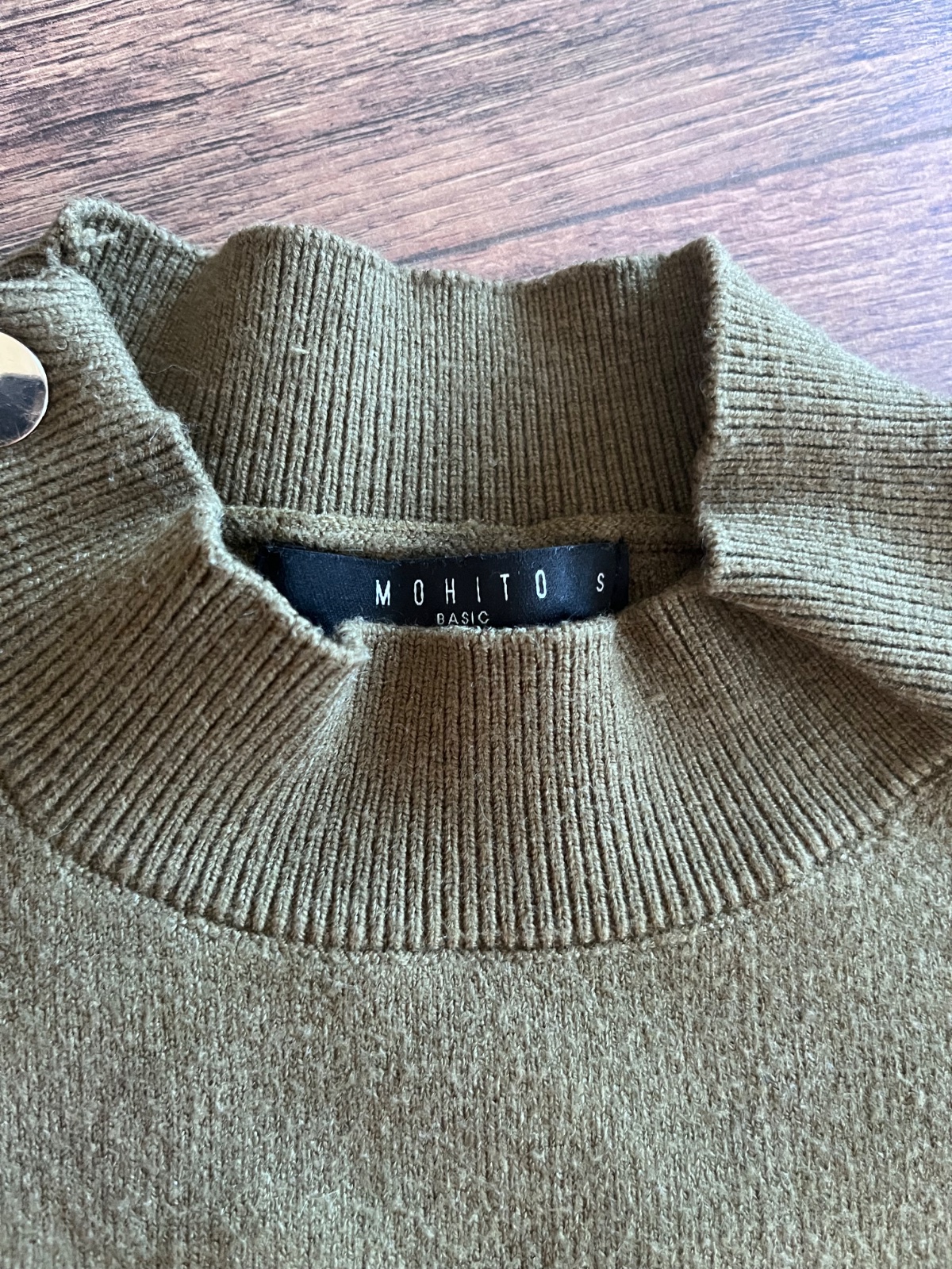 Svetrík so stojačikom, olivovej farby, v dobrom nosenom stave, jemne žmolky.