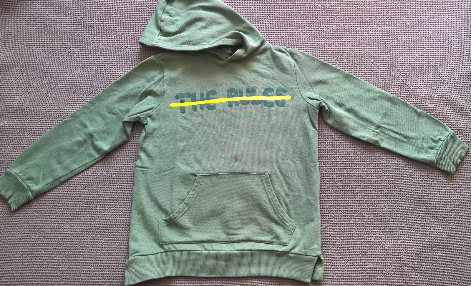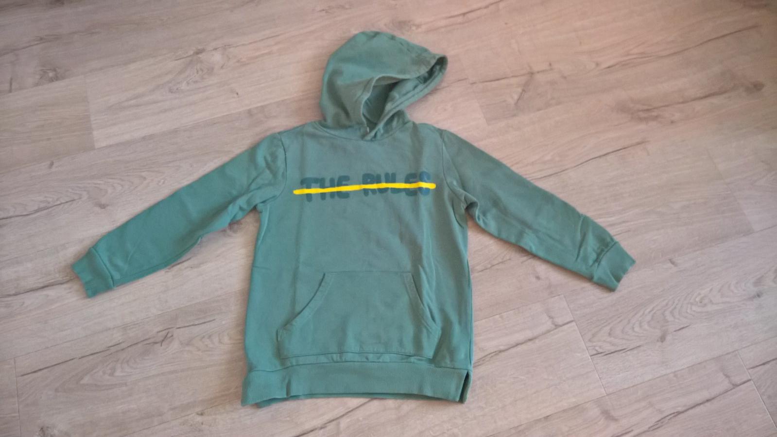 Zateplená bavlnená mikina v super stave, bez poškodení. Uvedená veľkosť 140, ale podľa mňa je menšia, rozmery: rukáv od všitia kapucne 54cm...dĺžka mer. od ramena nadol 55,5cm.
