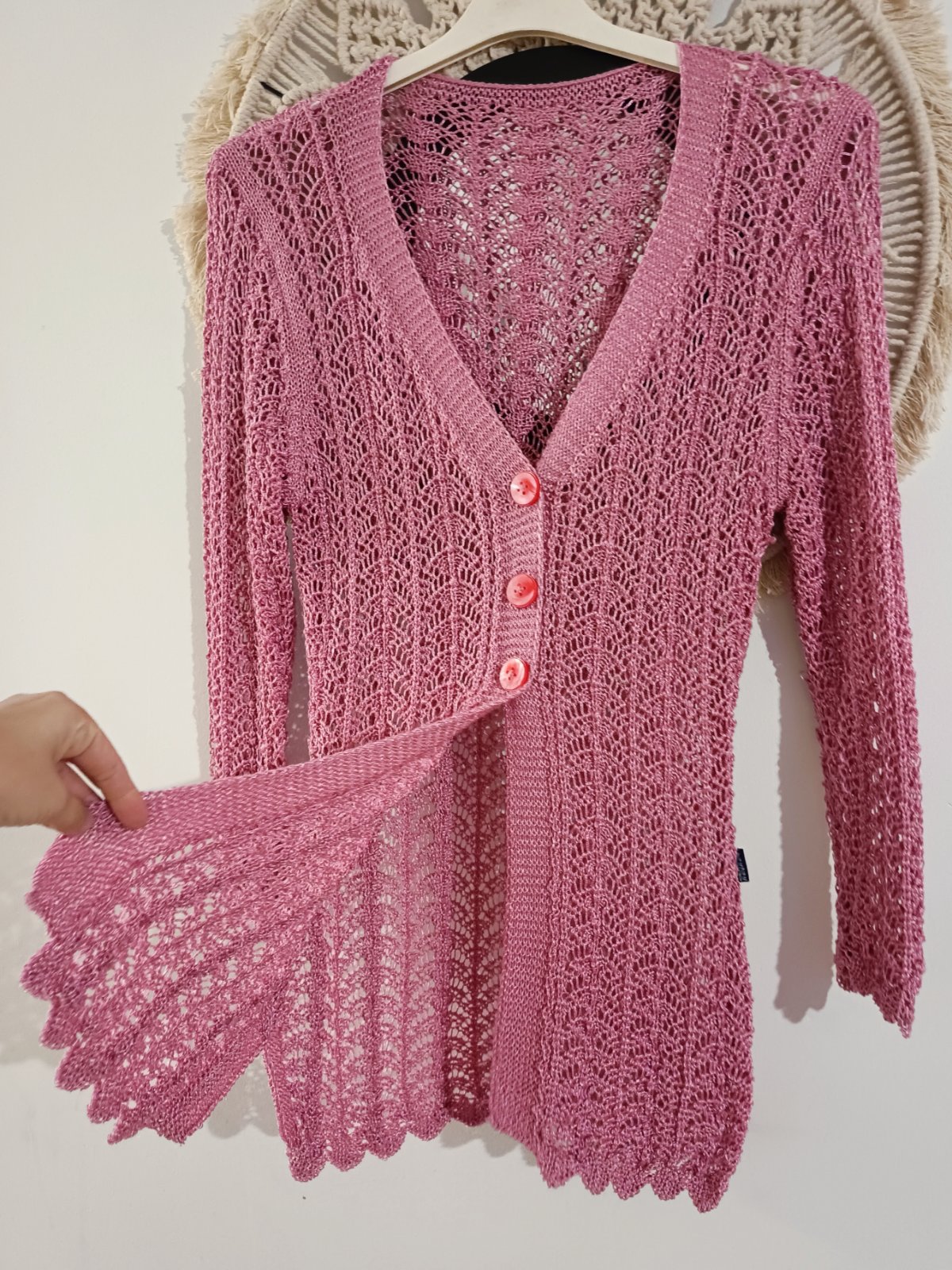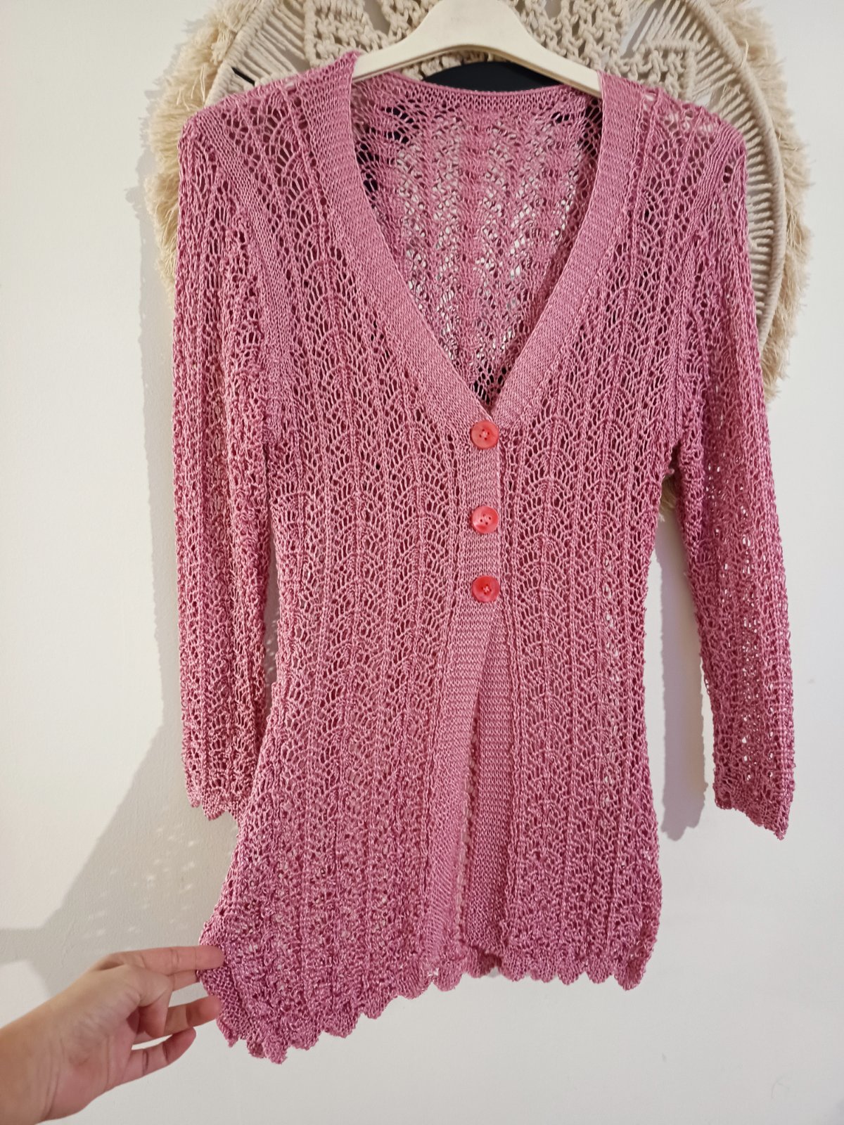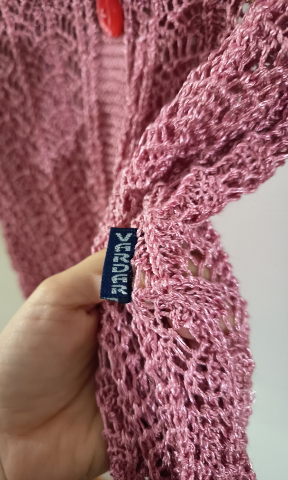 Sveter staroruzovej farby, gombiky su vsetky ruzove, odrazal sa jeden, jeden ale chyba, maju byt 4.Inak v dobrom stave, stylovy, teply