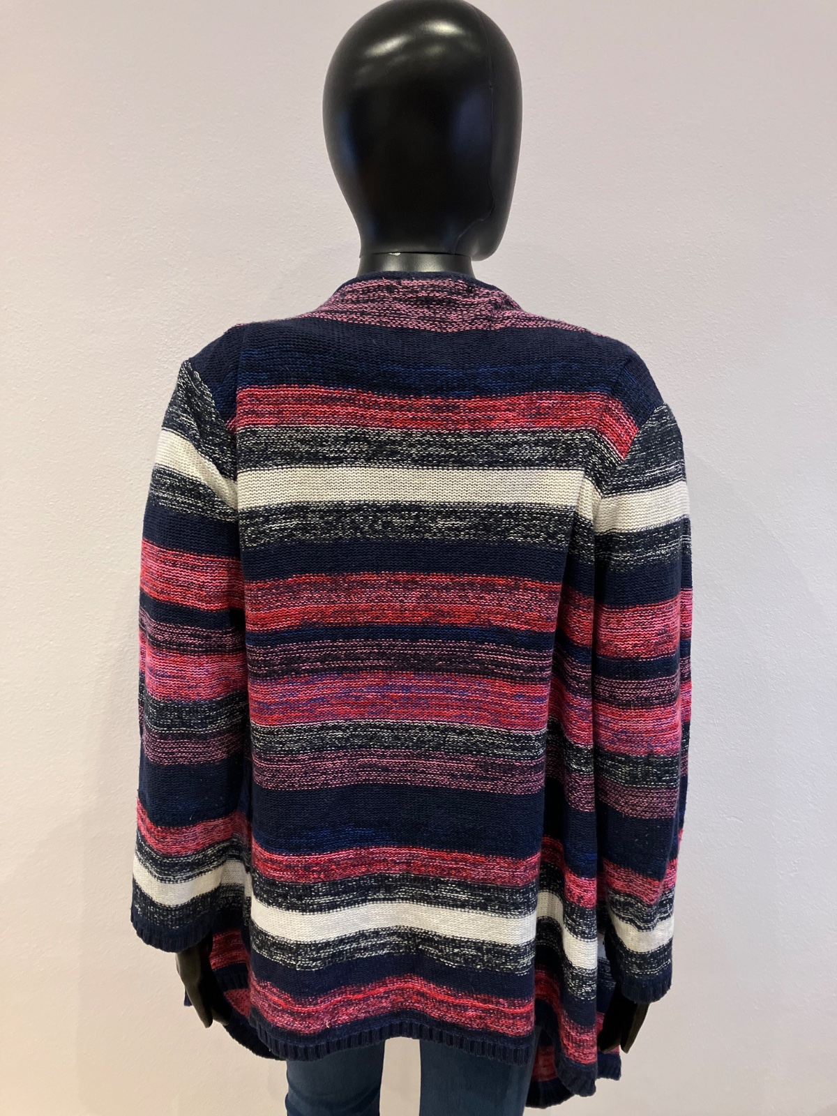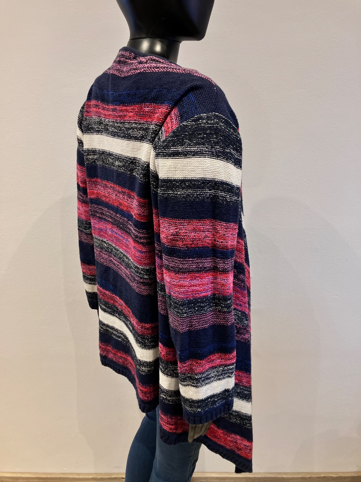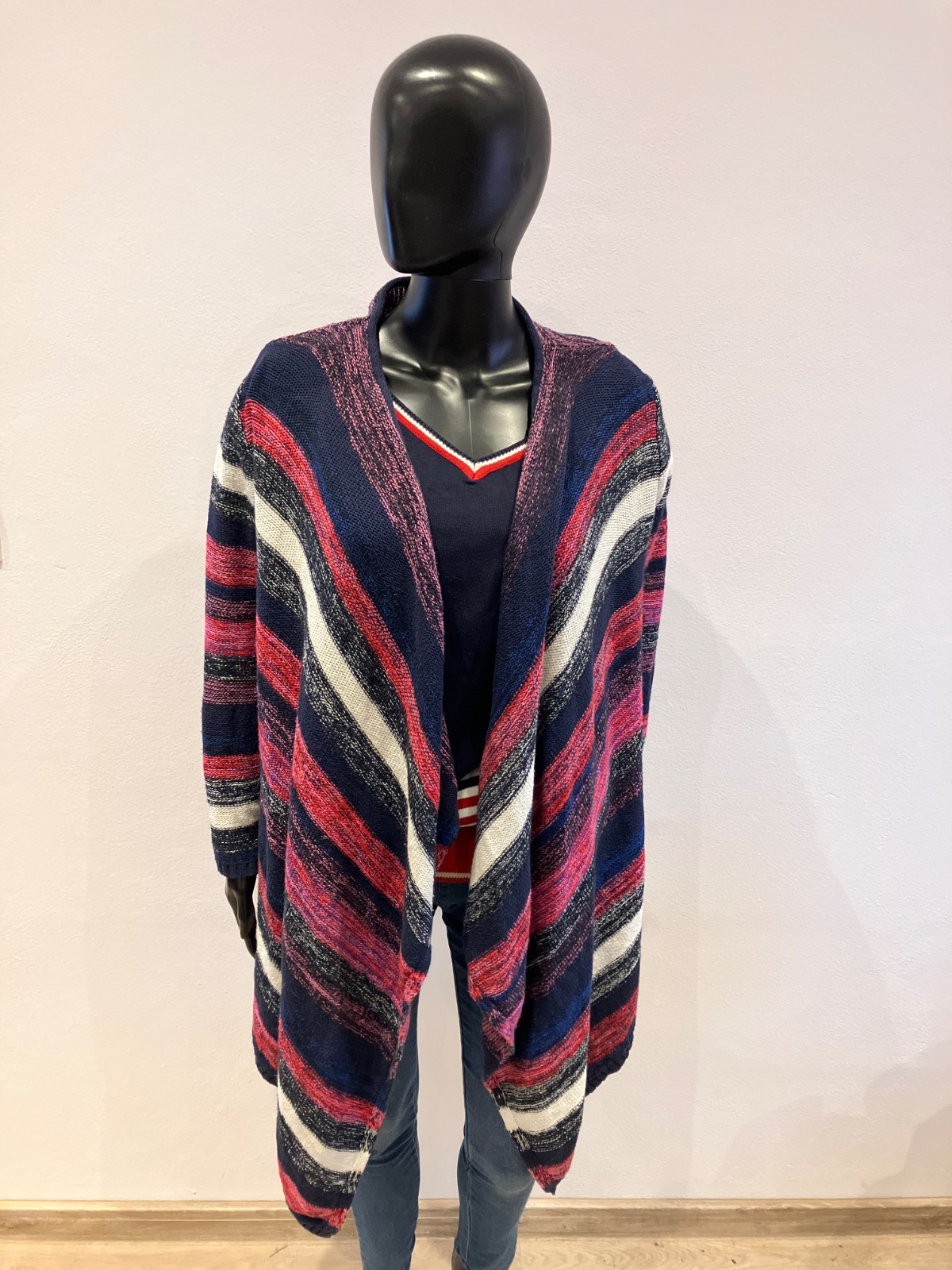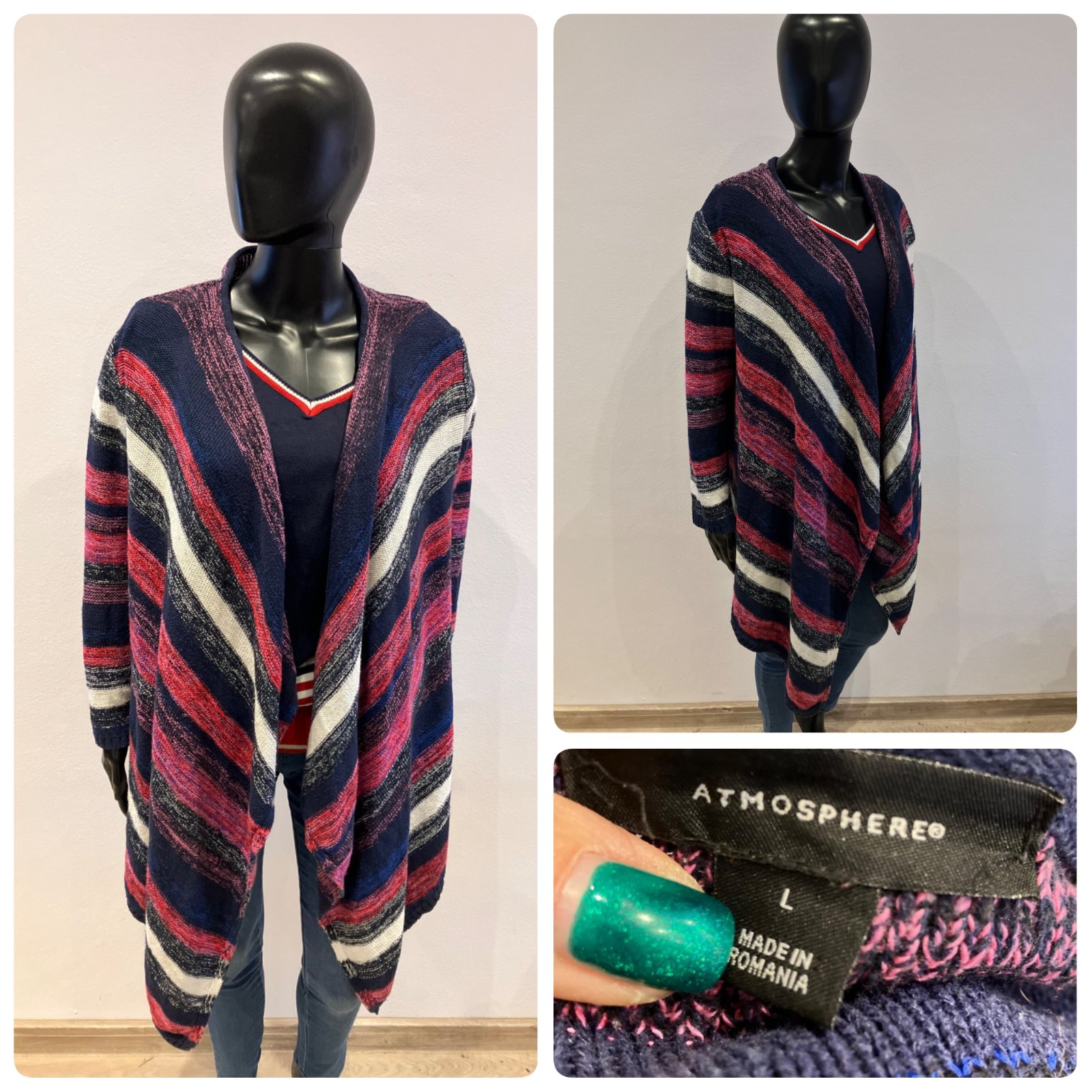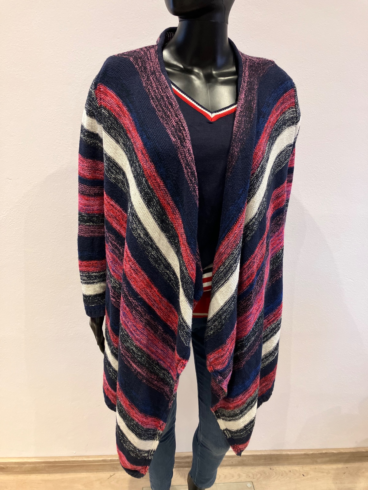 Dámsky kardigán, pásikavý, asymetrický, ružovo-červeno-bielo-tmavomodrý, elastický, materiál 54%bavlna 42%akryl 4%polyester.