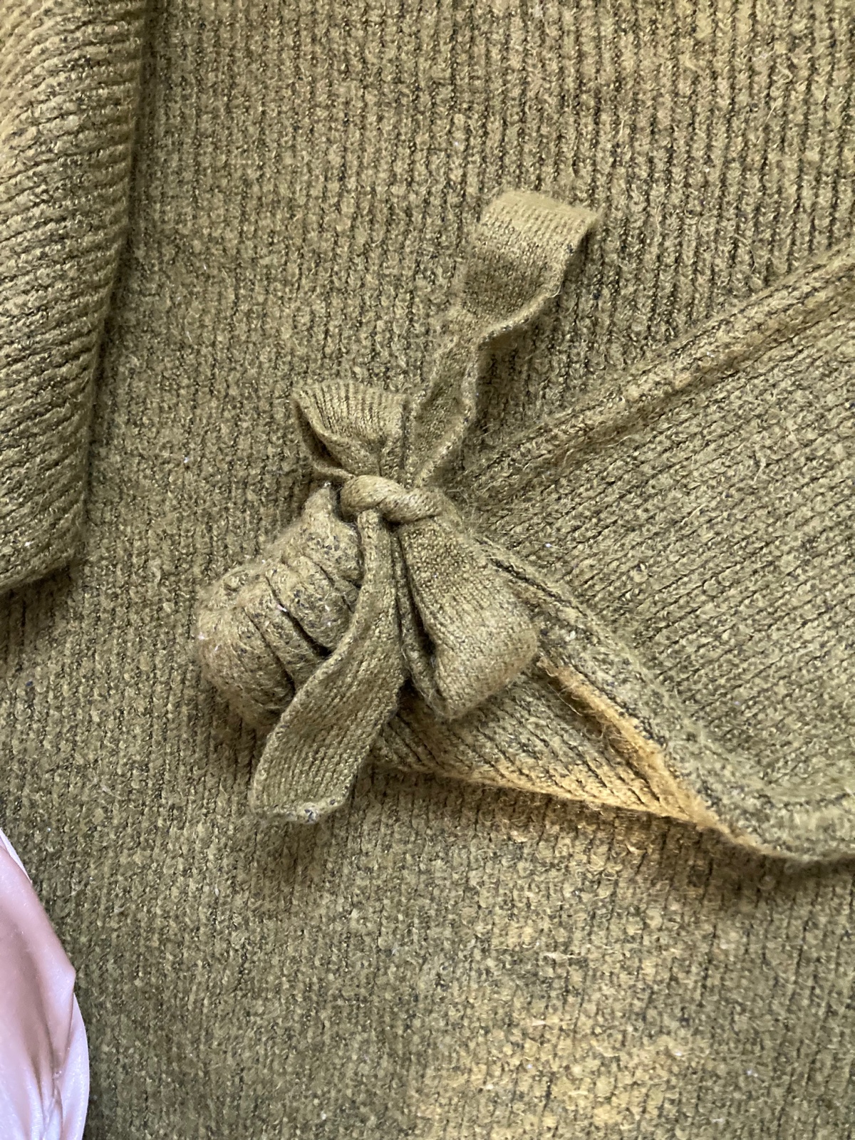 Noseny minimum ako novy, rukavy su volnejsie take volanikovejsie, na konci sa viazu na maslicku. Velkost zodpoveda xs, s aj mensie mko oblecie. Sveter je mierne oversize, je prijemne teply a ma krasnu zelenu khaki farbu.