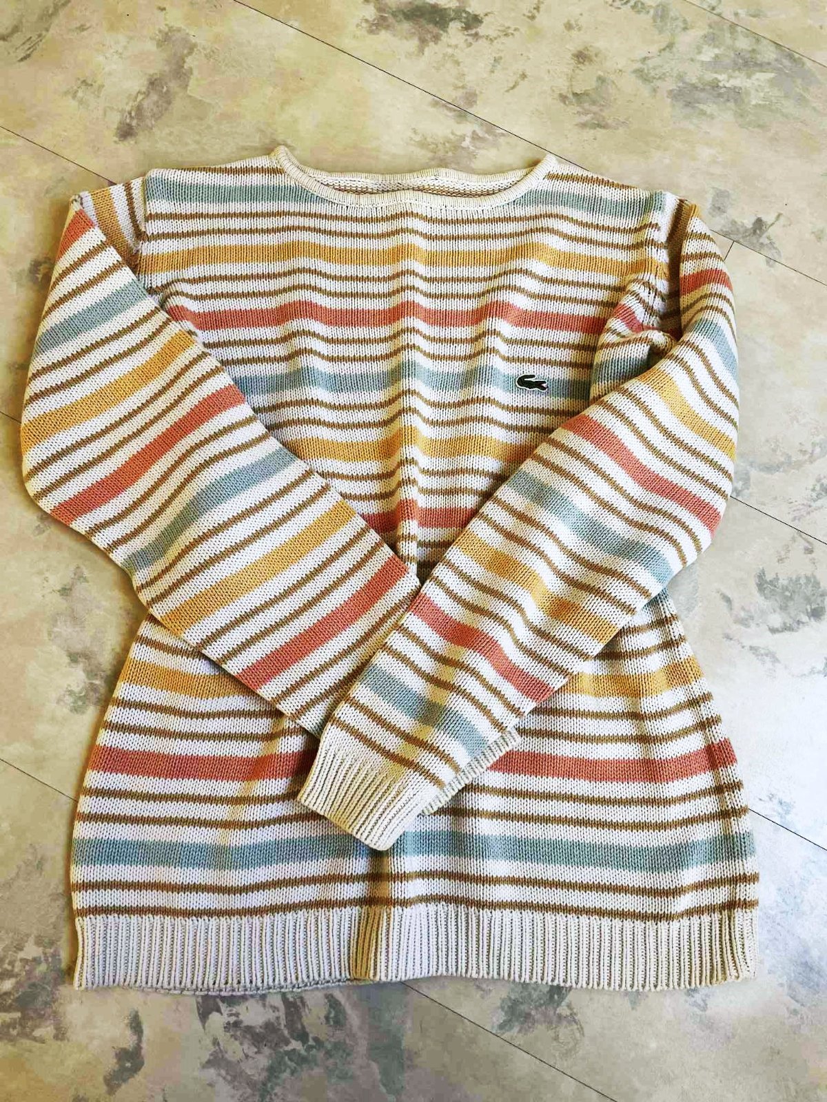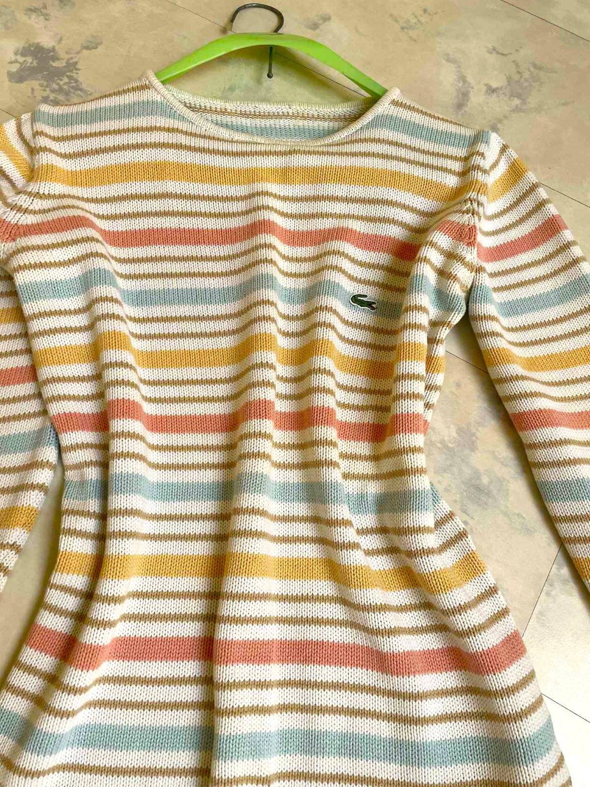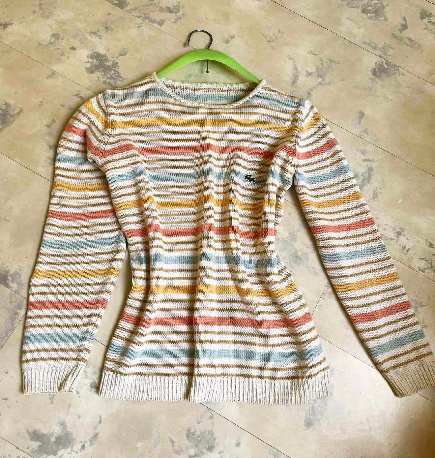 neznosený,super kvalita,krásne jemné pastelové farby,nie je to Lacoste, je tam iba nášivka z recesie,ale dá sa odpárať,nie je pod ňou dierka alebo fľak - aby to bolo na zamaskovanie,ale vyzerá to super....