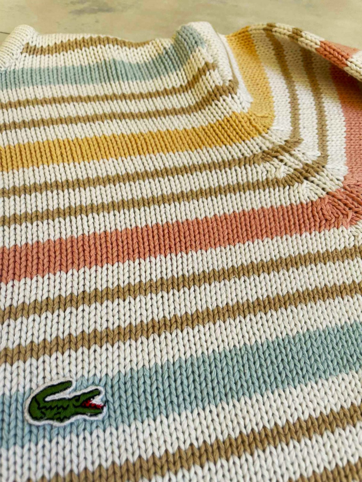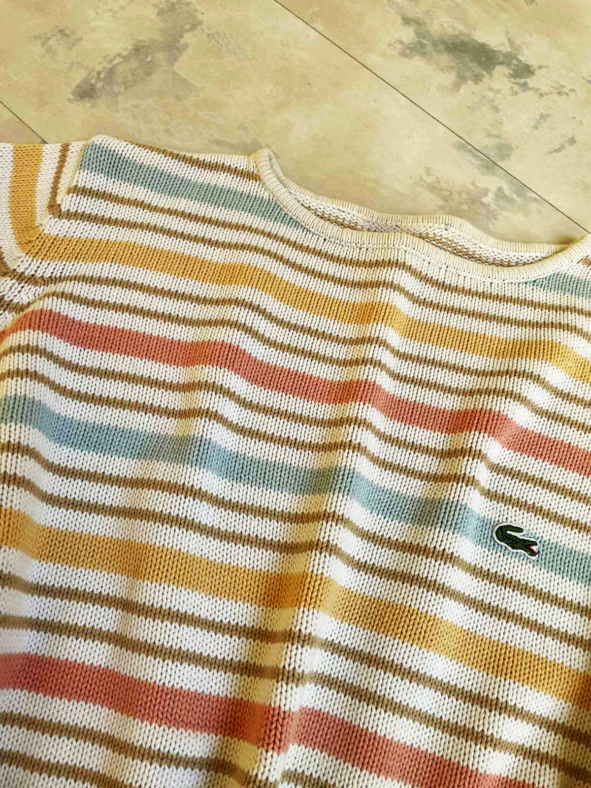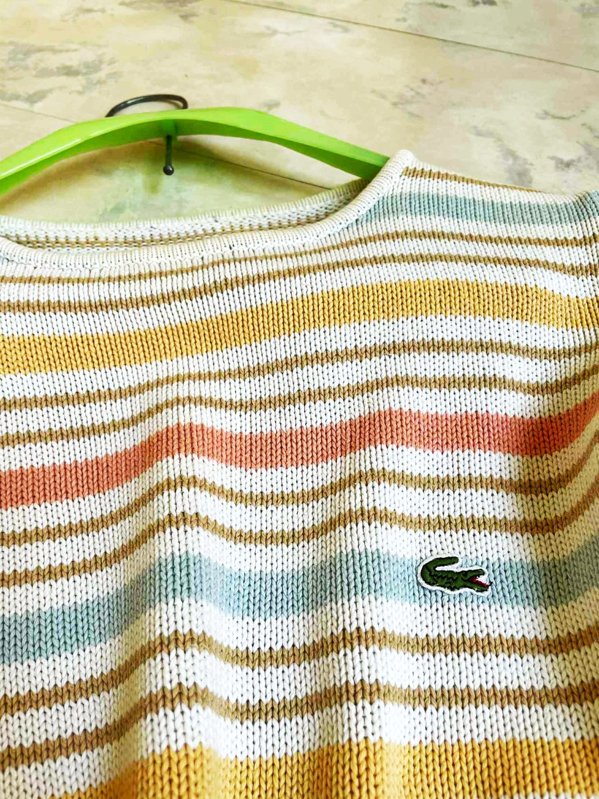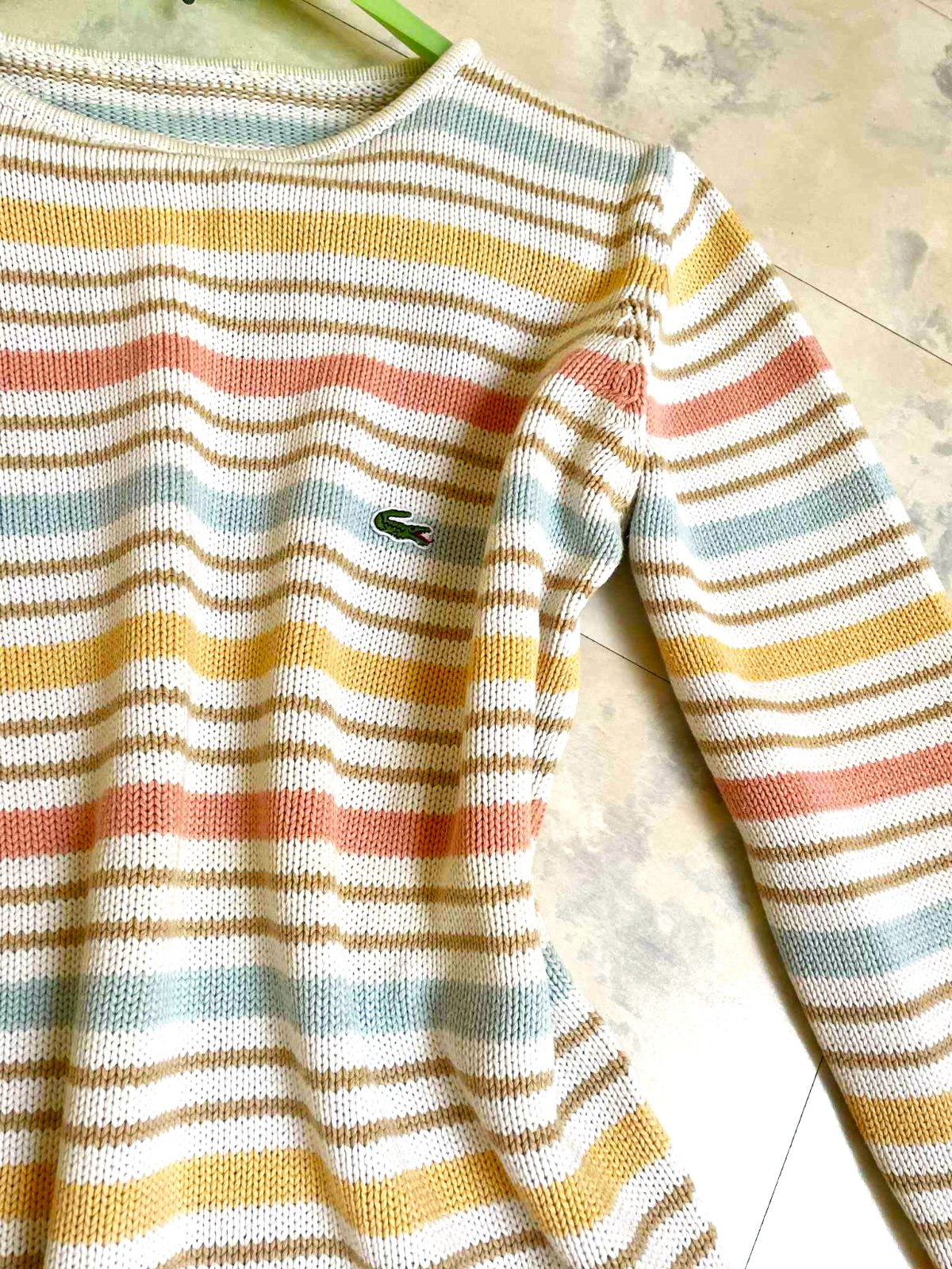 neznosený,super kvalita,krásne jemné pastelové farby,nie je to Lacoste, je tam iba nášivka z recesie,ale dá sa odpárať,nie je pod ňou dierka alebo fľak - aby to bolo na zamaskovanie,ale vyzerá to super....