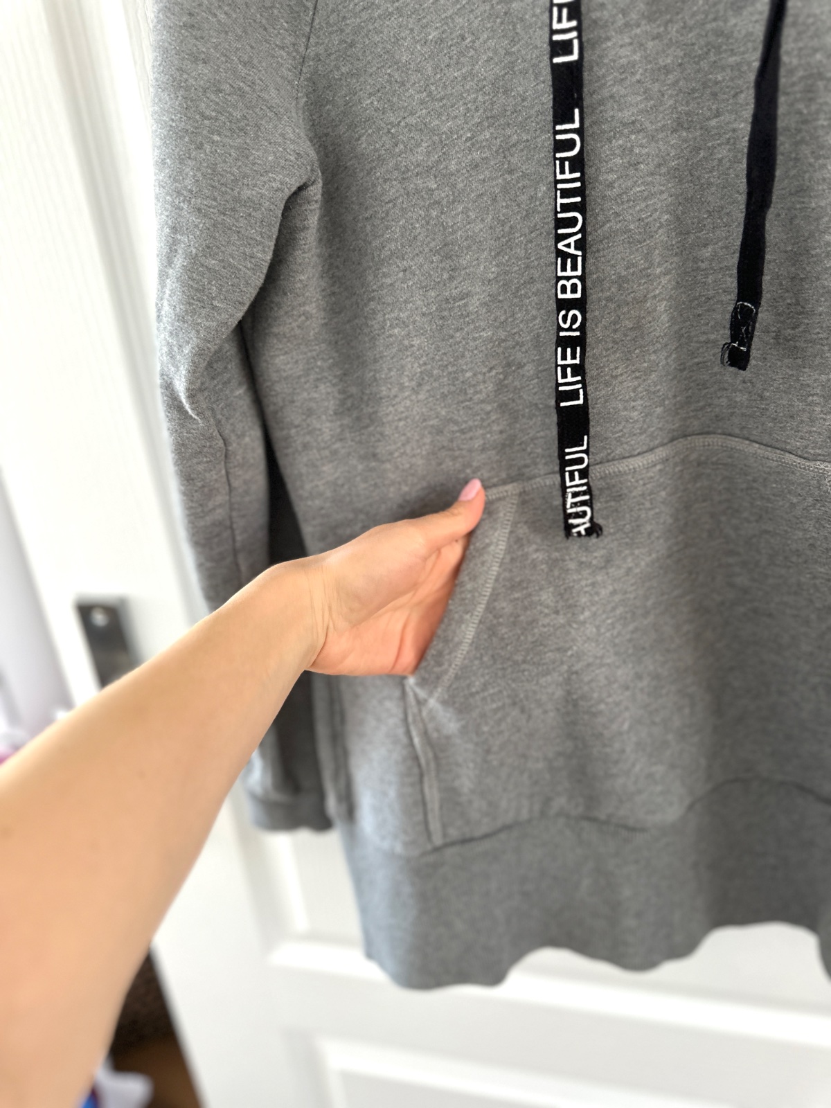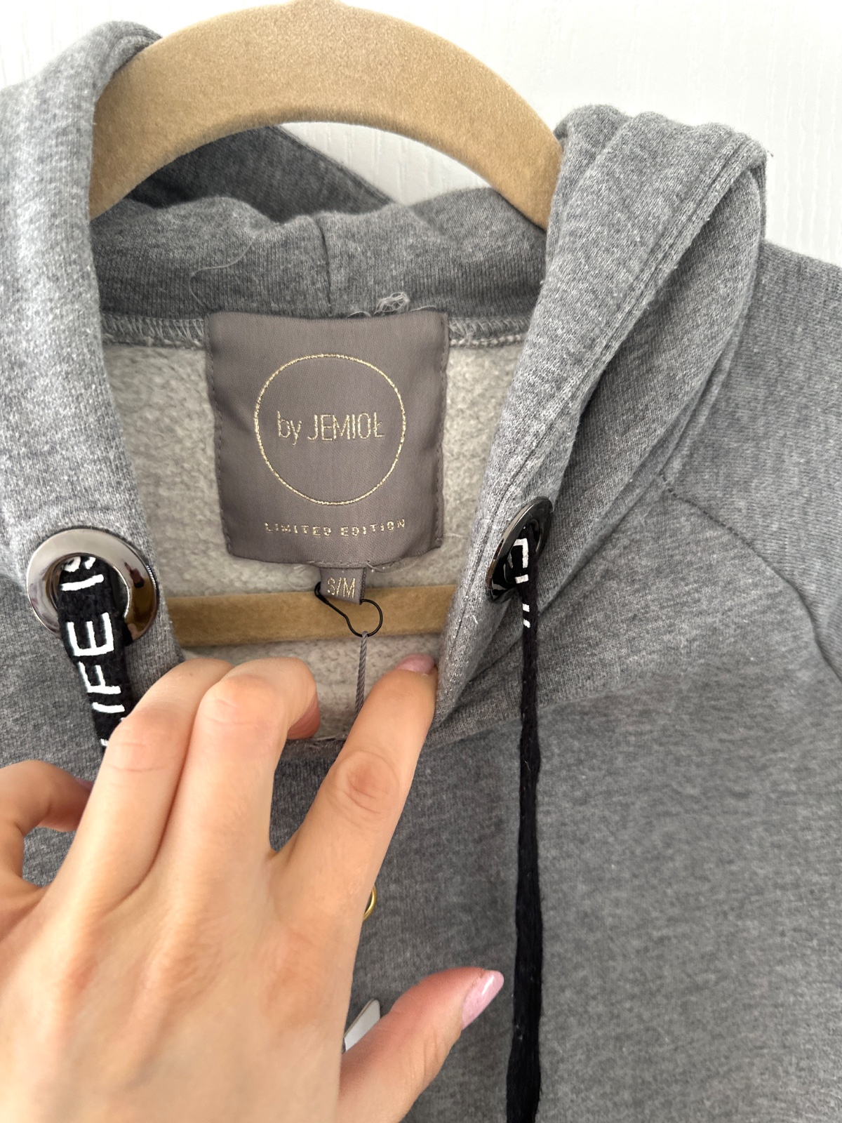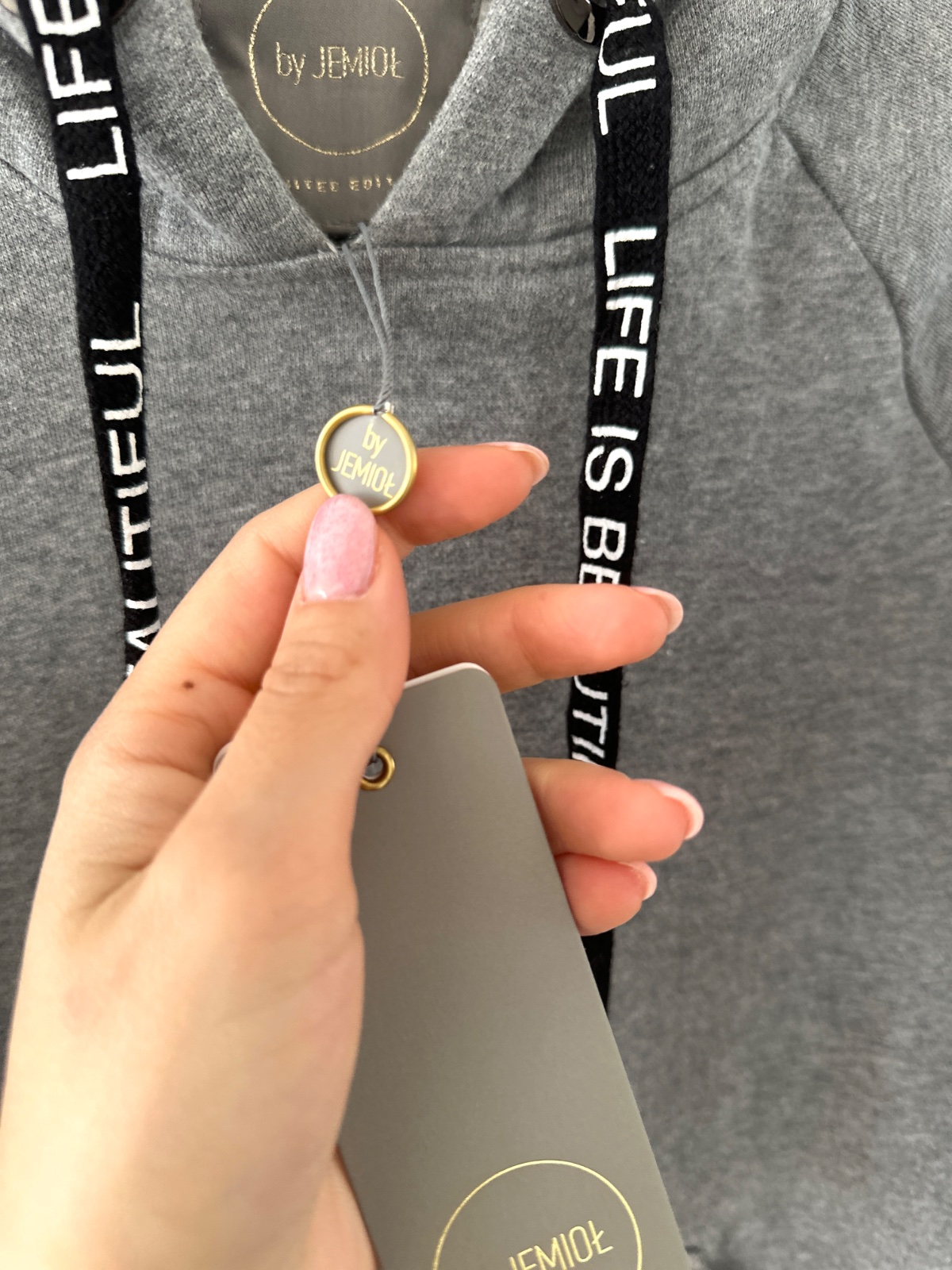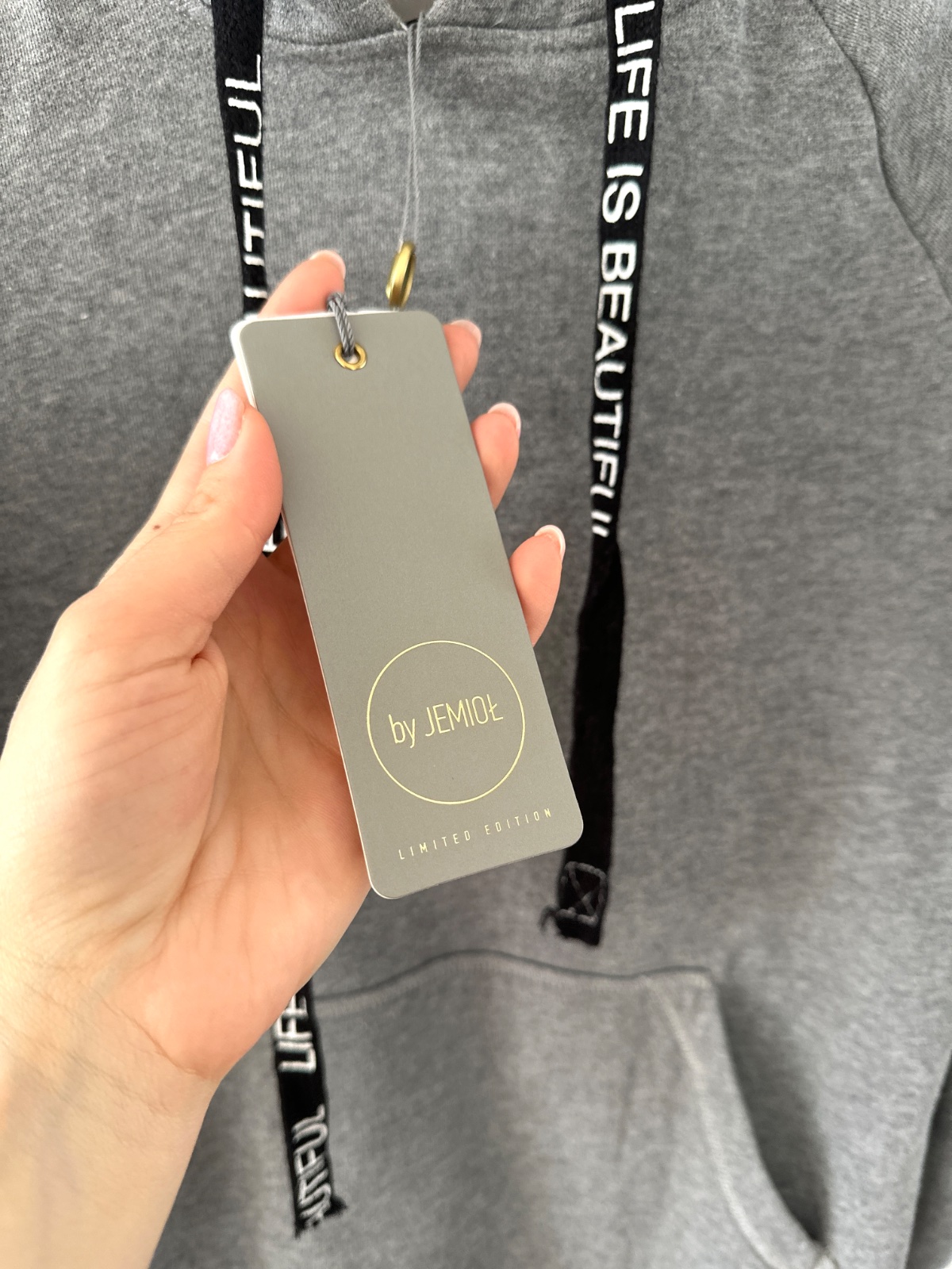 Mikina od poľského návrhára Łukasza Jemiola. Sveter je sivej farby, má kapucňu zdobenú čiernou šnúrkou s bielym nápisom: life is beautiful. Rovnaký nápis je vyšitý aj na rukáve. Mikina je ušitá z hrubej bavlny (100% bavlna). Veľkosť na štítku je S/M. Mikina je dlhšia, siaha po stehná. Šírka 49cm, dĺžka 70cm. Skvele sa hodí k legínam alebo sa dá nosiť ako teplákové šaty s teniskami. Tunika je nová s visačkami, cenníková cena je 40,99€.
