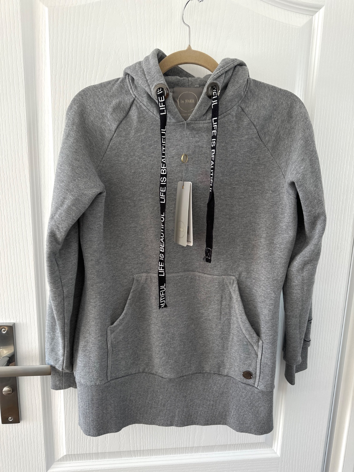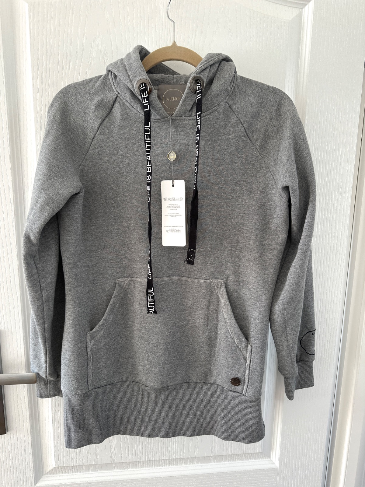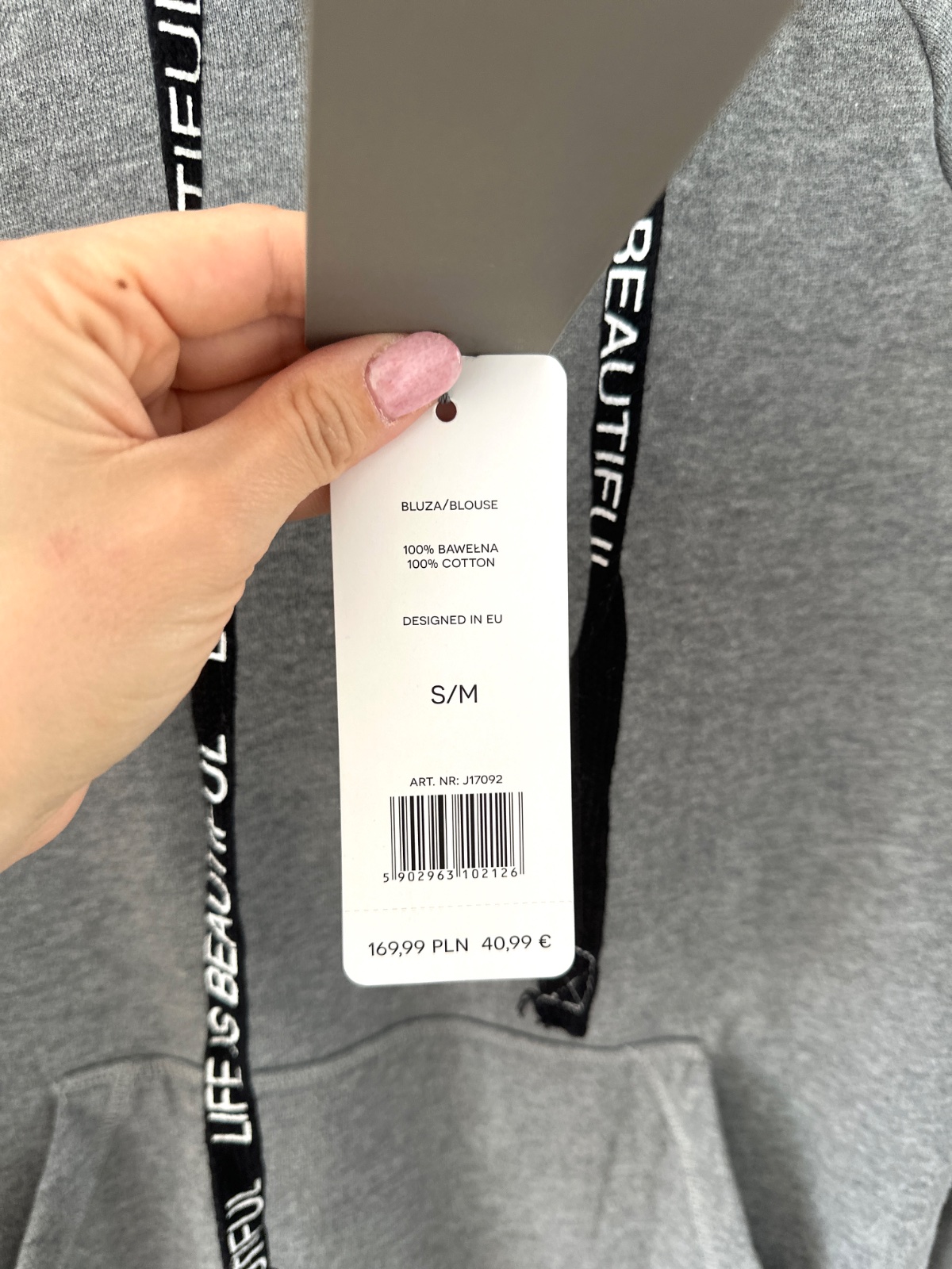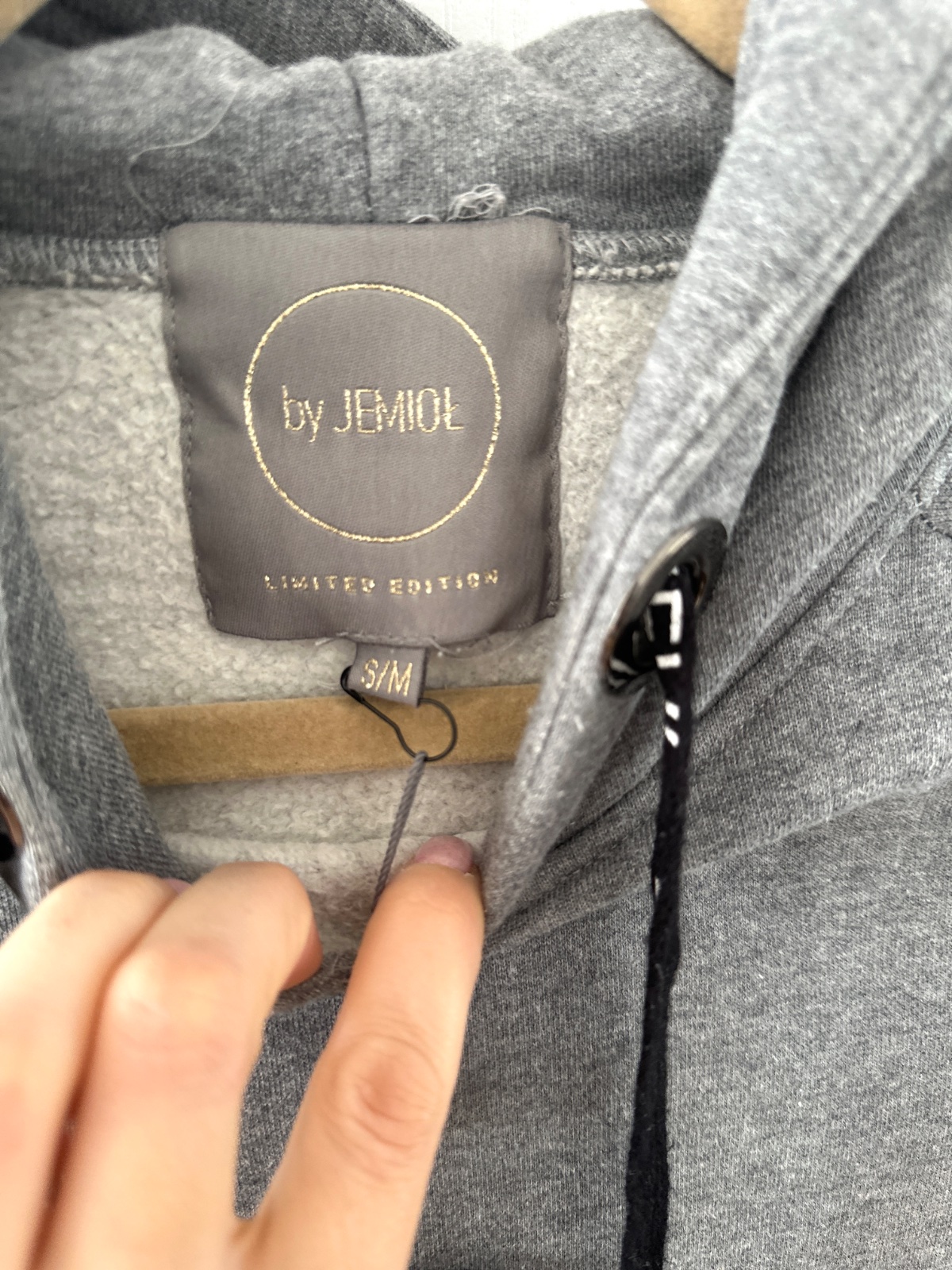 Mikina od poľského návrhára Łukasza Jemiola. Sveter je sivej farby, má kapucňu zdobenú čiernou šnúrkou s bielym nápisom: life is beautiful. Rovnaký nápis je vyšitý aj na rukáve. Mikina je ušitá z hrubej bavlny (100% bavlna). Veľkosť na štítku je S/M. Mikina je dlhšia, siaha po stehná. Šírka 49cm, dĺžka 70cm. Skvele sa hodí k legínam alebo sa dá nosiť ako teplákové šaty s teniskami. Tunika je nová s visačkami, cenníková cena je 40,99€.