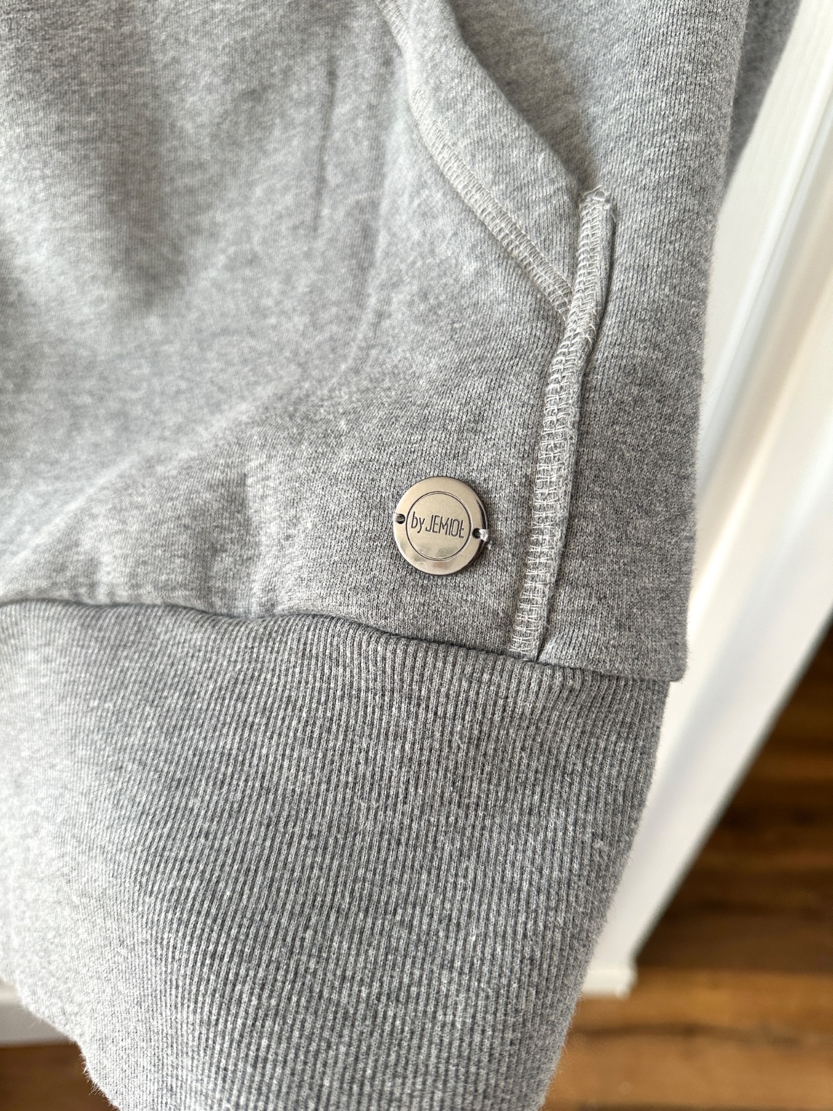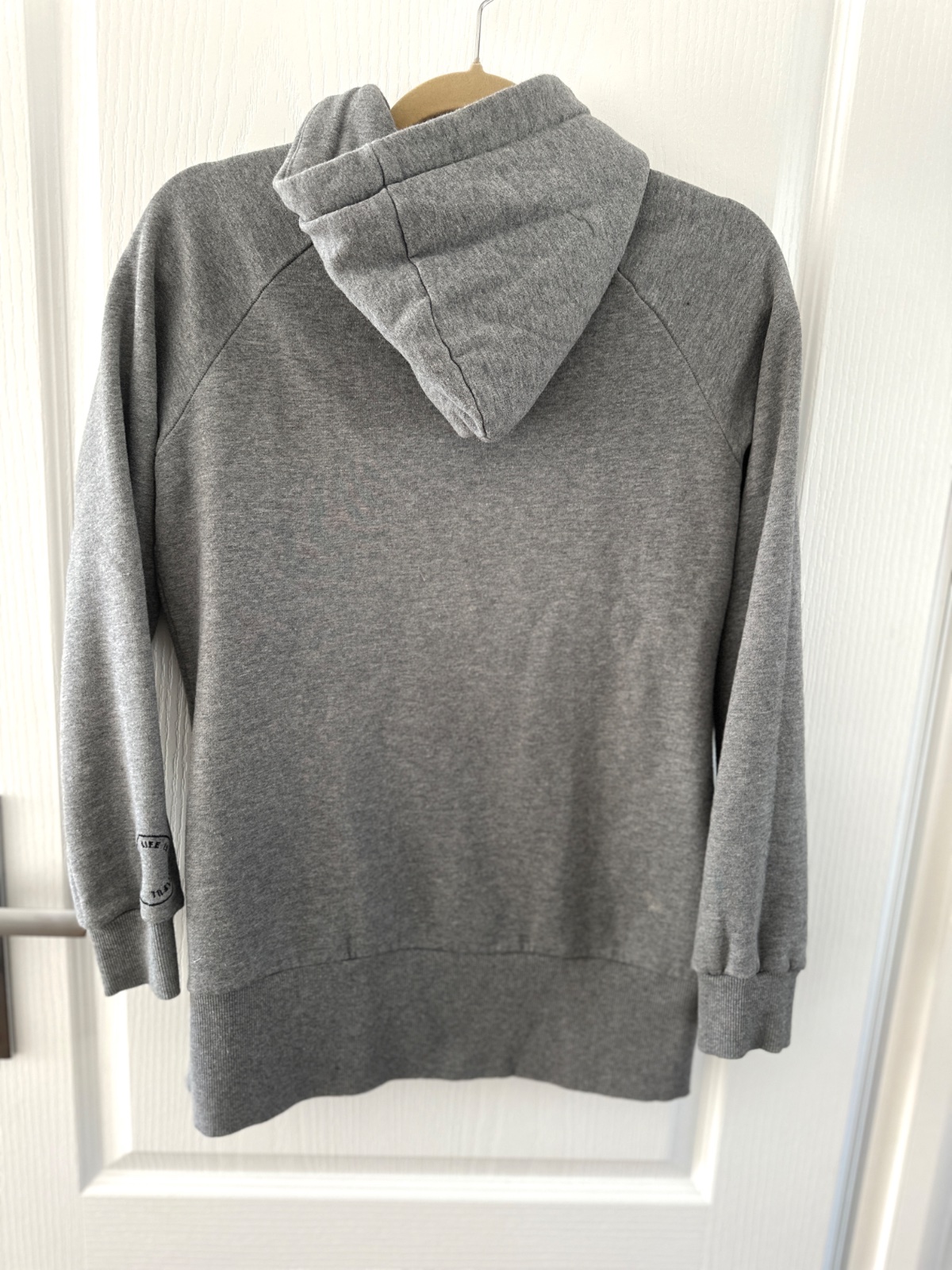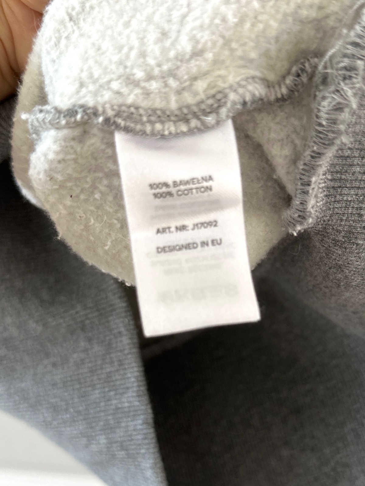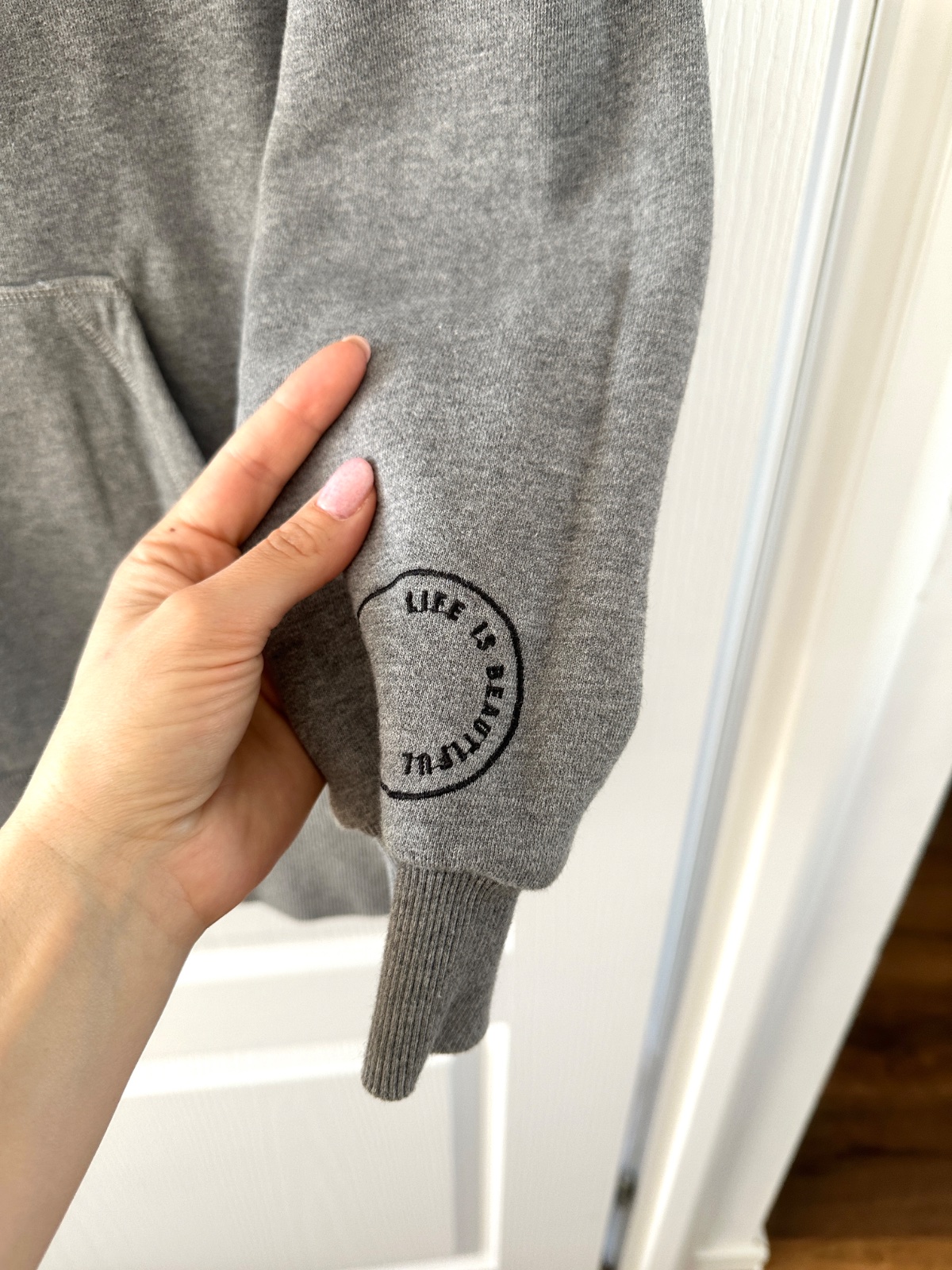 Mikina od poľského návrhára Łukasza Jemiola. Sveter je sivej farby, má kapucňu zdobenú čiernou šnúrkou s bielym nápisom: life is beautiful. Rovnaký nápis je vyšitý aj na rukáve. Mikina je ušitá z hrubej bavlny (100% bavlna). Veľkosť na štítku je S/M. Mikina je dlhšia, siaha po stehná. Šírka 49cm, dĺžka 70cm. Skvele sa hodí k legínam alebo sa dá nosiť ako teplákové šaty s teniskami. Tunika je nová s visačkami, cenníková cena je 40,99€.