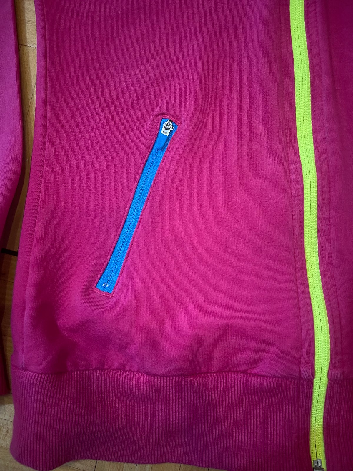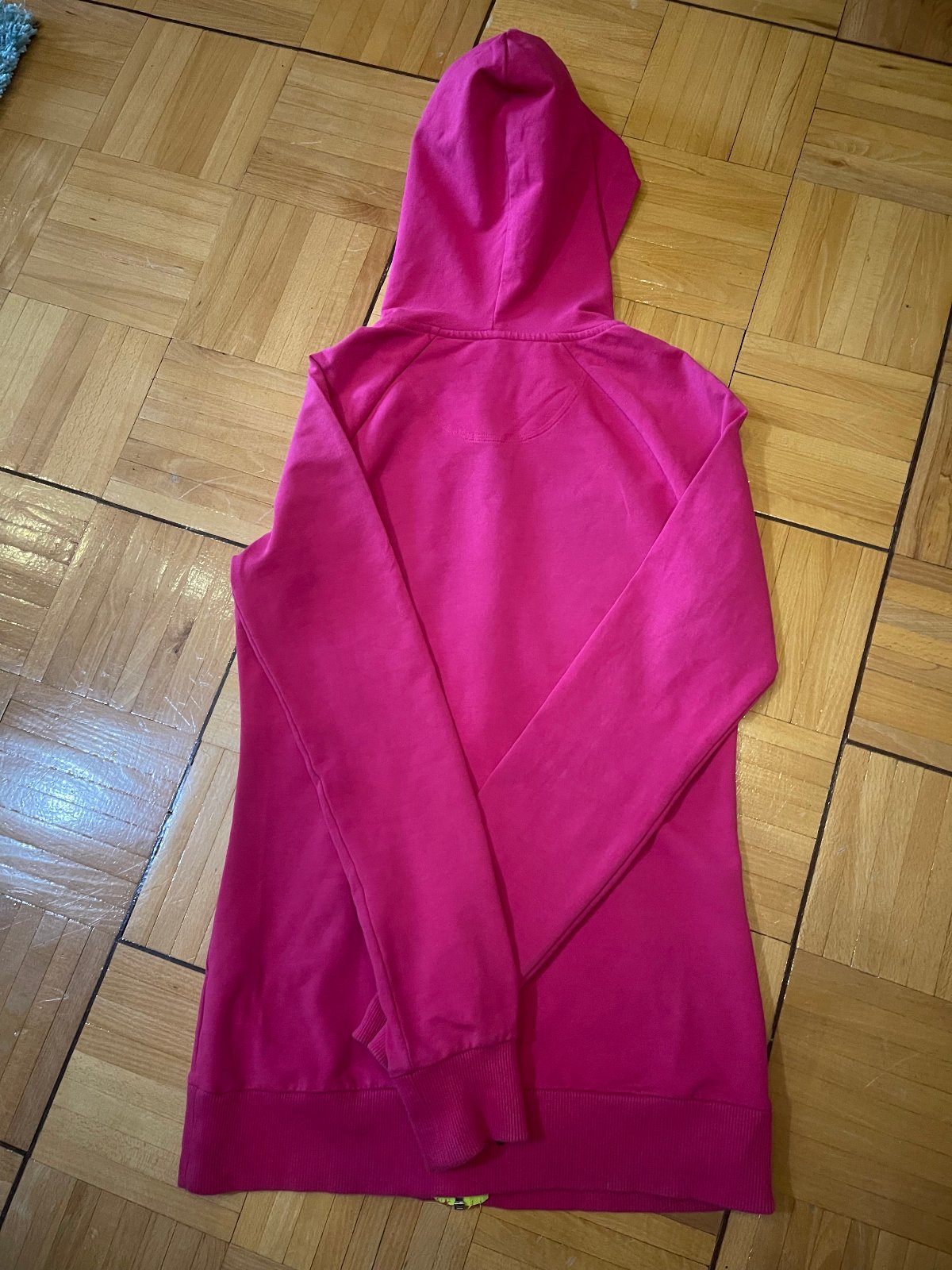 Predám predlženú ružovú mikinu s kapucňou vo veľkosti S, zboku dve vrecká. Materiál je trochu elastický, dĺžka v nenatiahnutom stave od kapucne 69 cm.