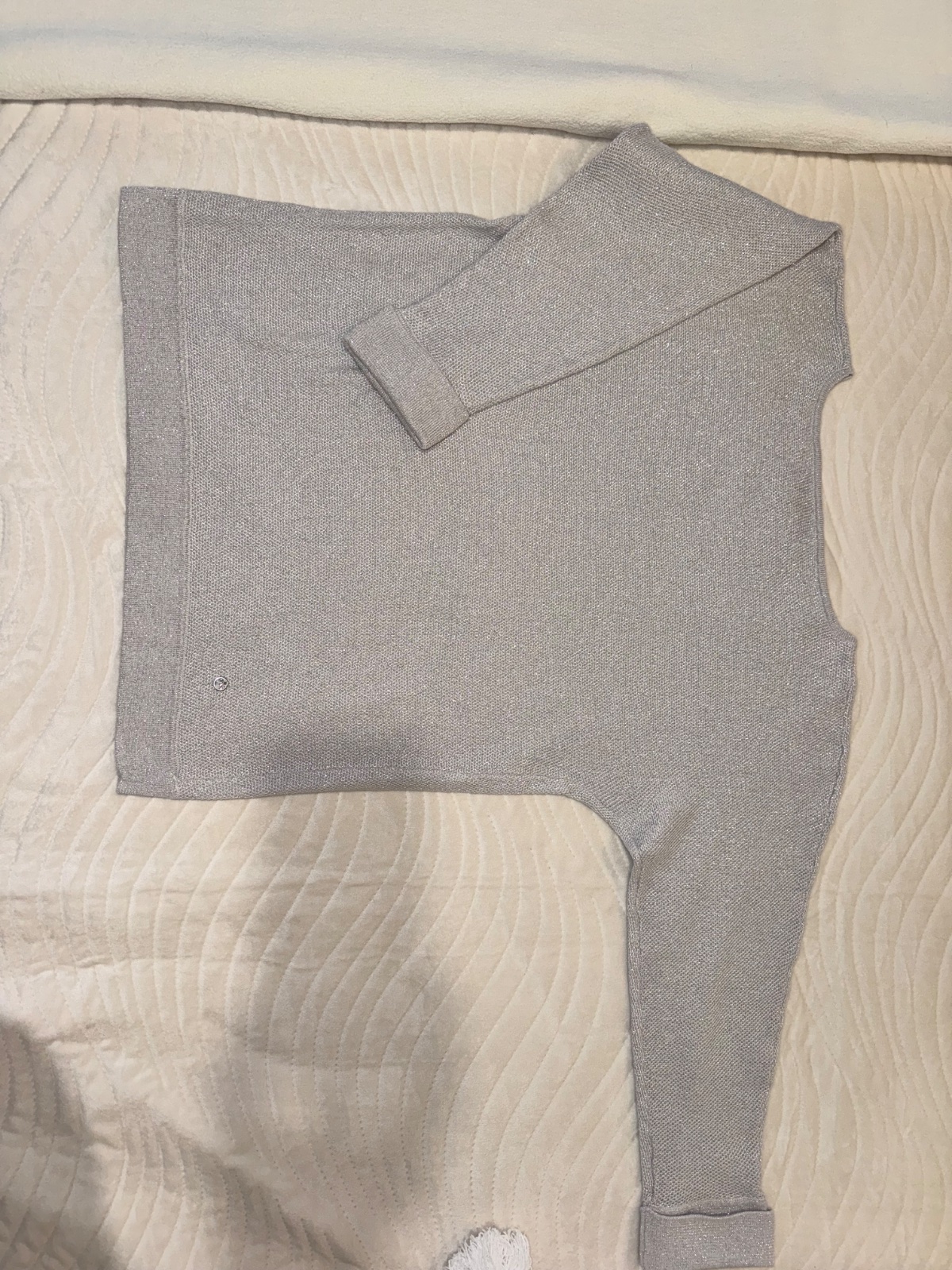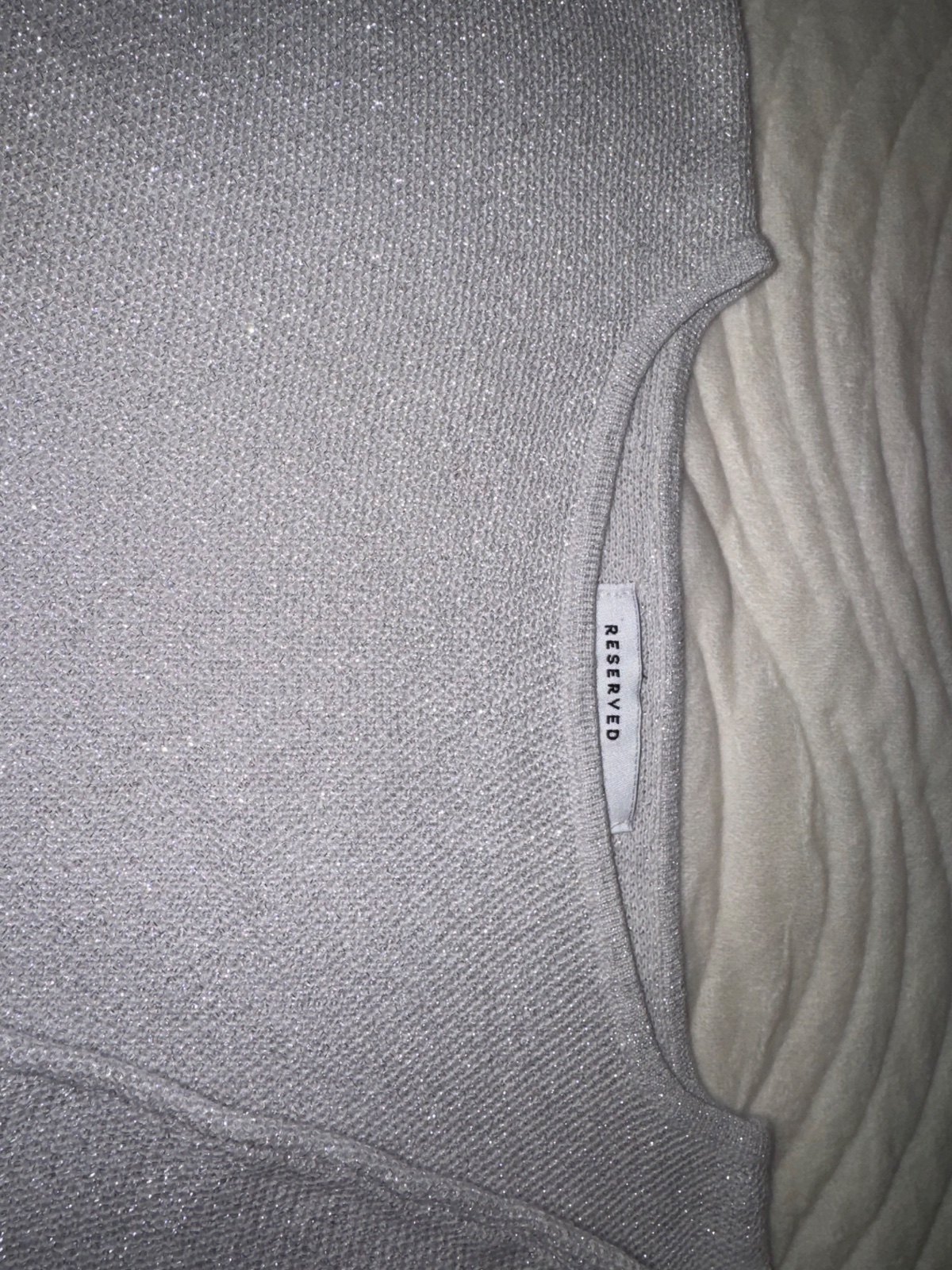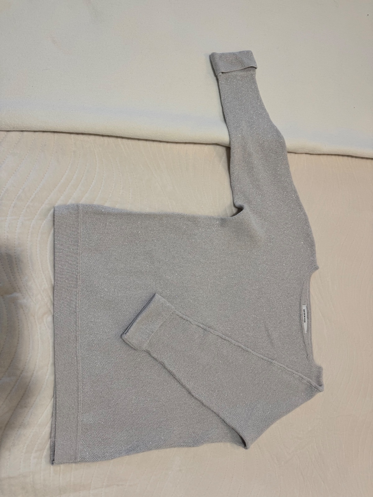 Dámsky pulóver s 1/3 rukávmi značky Reserved, veľkosť S, popretkávaný striebornou niťou, materiál: 70% bavlna, 30% metalizované vlákno Rozmery: šírka medzi pazuchami - 48 cm, dĺžka rukáva od krku ...