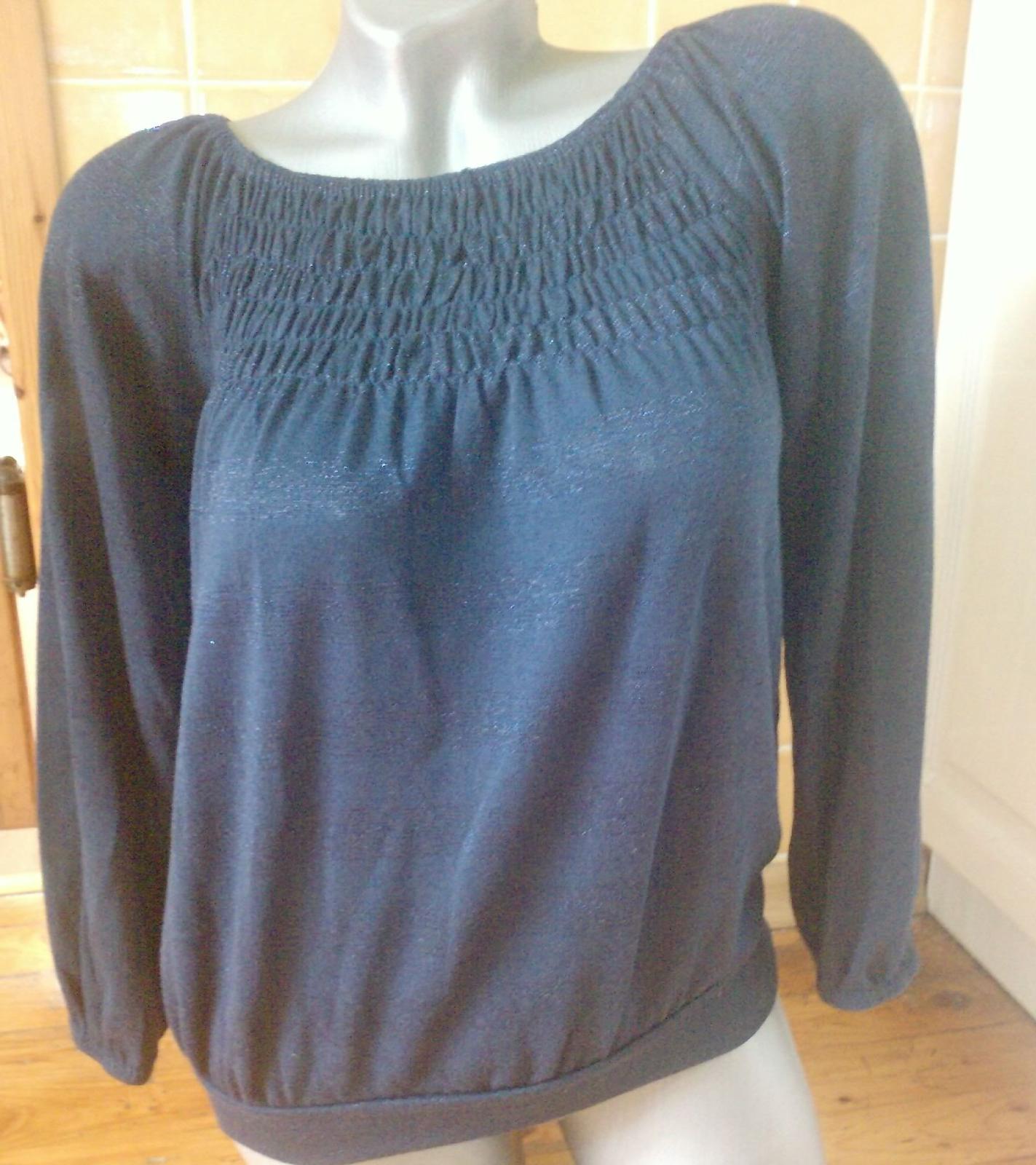 Pulover, tensi v tmavej modrej farbe, je mierne trblietavy