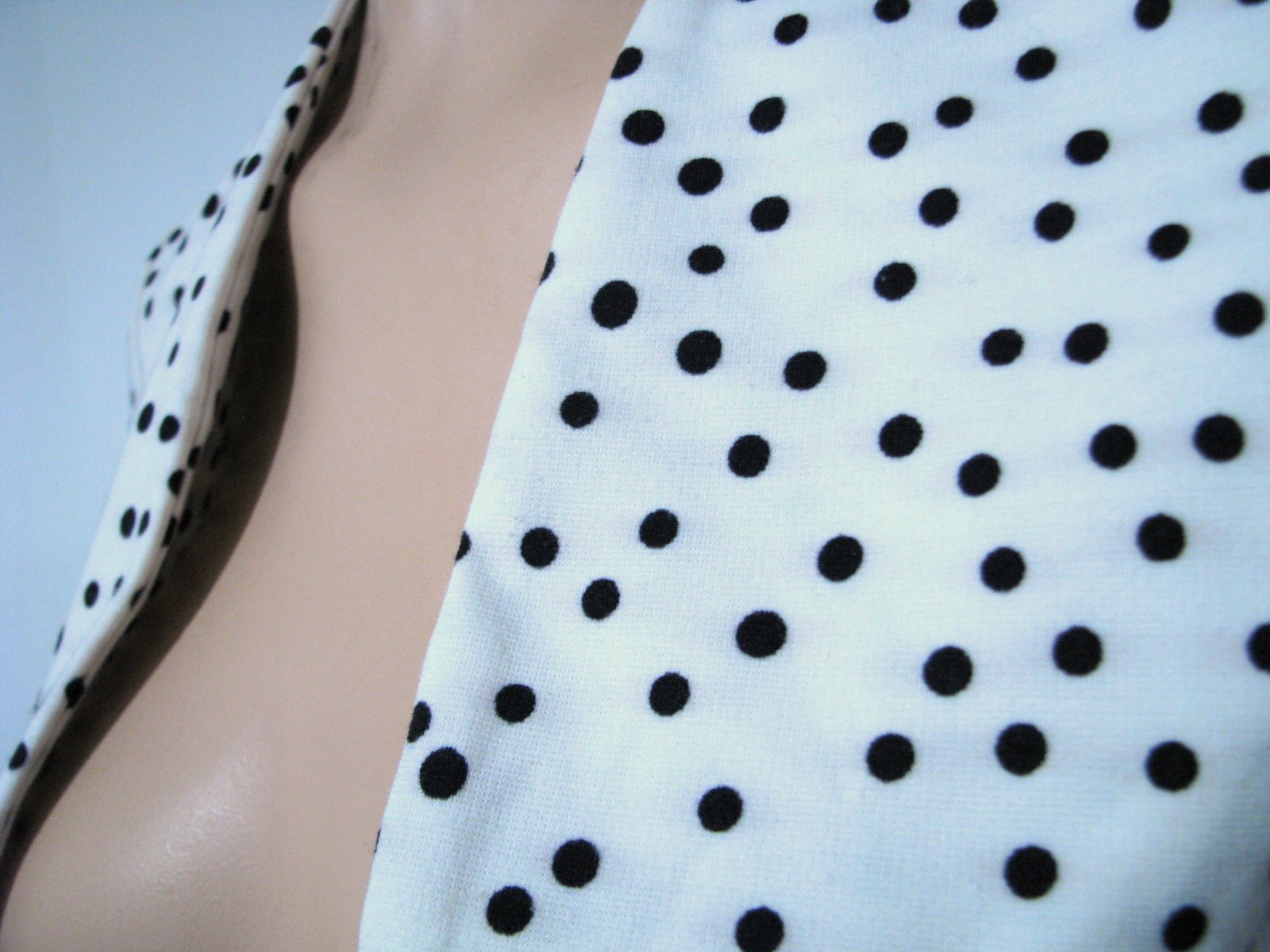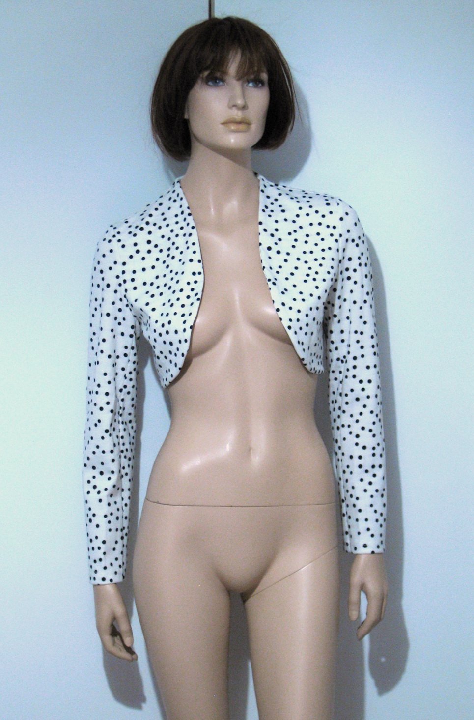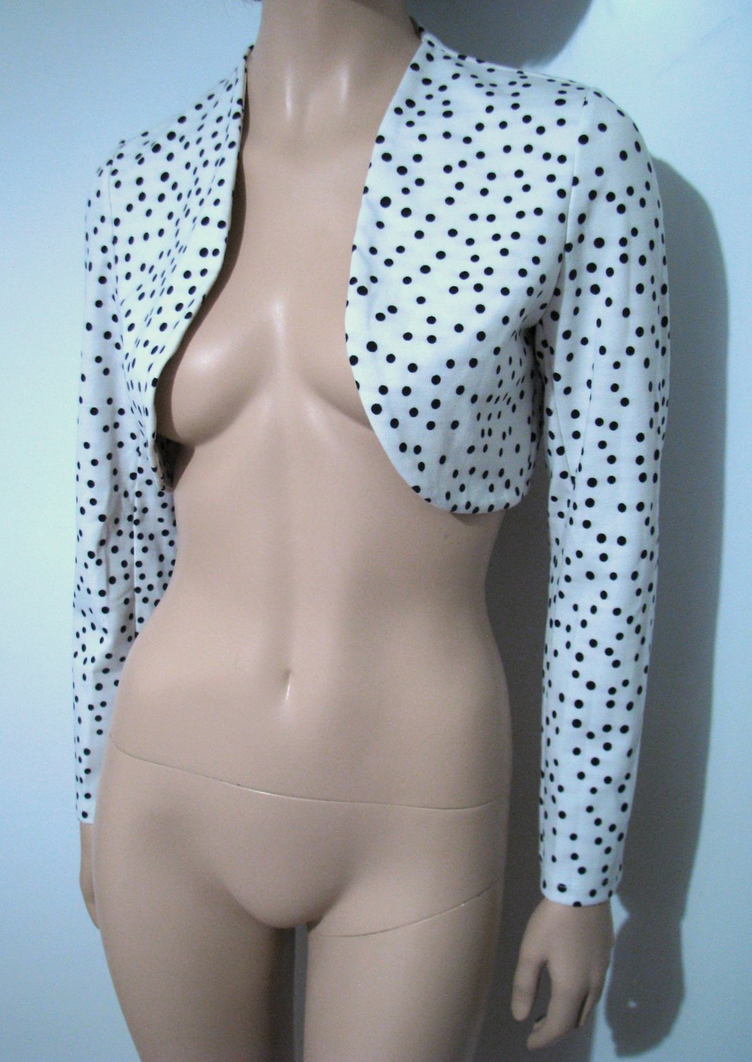 Krásne bolerko s dlhými rukávmi, s hravými nepravidelnými čiernymi bodkami na bielom podklade. Materiál je pevnejší úplet. Výborne zachovalé, bez poškodení. Veľkosť odhadom L, no malo by sadnúť aj na M či XL. V prípade záujmu premeriam.