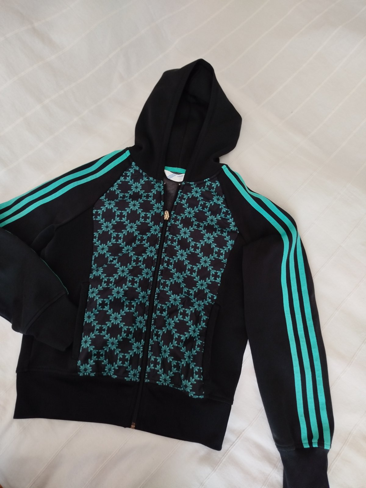 Mikina v top stave, tyrkysové detaily, do pása, vpredu iný šuštiak.