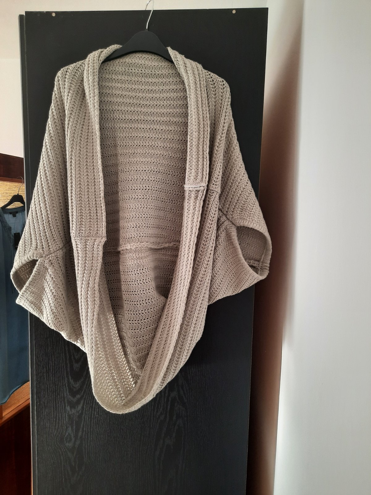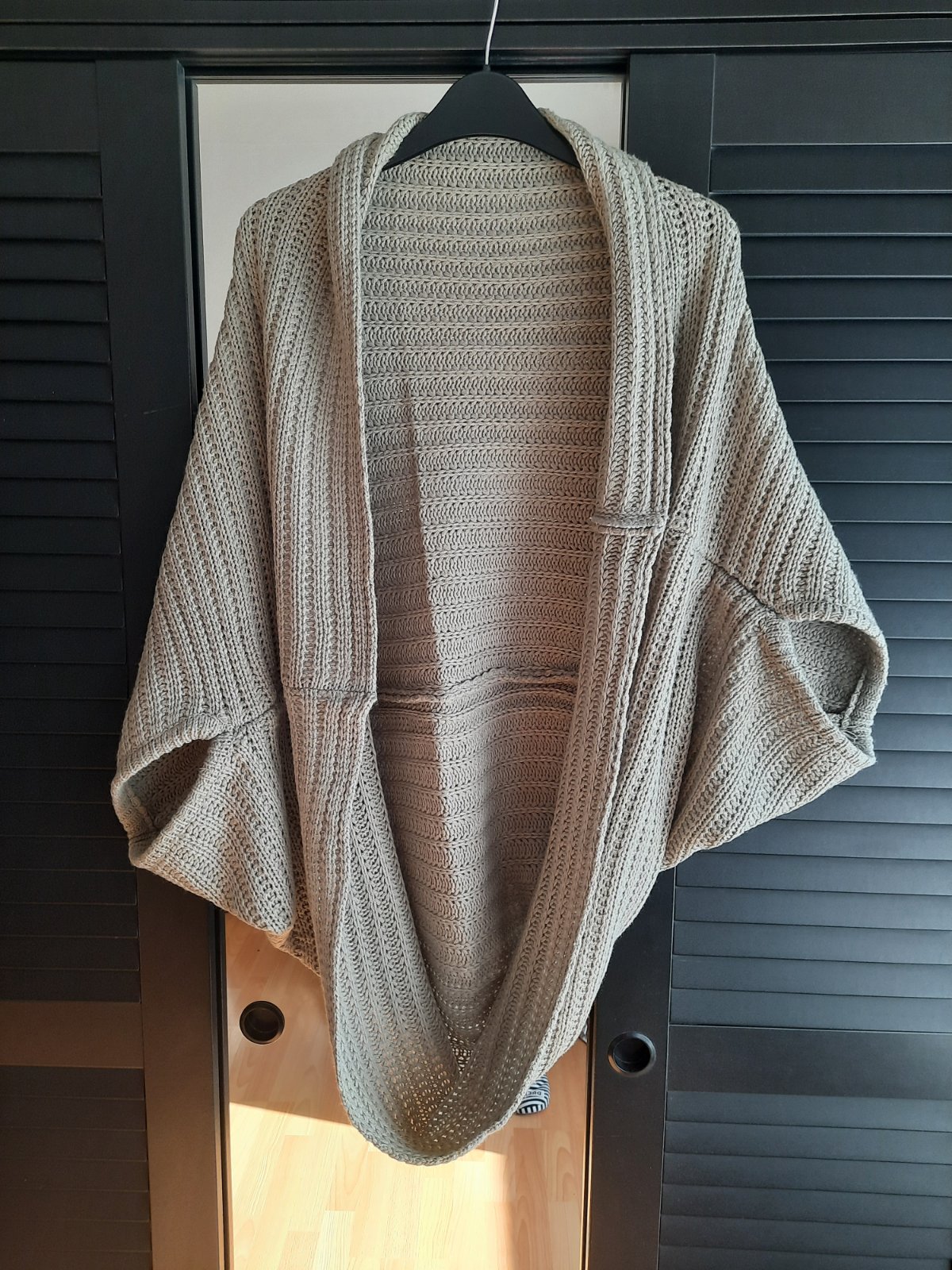 Predám veľmi pekný kardigan v top stave- asi 2x oblečený. Má zvláštny strih- na 1.pohľad ani nevyzerá ako kardigán. Na boku sú 2 otvory na rukávy, ktoré sú 3/4.