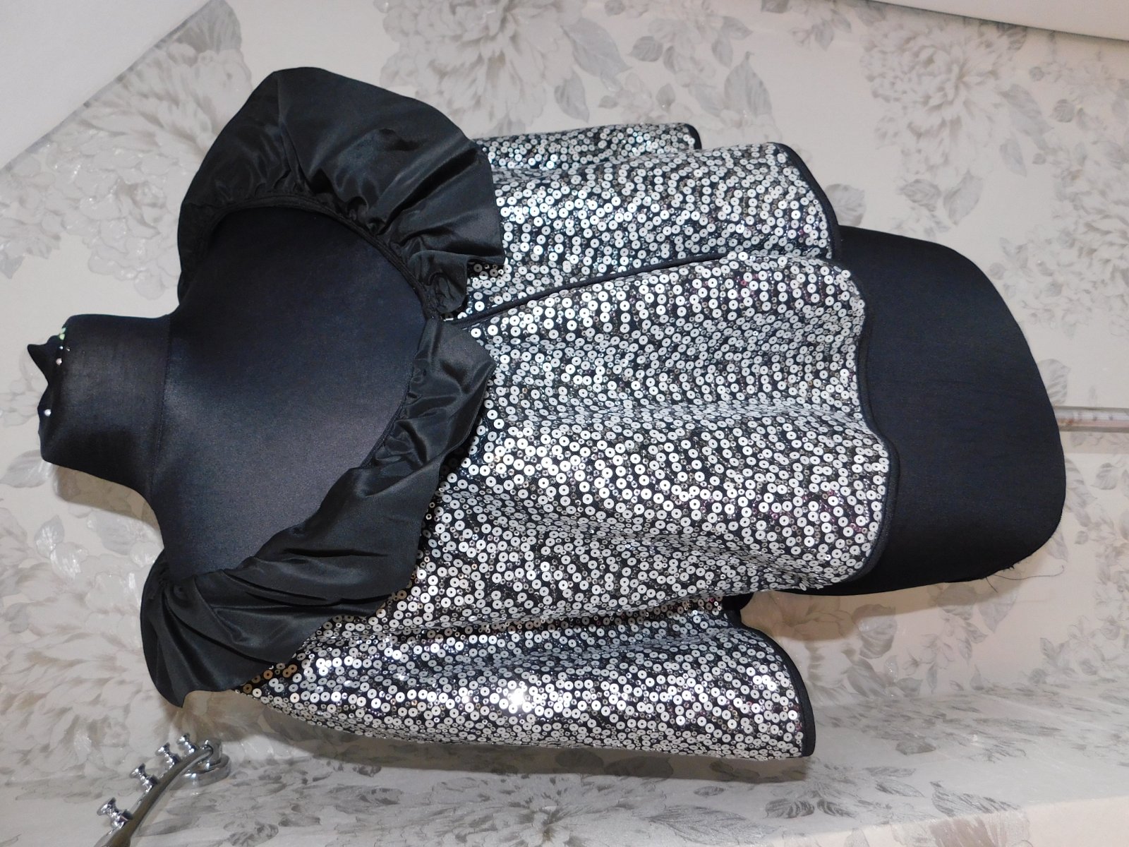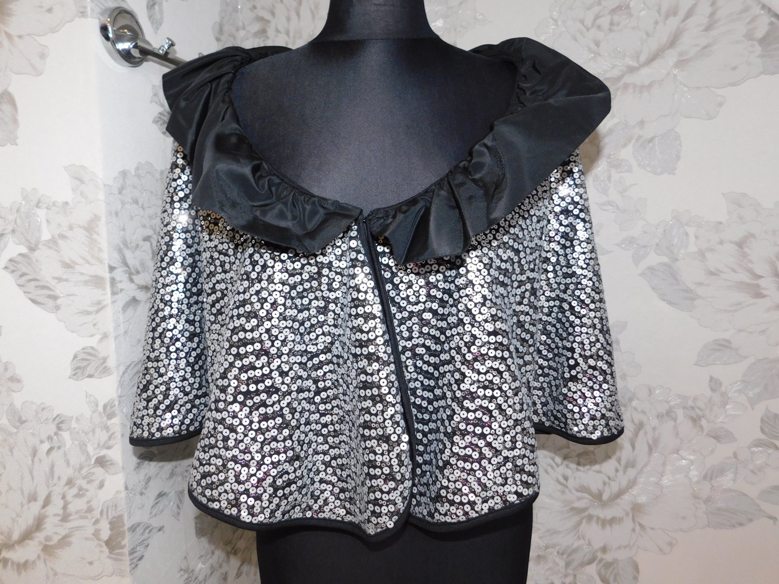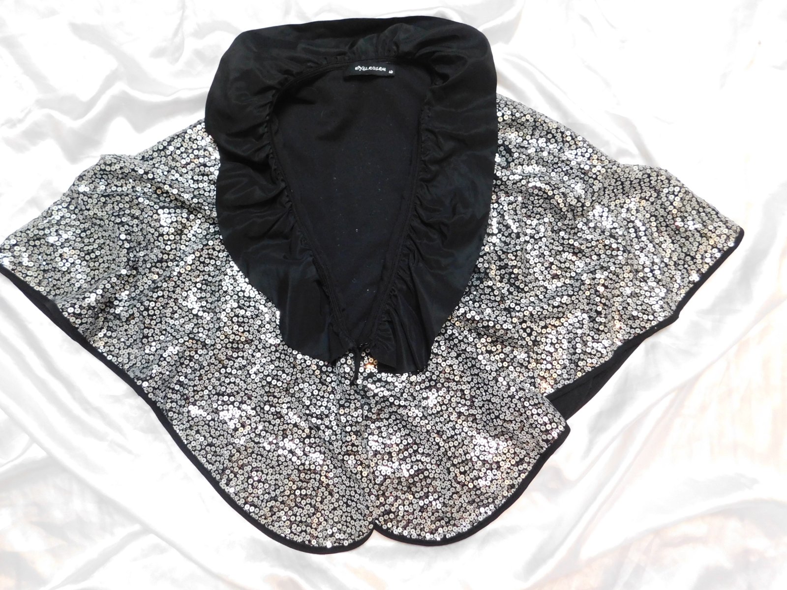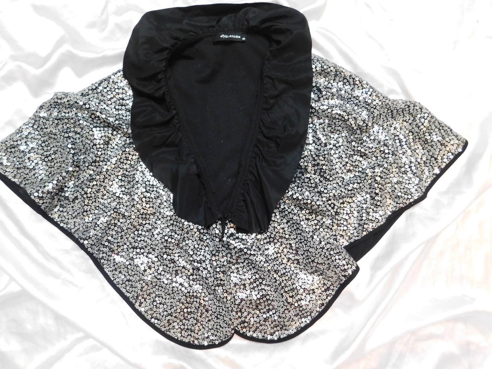 nenosené bolerko s visačkou, veľkosť 40/42, šírka pod pazuchou 53 v kľude, natiahne sa na 62, dĺžka 42, kamienky sú zo spodu žlté, tak hádžu aj strieborný, aj zlatý odlesk cena 2€ + poštovné