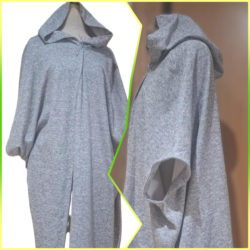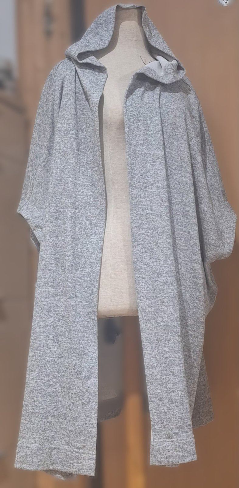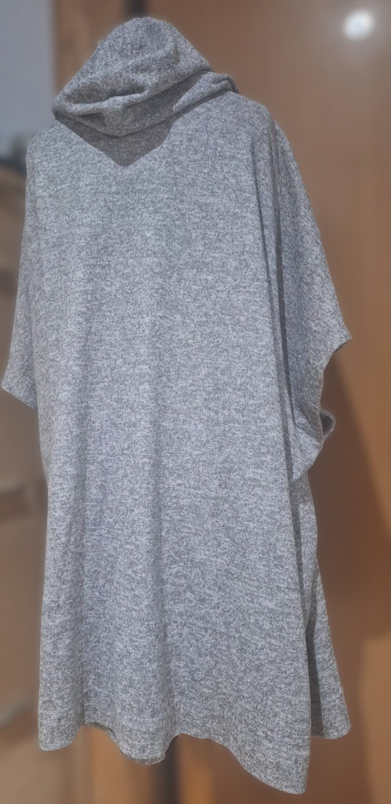 Pončo bolo nosené, no je bez poškodení. Materiál je pružný, melírovaný úplet s jemným vlasom, vo farbe sivobiela.