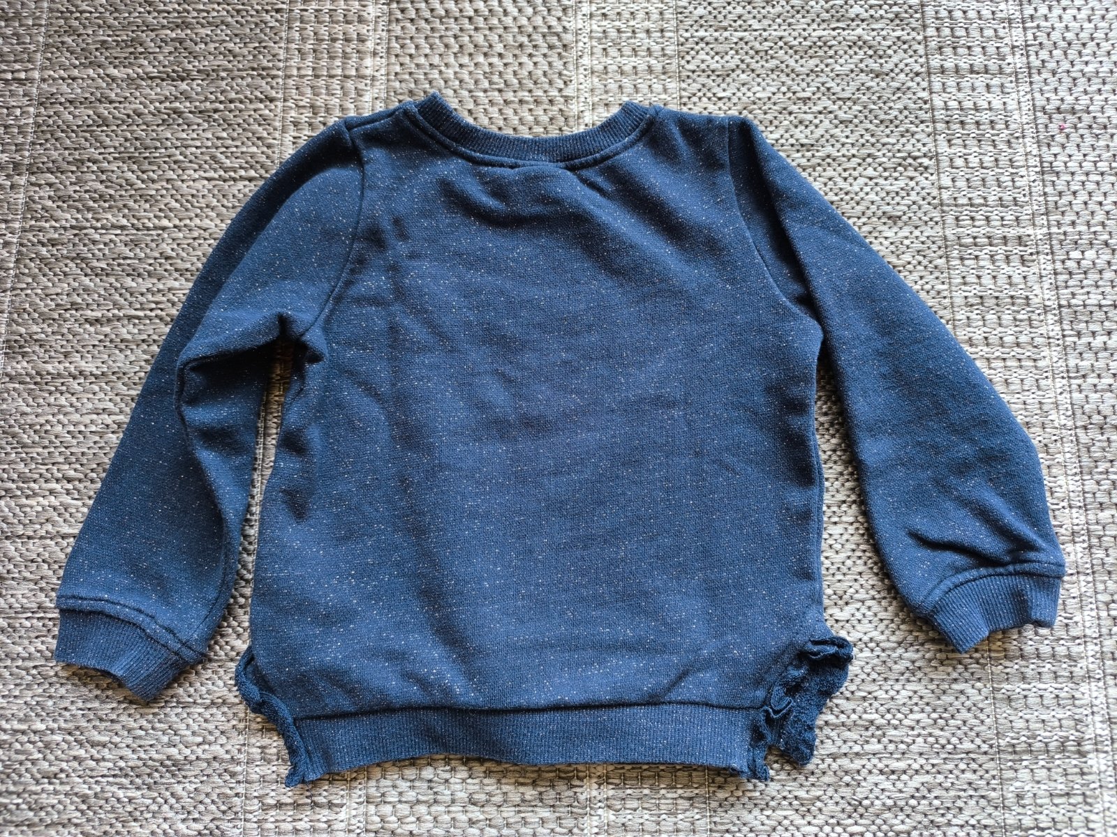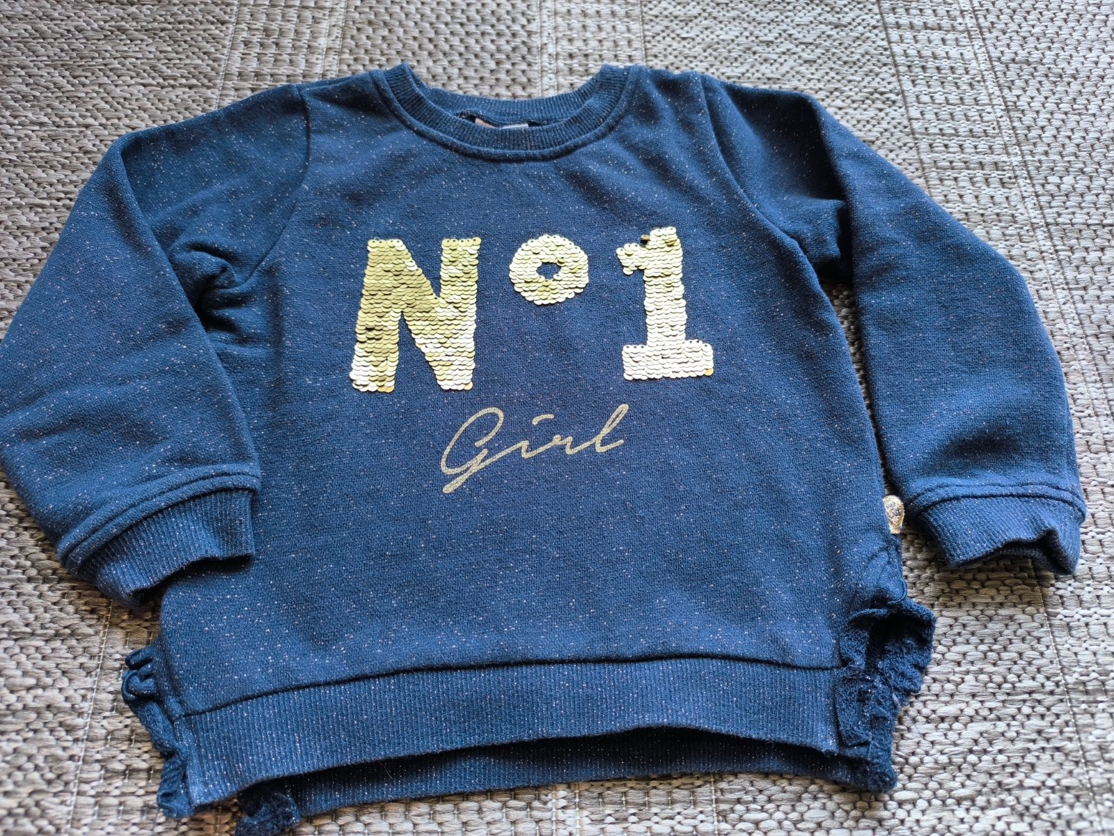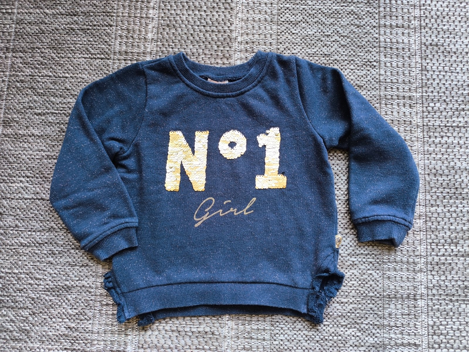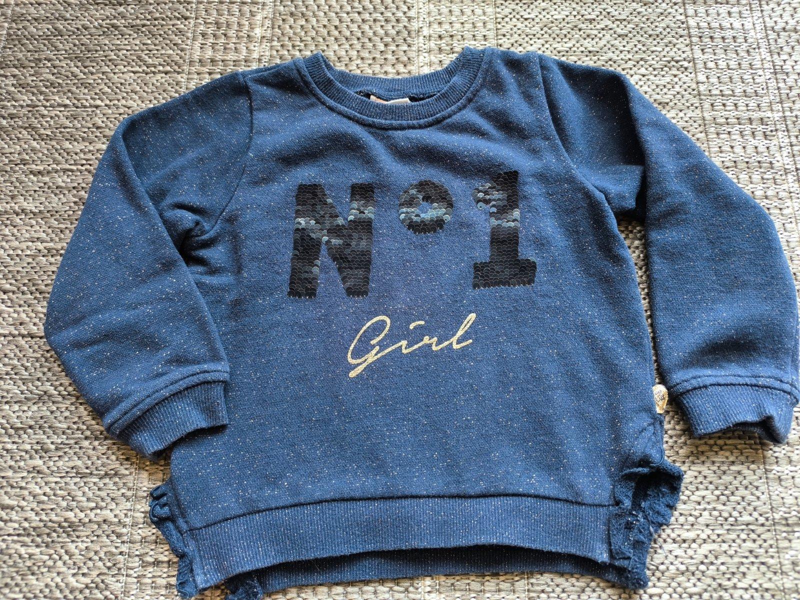 Trblietavá mikinka s meniacimi sa flitrami (zlaté/tmavomodré). V super stave. Veľkosť 104. Dĺžka 37cm, šírka cez hrudník 34cm, rukáv od ramena 36cm.