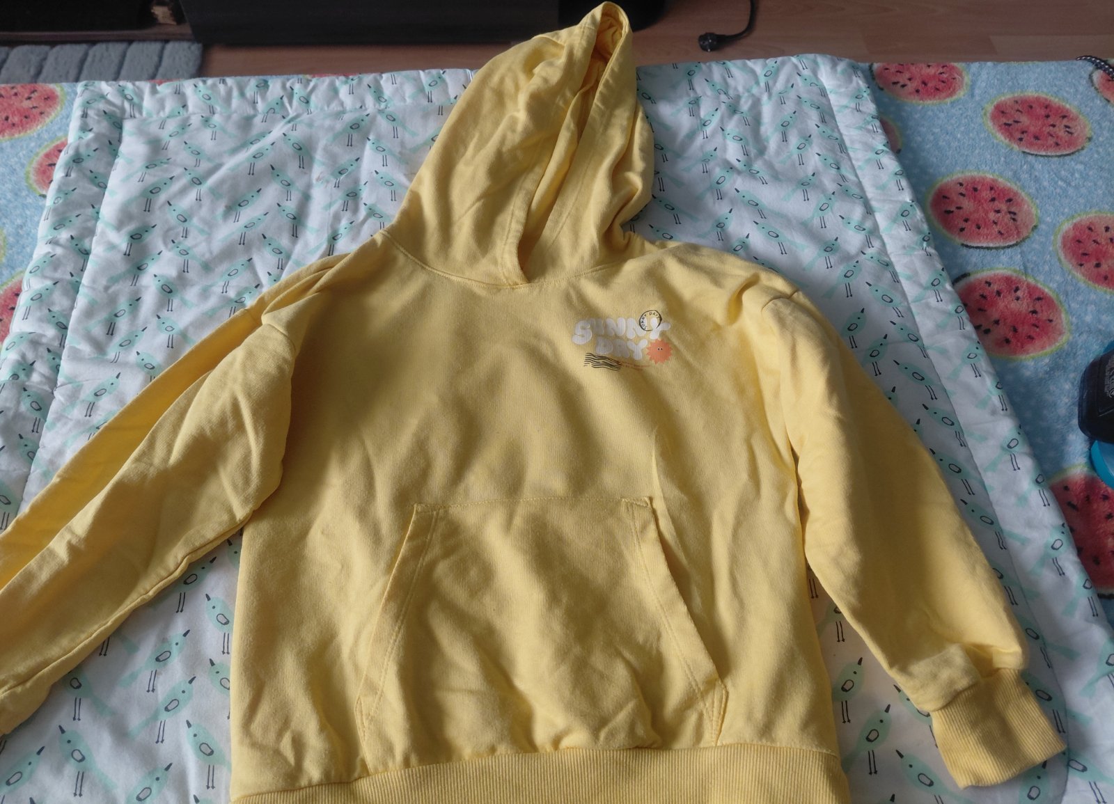 1x oblečená mikina, ťažšie sa oblieka cez hlavu. Zdá sa mi menšia
