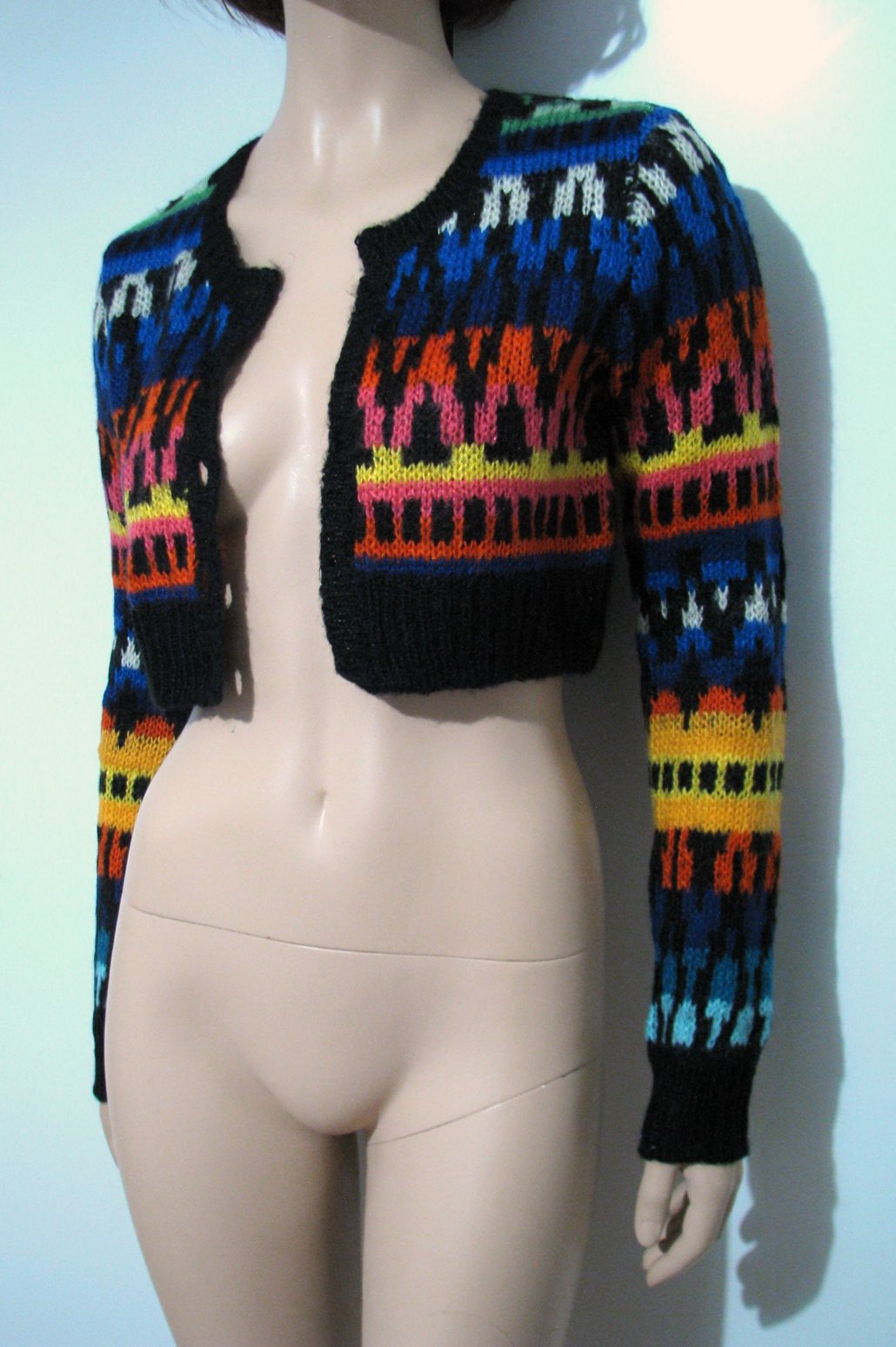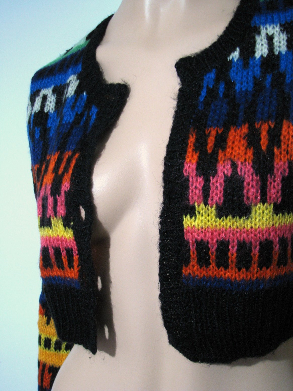 Krásny vzorovaný crop svetrík či bolerko, nádherné živé farby v kombinácii s čiernou. Je výborne zachovalý nemá poškodenia, len mu chýbajú gombíky, treba mu nejaké prišiť. Veľkosť uvádzam odhadom M, no myslím, že sadne aj na L, rozmery merané v kľude sú: šírka cez prsia 45 cm, dĺžka od pleca po spodok 43 cm, dĺžka rukáva od pleca cca 70 cm, dĺžka rukáva od podpazušia cca 51 cm.