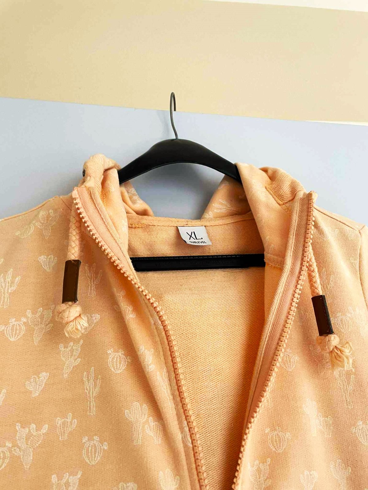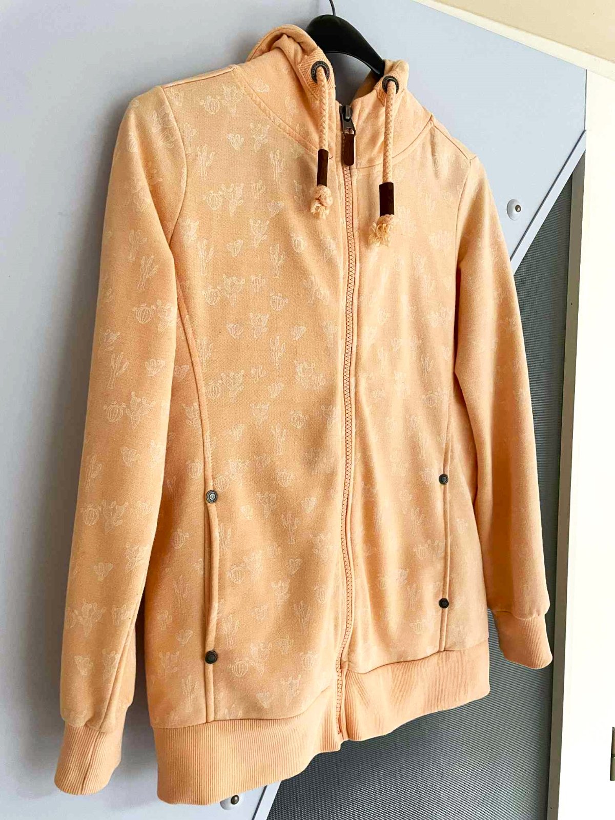 kvalitná min. nosená dlhšia mikina,s bočnými vreckami,pekne vytvarovaná,boky prešité,super sedí na postave,je v top stave,krásne detaily na kapucni a na hrubých šnúrkach okolo kapucne, šírka meraná pod pazuchou = 53 x 2 cm,dlžka meraná od pazuchy dole = 48 cm, celková dĺžka mikiny = 69 cm a rukáv = 64 cm,farba jemná marhuľkovo koralová,uvedená veľkosť je XL,ale je vhodná aj na L veľkosť, britská značka Sublevel