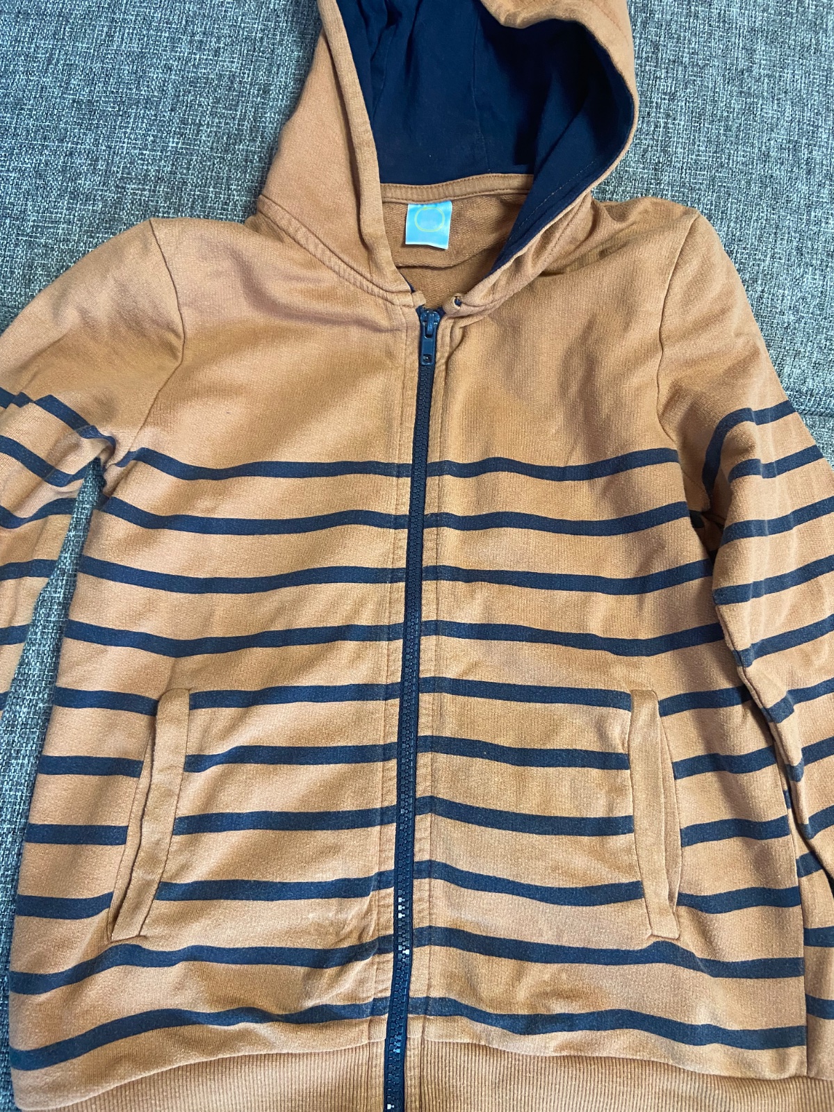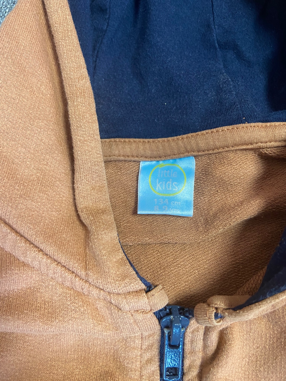 Mikina vo veľ.134,nosili sme na telesnú vých.,bez zateplenia.Farba niečo medzi hnedou a škoricovou.Bez poškodení.Rozmery-šírka v podpazuší:42cm,celková dĺžka:52cm a rukáv od krku 58cm
