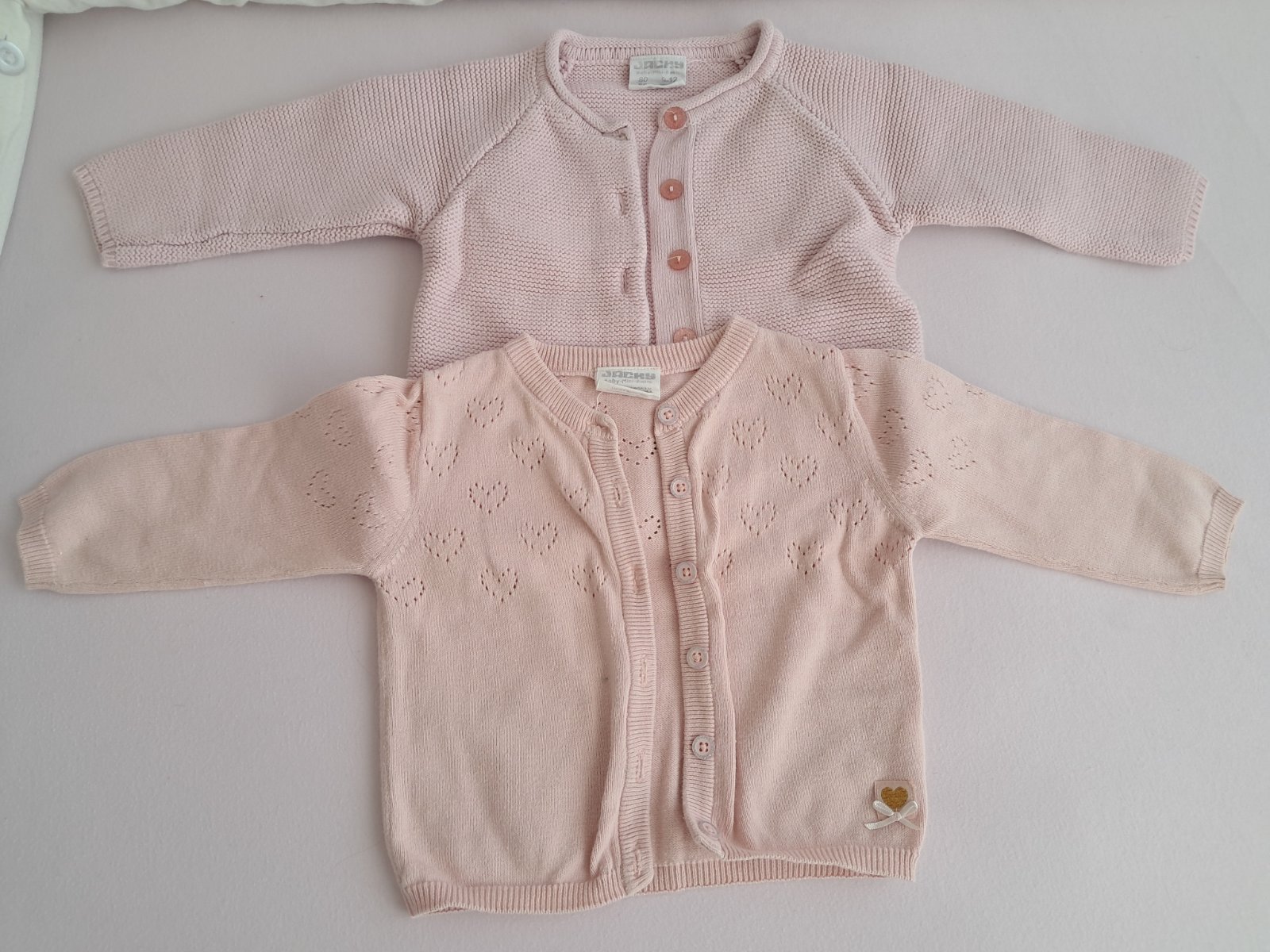 Ružový veľkosť 80, pod ním veľkosť 74 nosený ako 80. Oba kúpené v detskom obchode. Bez poškodenia.