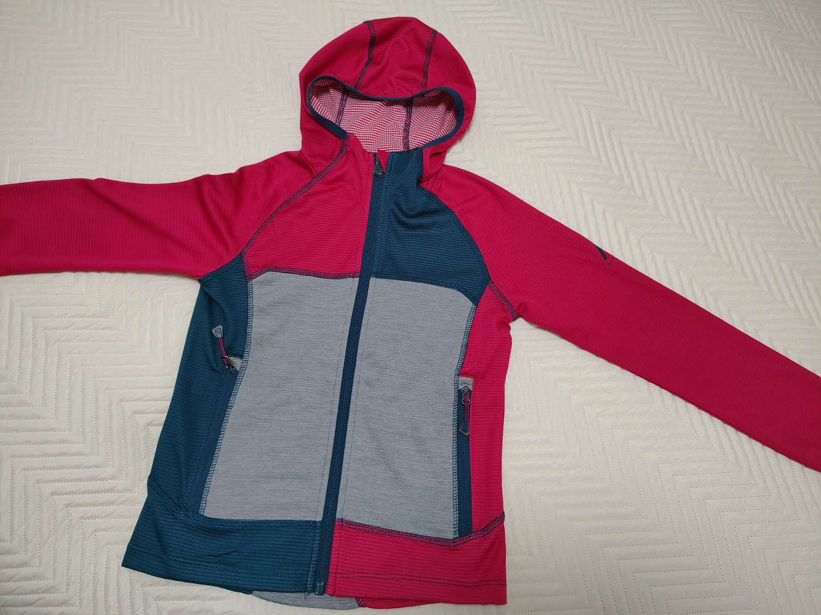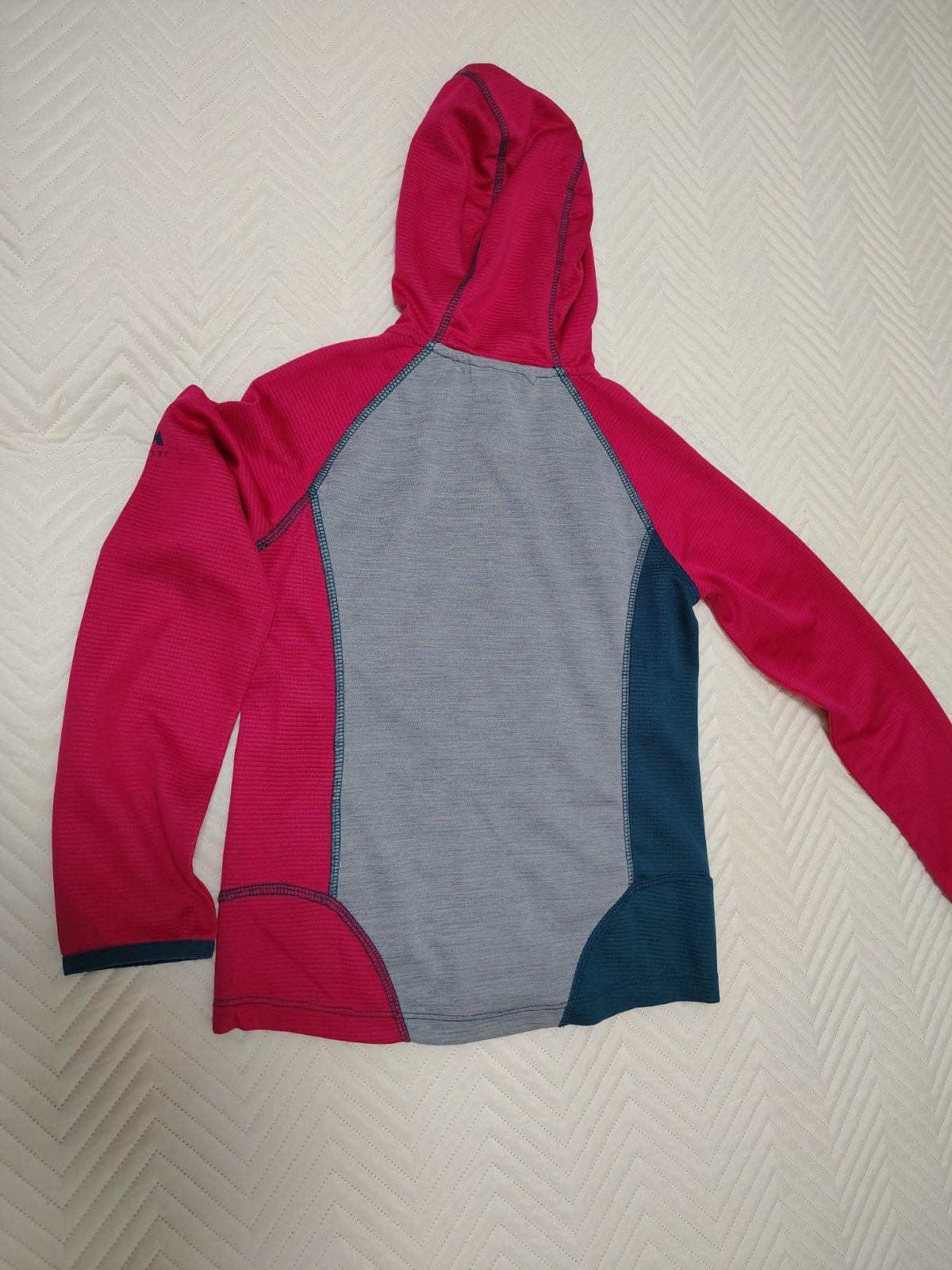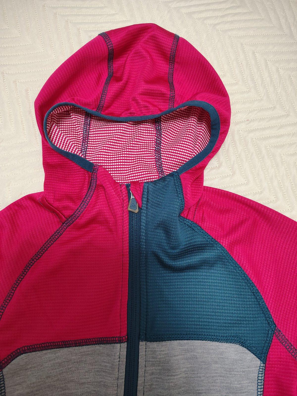 Tenká turistická funkčná mikinka. Pri fotení som si všimla mini dierku na rukáve, nad rukávom, inak je bez poškodení. Veľkostne sedí aj na 134.