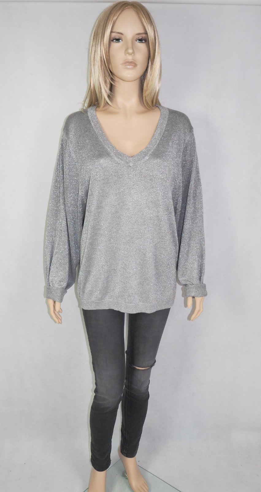 Kvalitný sivostrieborný pulover s véčkovým výstrihom, materiál akryl, super s tav.