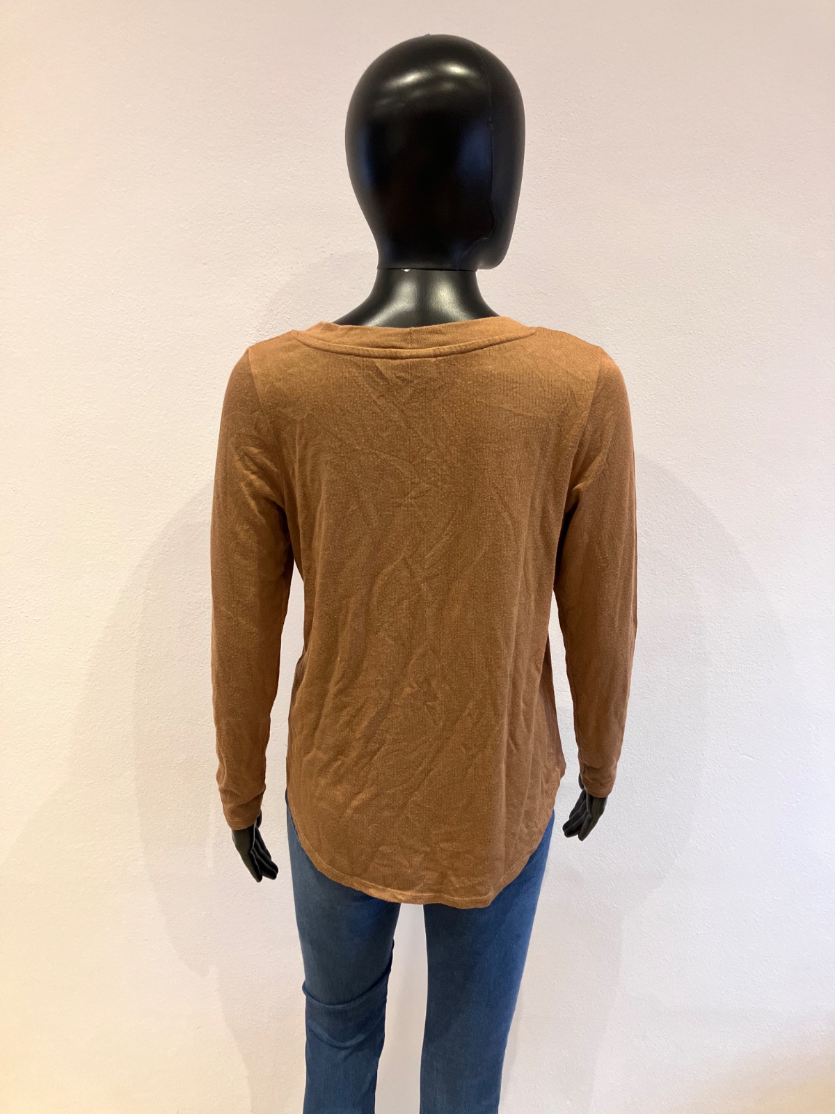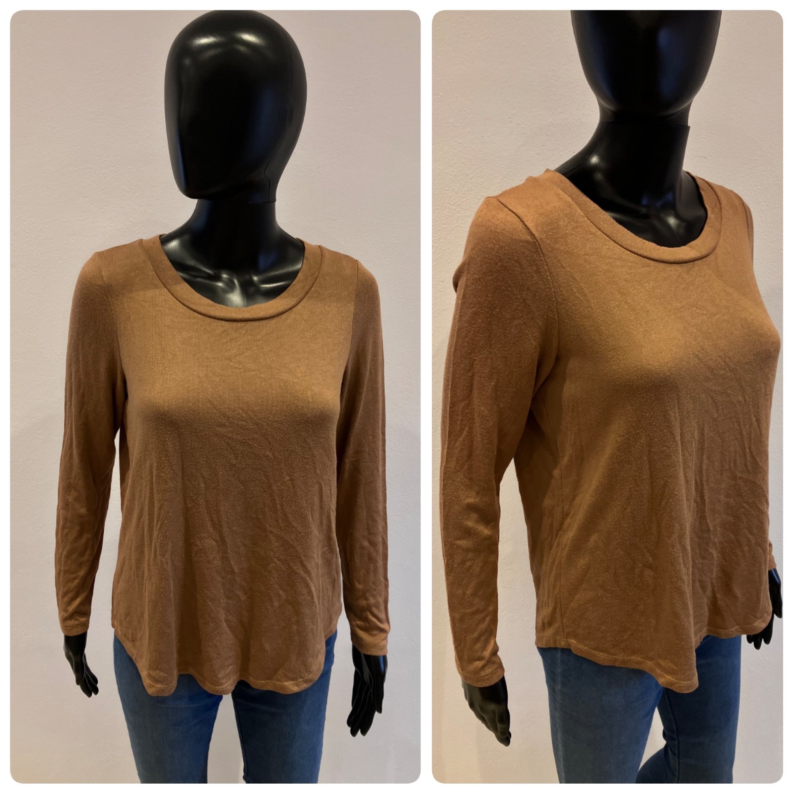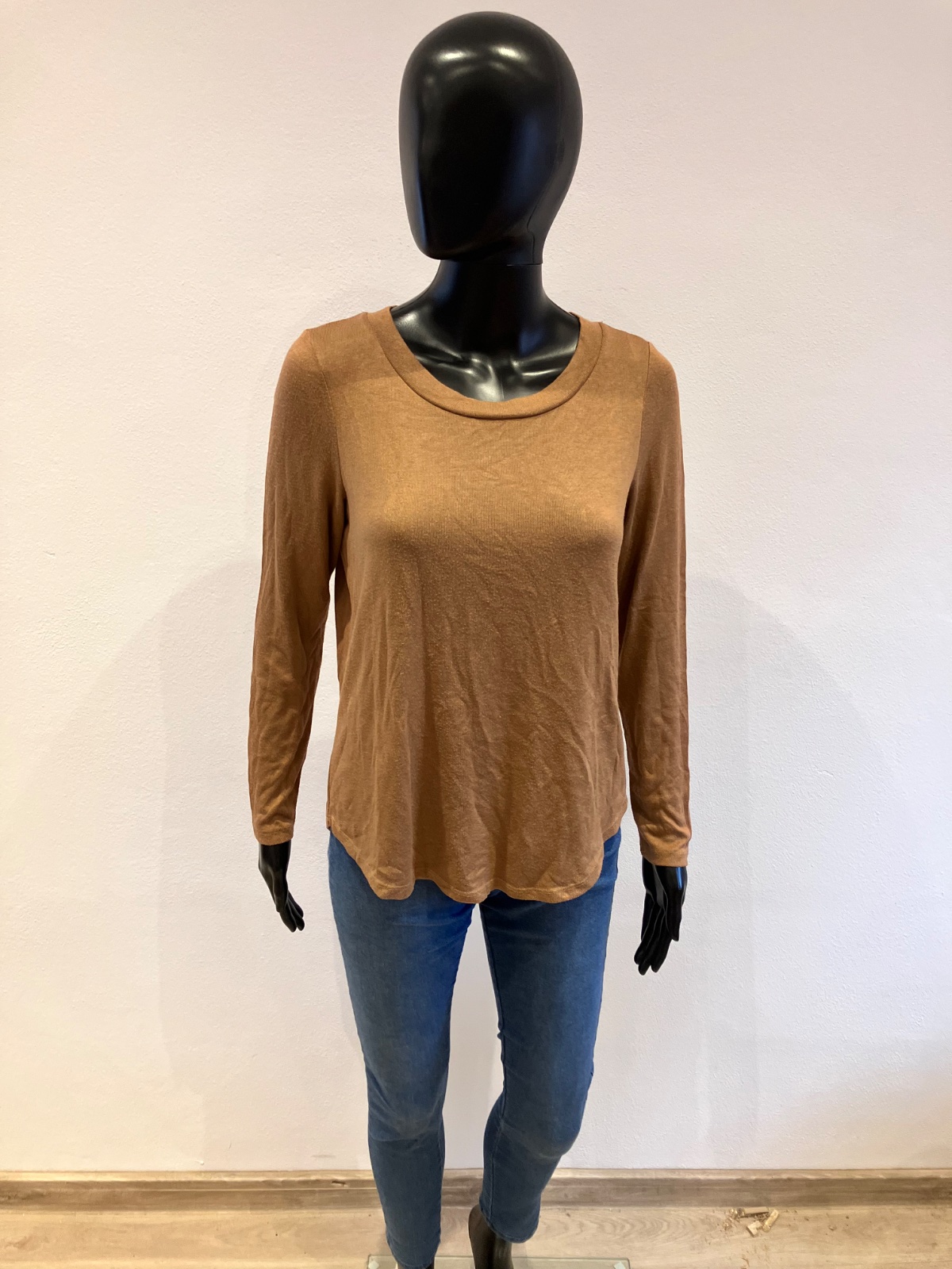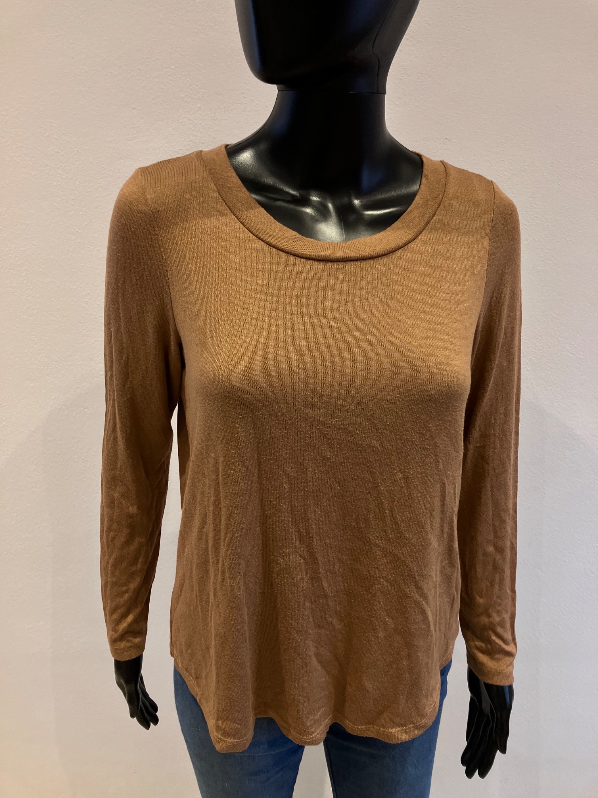Dámsky sveter, tenký, hnedý, okrúhly výstrih, elastický, materiál 80%viskóza 18%polyester 2%elastan.