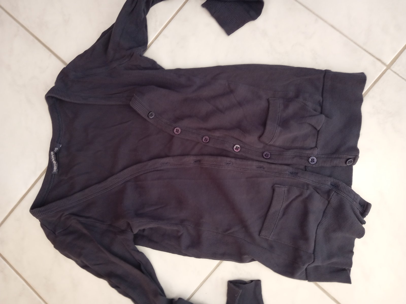 Pekny, tensi kardigan bez zapinania, pisu velkost M, ale je to skor L, mne je velky. Kupovany tu na MK.