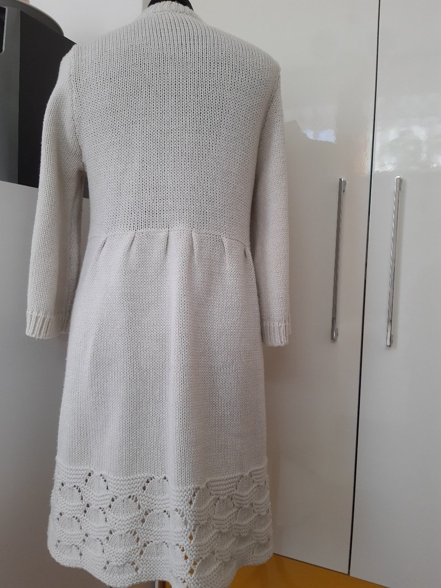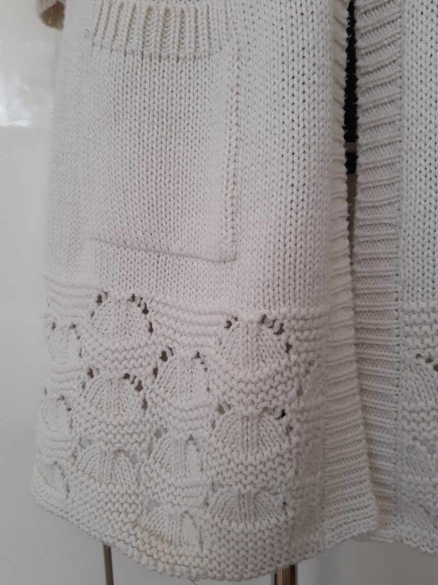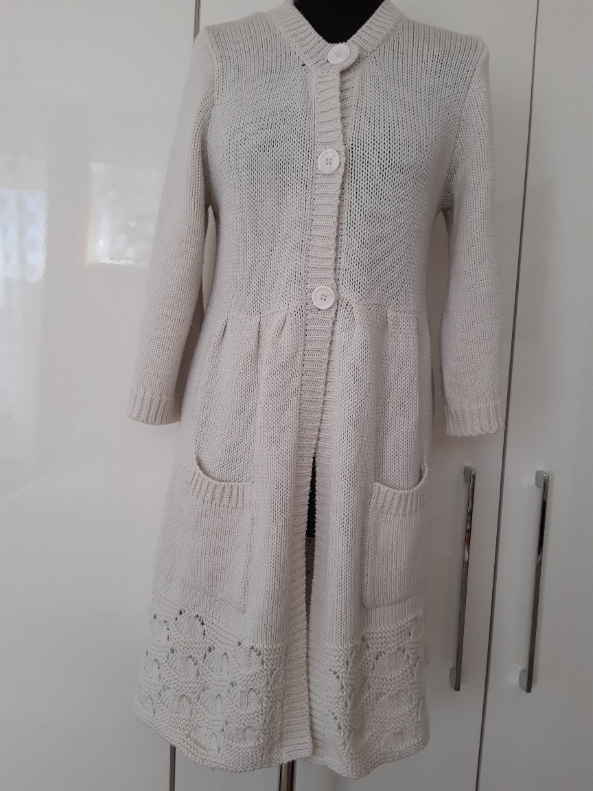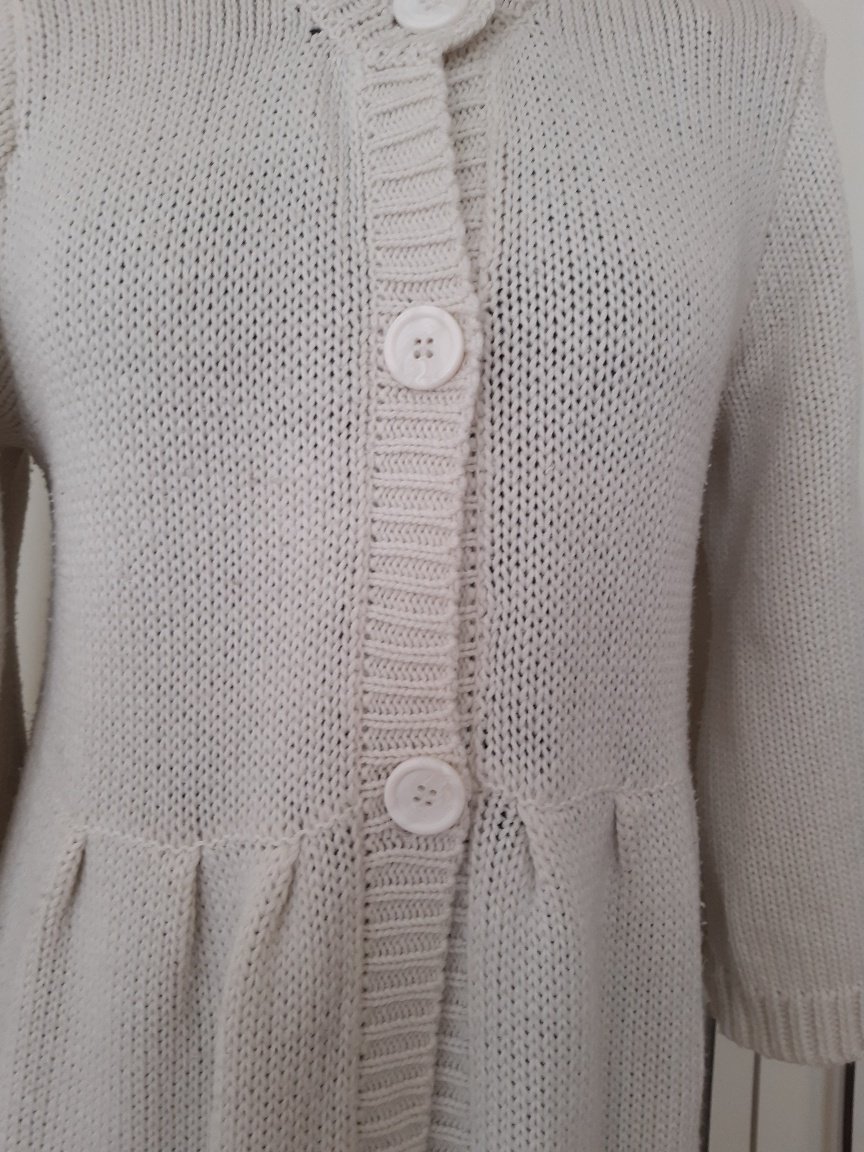 Je to prírodná biela, nie snehovo biela. Je to pletenina strednej hrúbky skôr hrubšia ako tenšia. Visačka o materiáli chýba, takže neviem, možno polyakryl. Dl. 91 cm, šírka cez prsia 46x2 cm, poddá sa , je to pletenina, pas 46x2 cm, dl. od pasu 52 cm. Kardigan je vo veľmi dobrom stave, bez poškodenia.