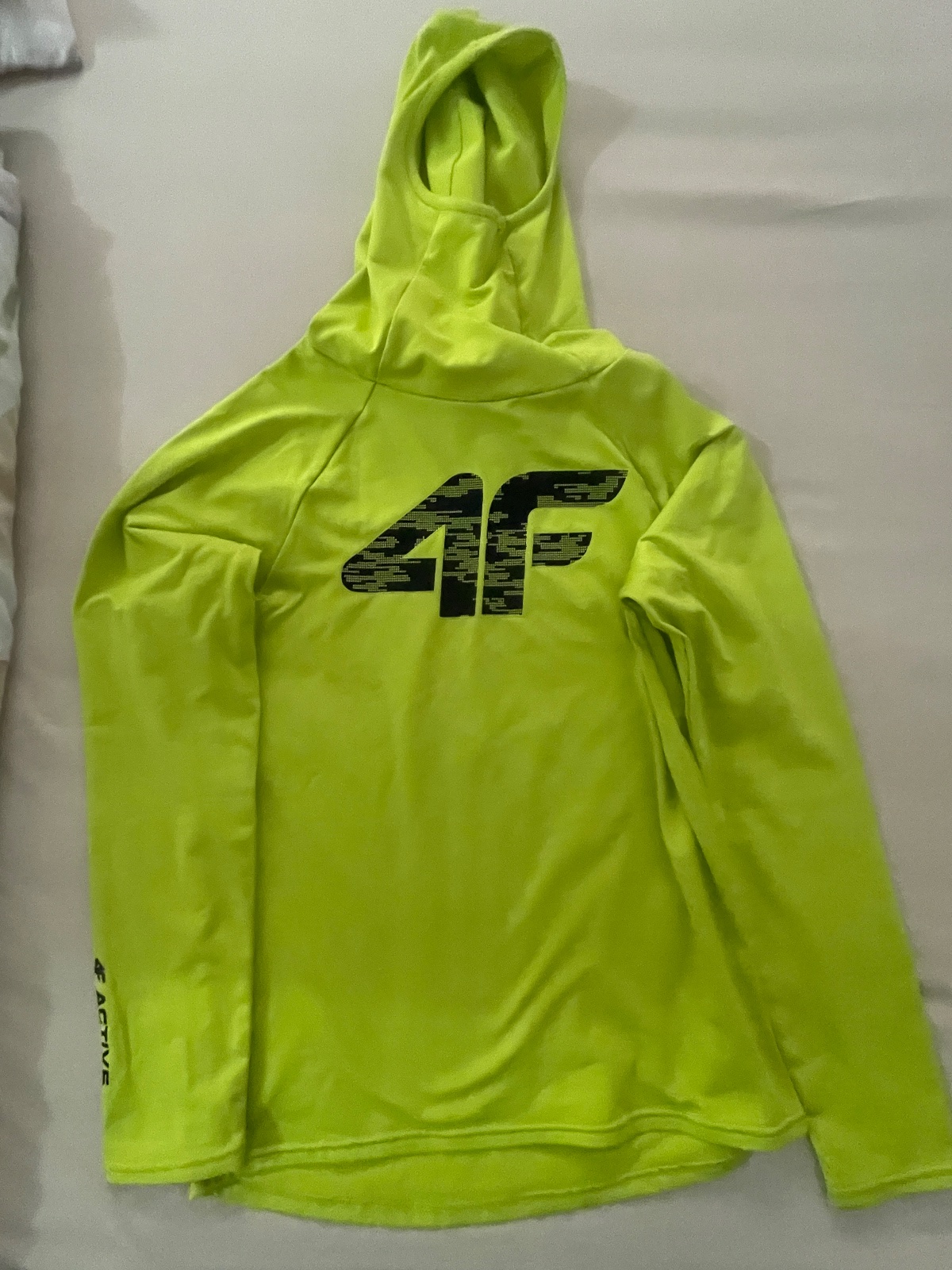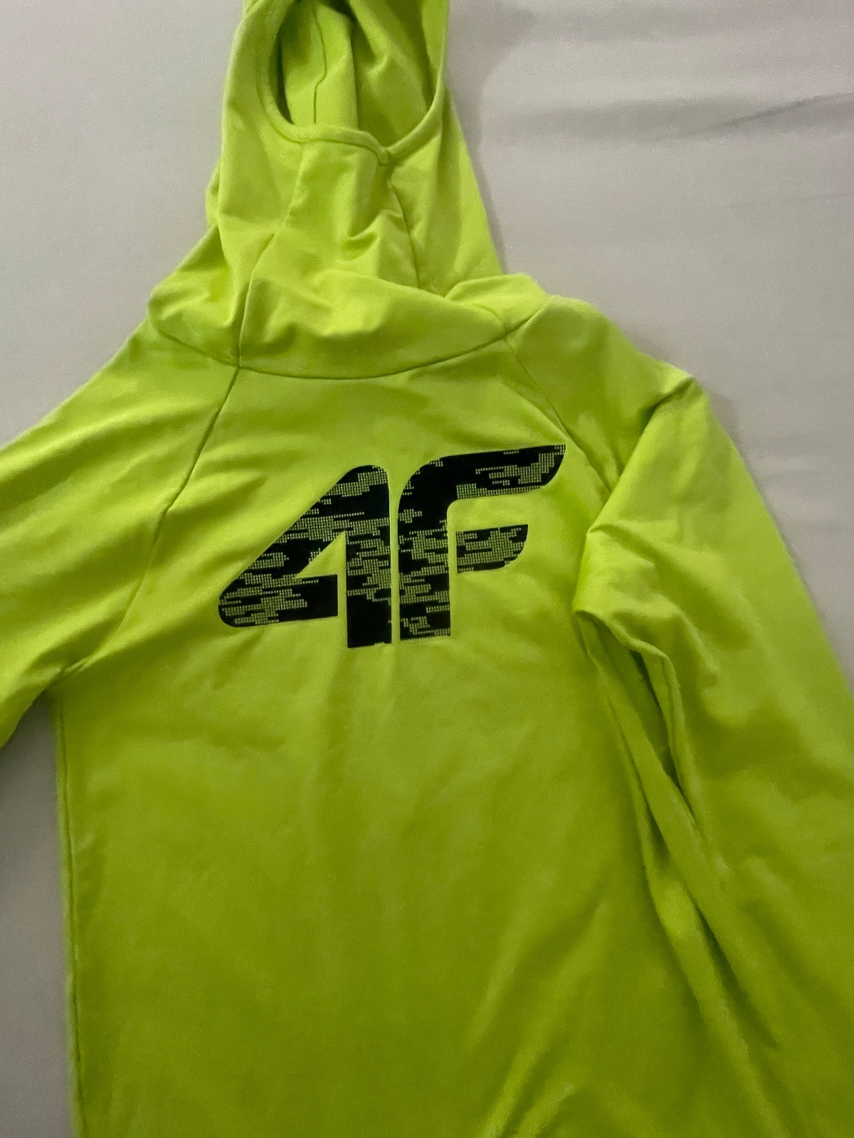 Je ako nova bez poskodeni. Bola nosena par krat v zime pod lyziarku bundu ako termo mikina, pod tymto mal syn este termo tricko. V popise 4F uvadza ze tato mikina v miernej zime nahradi termo tricka a v tuhsej zime ju mate nosit ako druhu vrstvu cize ako termo mikinu. Je lahka ale tepla a kvalitny material, dietatu to pot odvadza a neostane v mokrom. Kapucne je super pretoze Vam nahradi kukla kedze ta kapuca je ako kukla spraven cize fajn aj na von miesto ciapku a vyhrnie sa aj na usta ked fuci alebo je super pod lyziarsku prilbu. Farba neonovo zelena, material sa telu prisposobi.