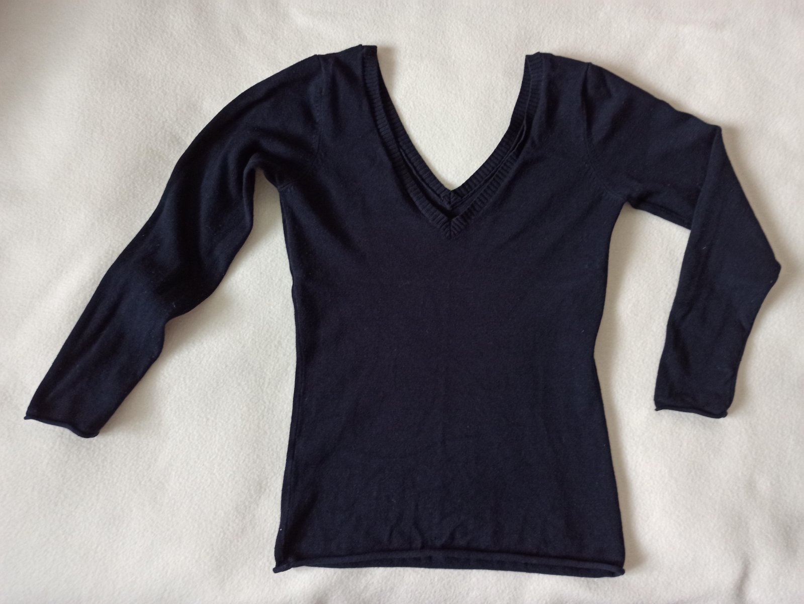 Tmavomodrá farba, väčší výstrih aj vzadu, tenký pulóvrik na telo, veľkosť písaná M ale sedí skôr na XS/S, rozmery na foto, trochu sa natiahne, rukáv nie je úplne dlhý