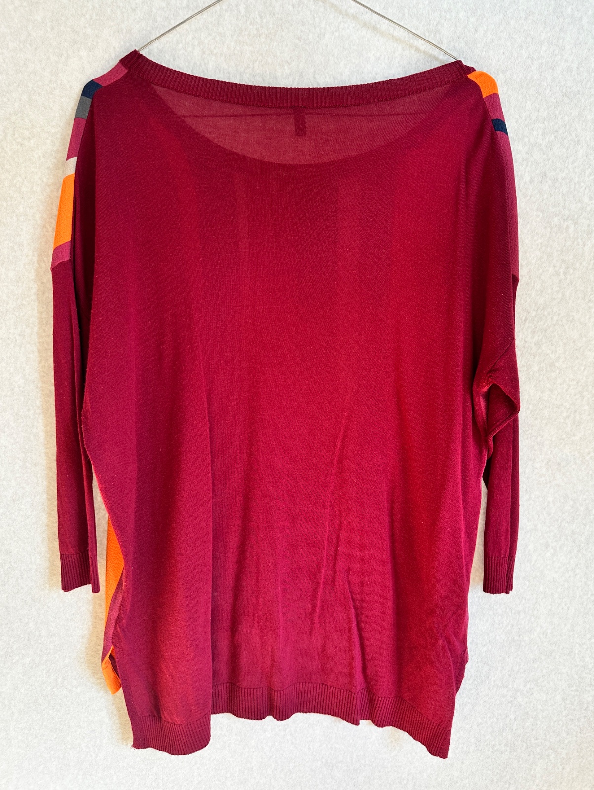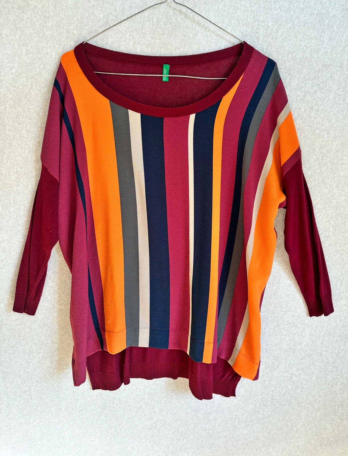 Výrazný tenší pulóver / top s vertikálnymi farebnými pásmi. Ležérny širší strih, 3/4 rukávy, zadný diel je čistý z úpletového materiálu v bordovej farbe. V peknom stave, bez poškodení.