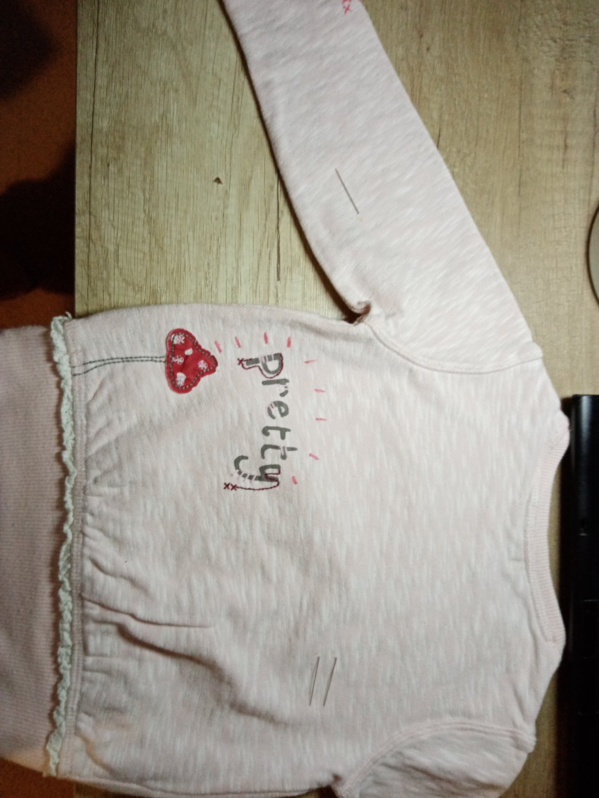 Mikina. Na zadnom dieli 2 malé fliačky veľkosti špendlíkovej hlavičky, tak isto aj na rukáve zozadu. Viď foto. Zohľadnené v cene.