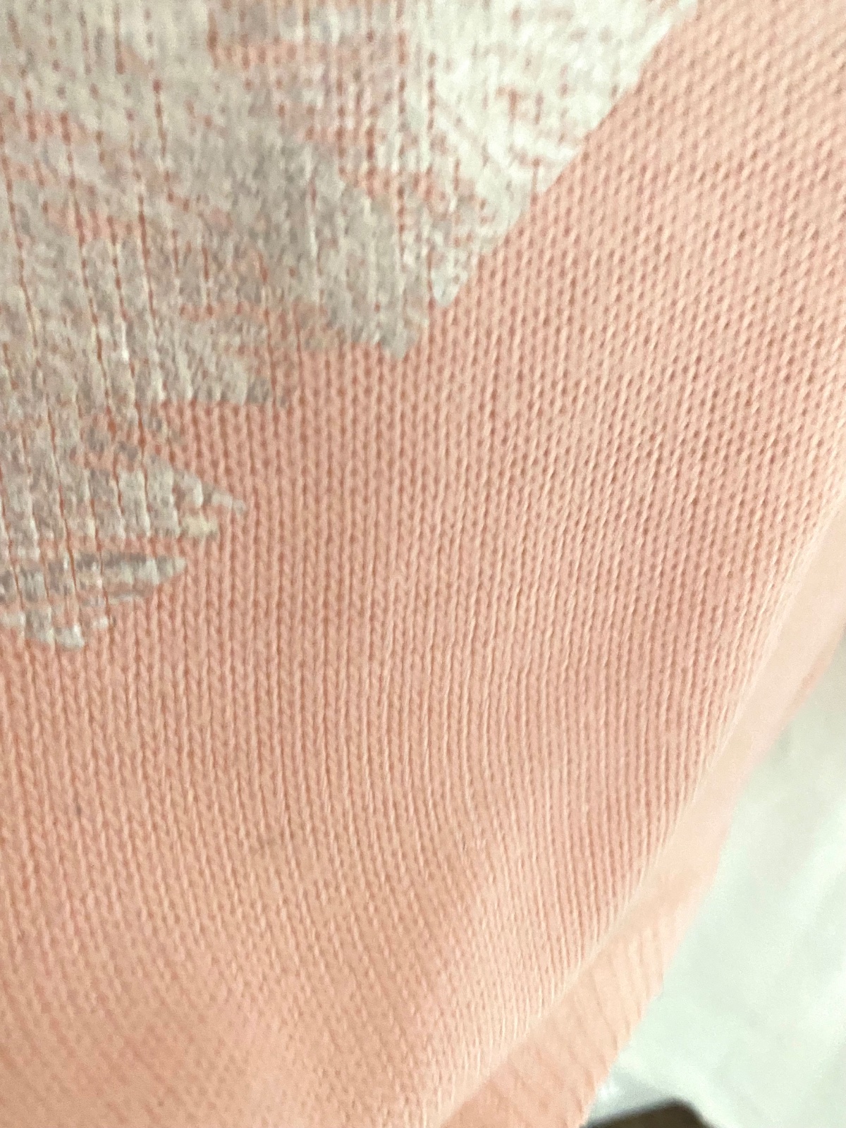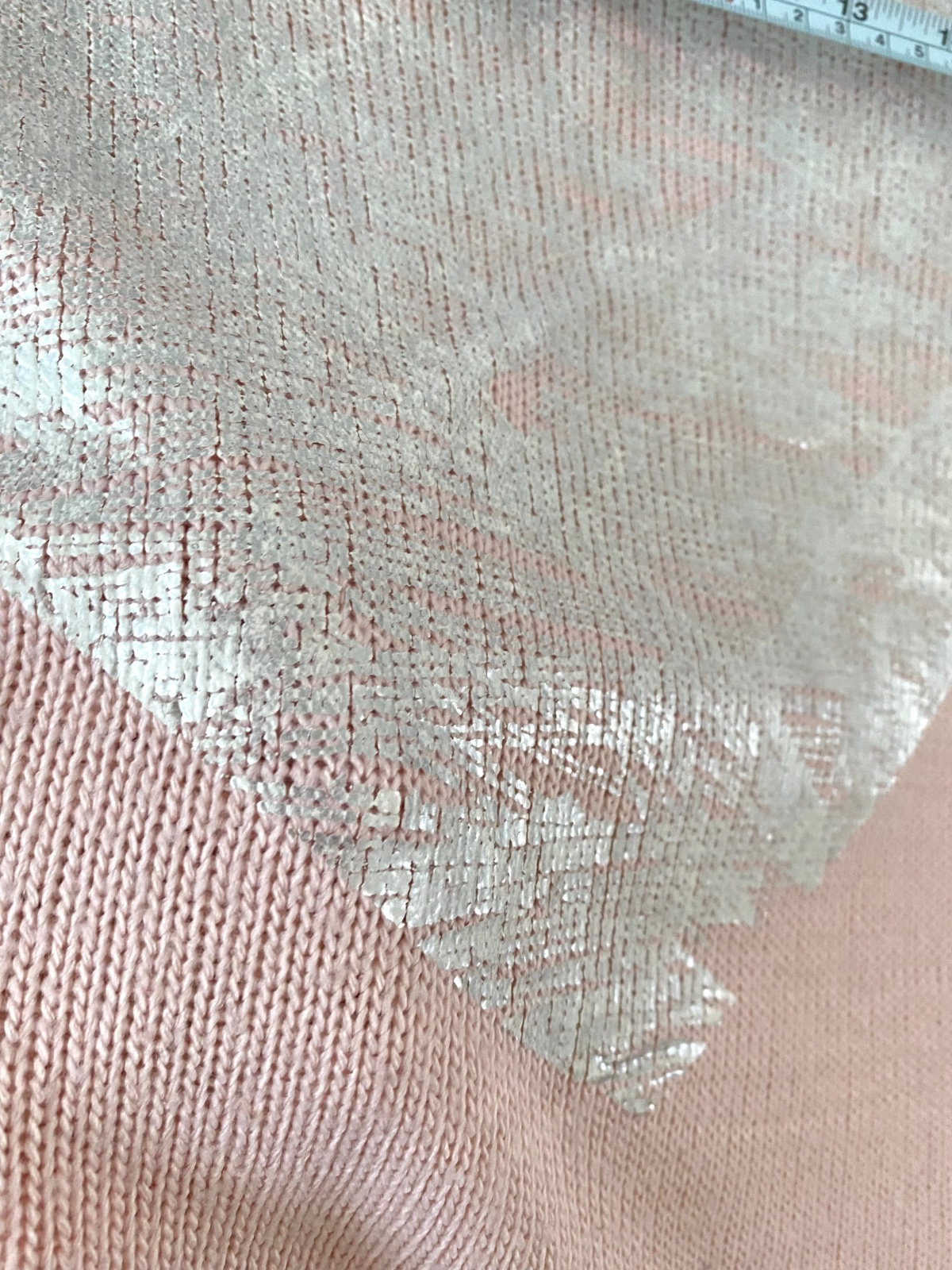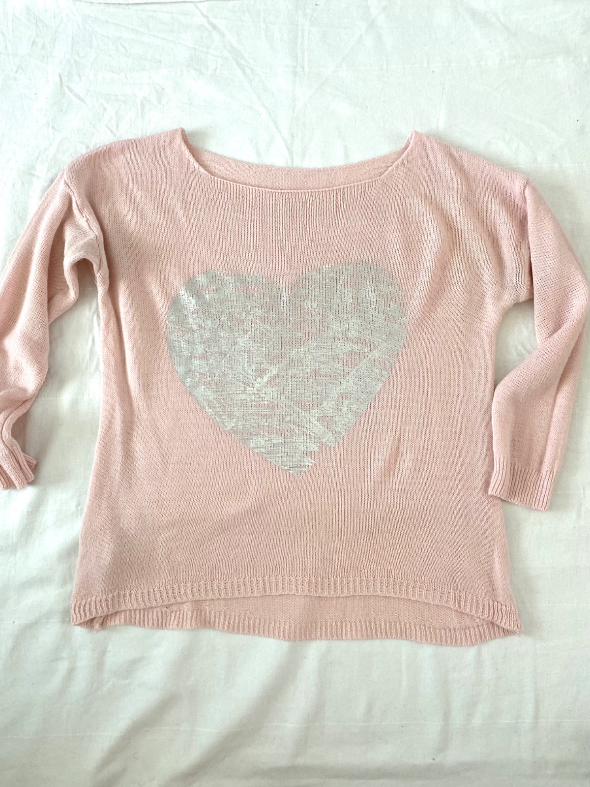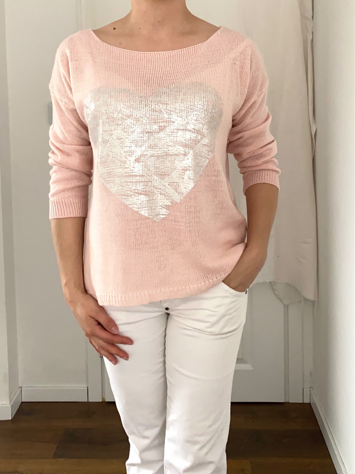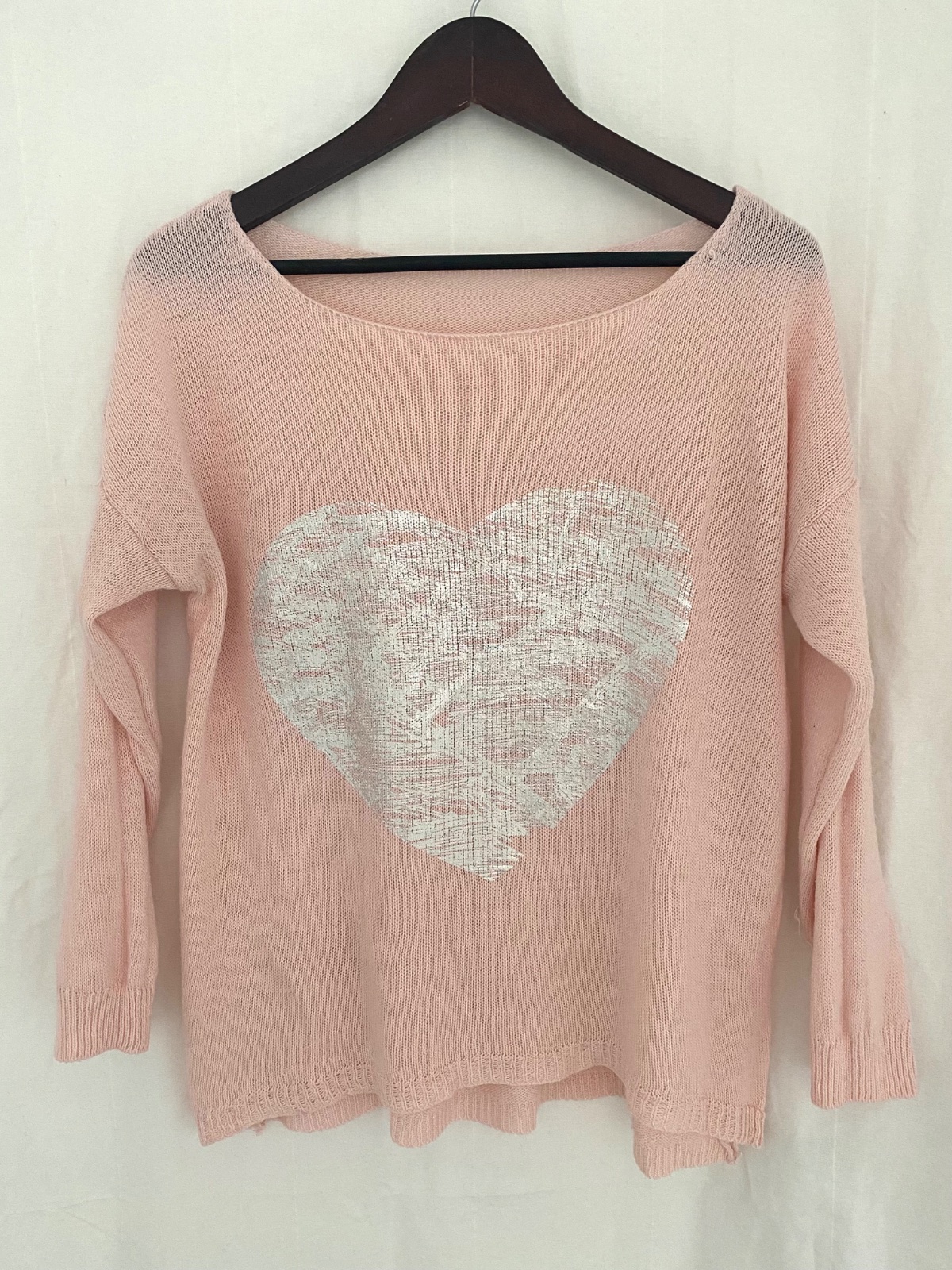 Svetrík s pridanou vlnou v krásnej jemnej ružovej farbe. Sveter má okrúhly výstrih, jednoduchý oversize strih s padajúcimi ramenami. Má aj krásnu striebornú potlač srdca. Zloženie je 20% vlna. Je tenší, ale teplý. Veľkosť by som označila ako univerzálnu, bude dobrý na M aj L. Všetky rozmery sú na fotkách. Sveter má výrobnú chybu zobrazenú na poslednej fotke.