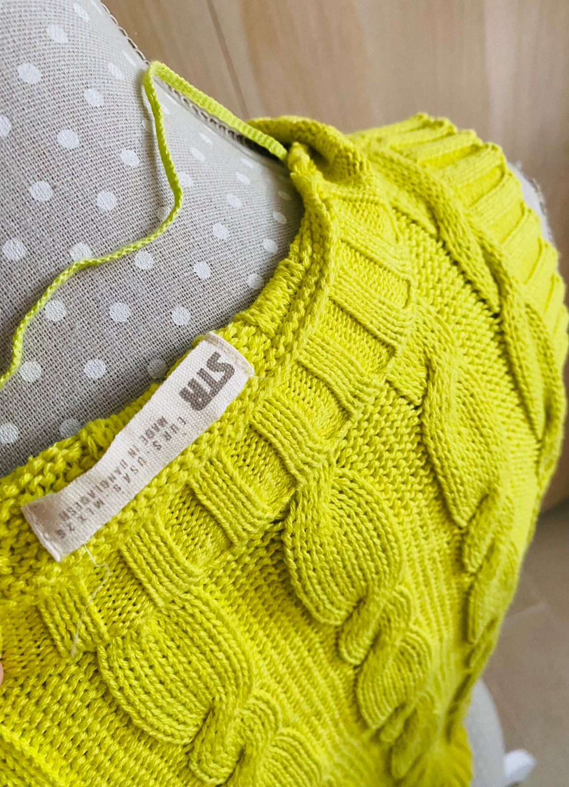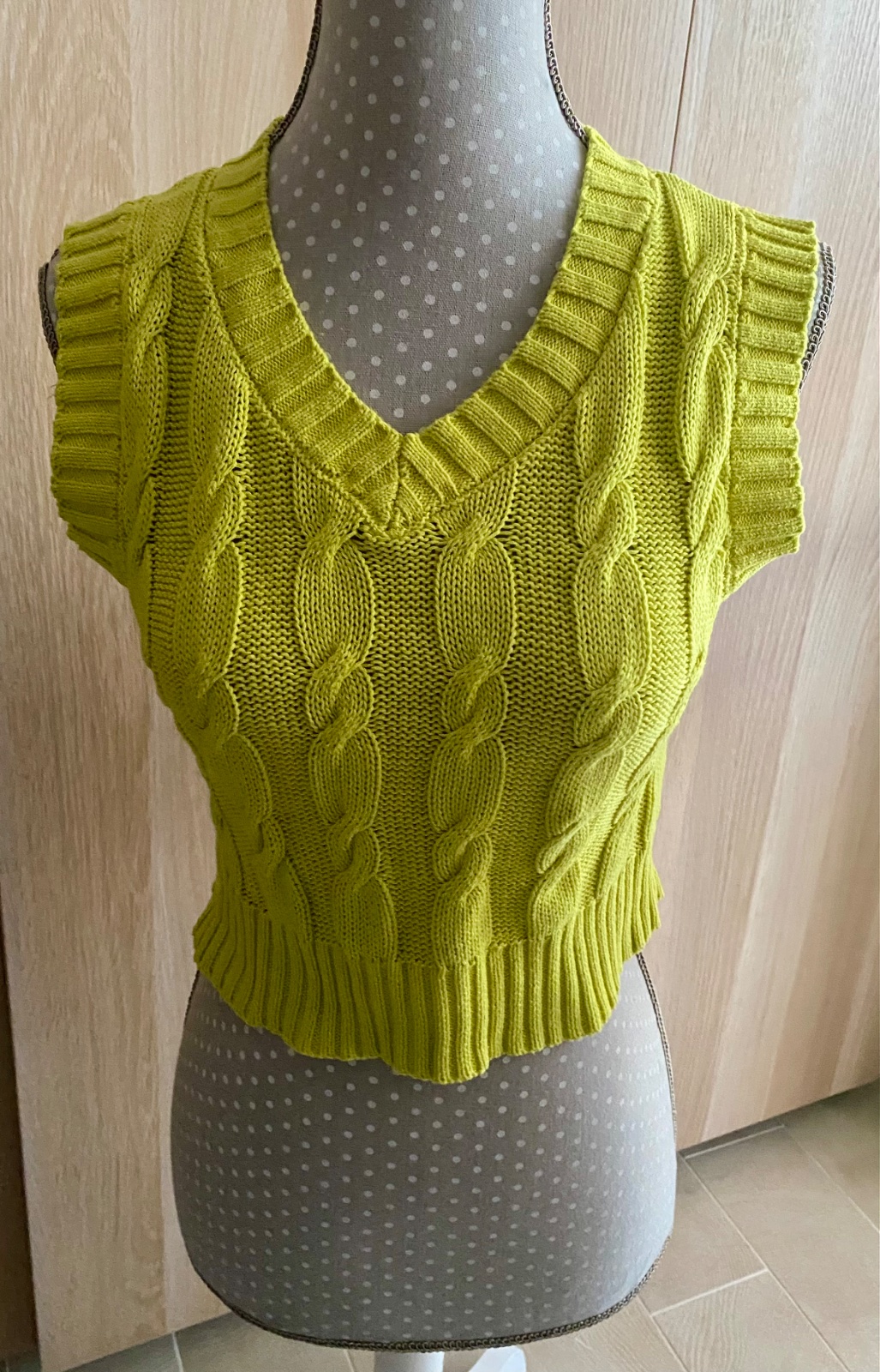 Krásna farba, pletená vesta, osmičkový vzor, dá sa nosiť na bluzku/natelník, alebo samostatne ako tričko v lete; Oblečená možno raz, je mi žiaľ malá; sadne na XS, XXS, 152, 158, (veľkosť uvedena je S)