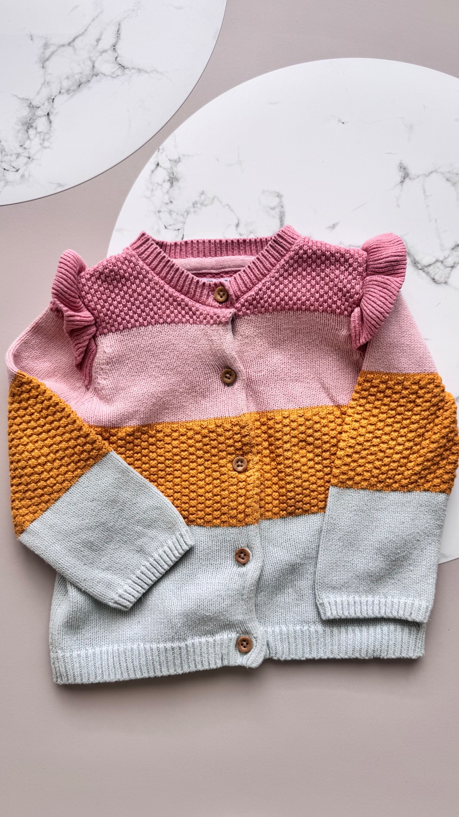 Svetrík vo výbornom stave na štítku uvádzaná veľkosť 6 až 9 mesiacov ale kľudne vynosíte aj dlhšie, málo nosený. Zapínanie na gombičky, bez poškodenia