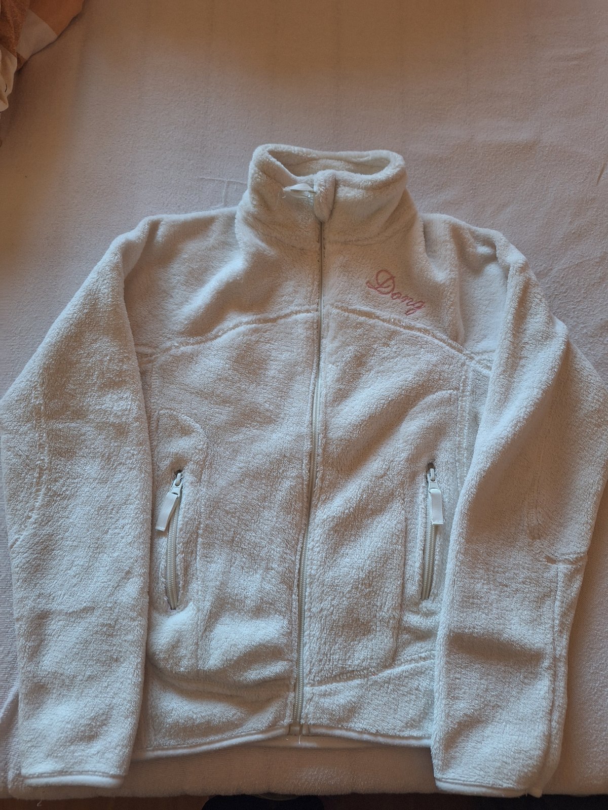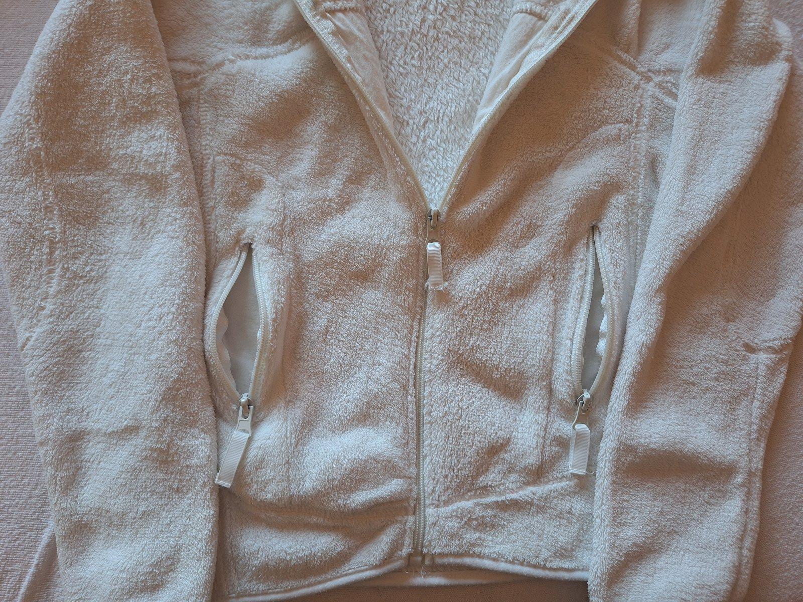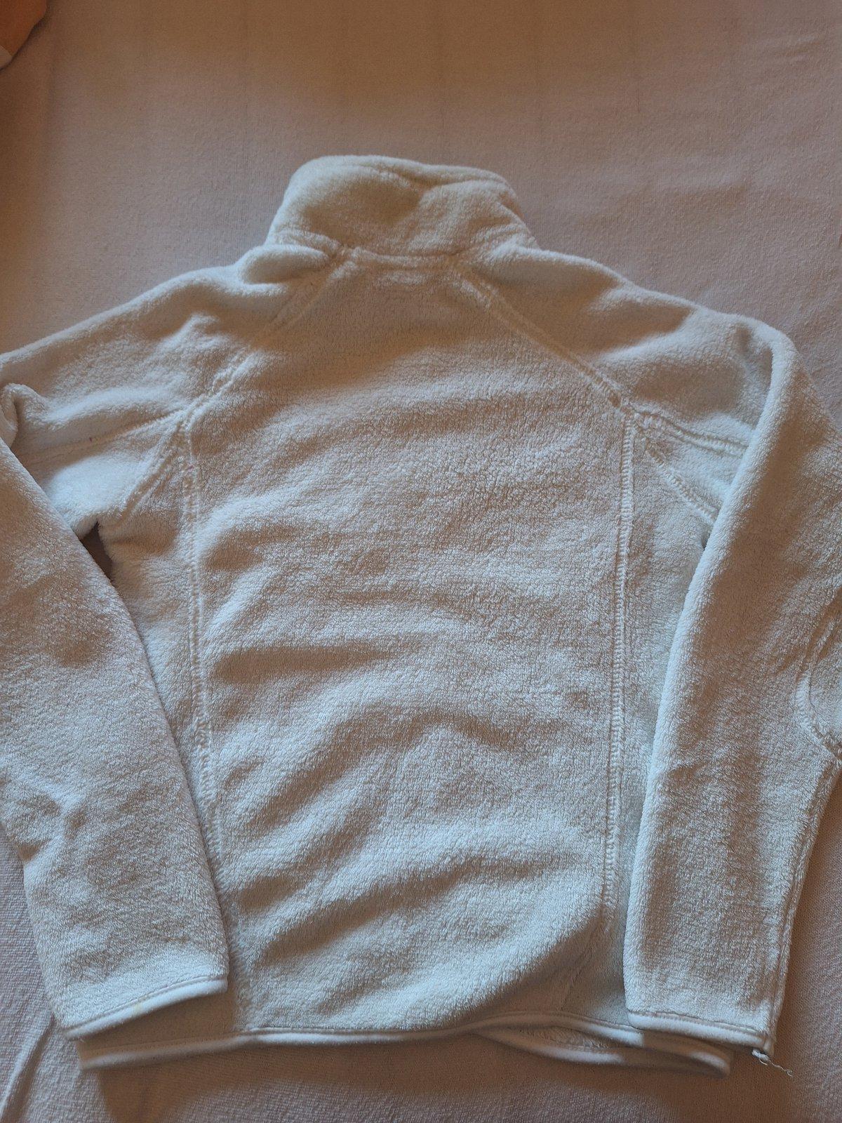 Predám bielu flisovú dievčenskú mikinu so zapínaním na zips, so stojačikom s nápisom hore v pravo, vrecká po bokoch sú na zips, veľmi zachovalá, bez poškodenia, veľ. je písaná 12.