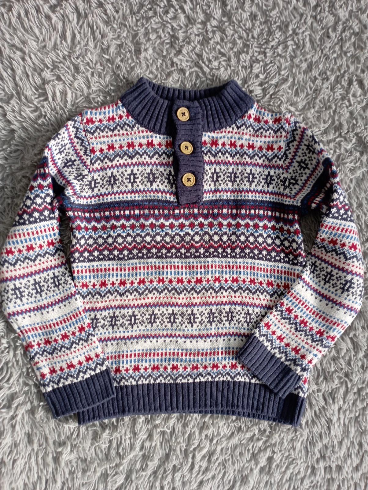 Top stav. Krásny striekaný - sivo, modro, biely svetrík, kupovaný nový pre syna v Lidl - nosený iba do škôlky. Rozmery: - CD: 46 cm - šírka: 33,5 cm - rukáv od krku: 48 cm Odporúčam