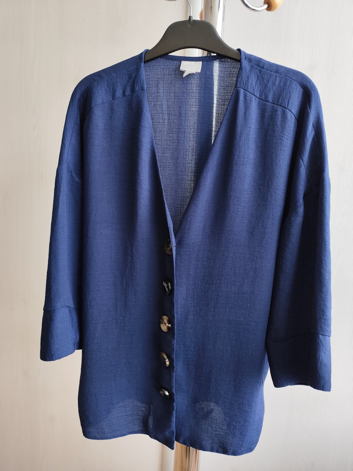 Tenké bolerko na zapínanie na spôsob saka. Cez prsia 2 x 50 cm, dĺžka 66 cm. Na stranách rázporky. Prostredný gombík je trocha iný, ale hodí sa...Vo výbornom stave.
