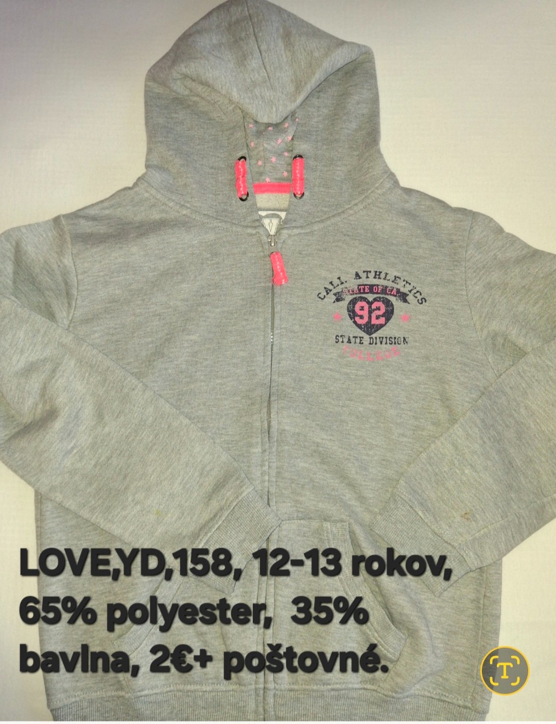 Predám málo nosenú mikinu šedej farby, LOVE YD, 158, 12-13 rokov, zapínanie na zips ,s kapucnou , vrecka voľné bez zapínania. 65% polyester, 35%bavlna, váha 392g.