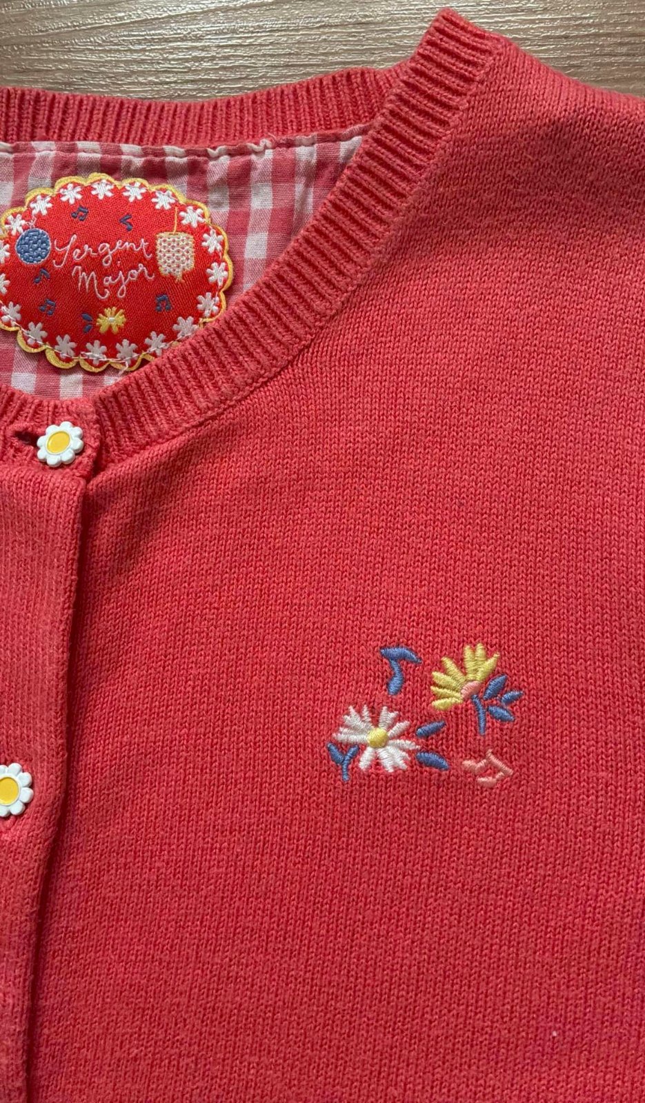 Predám štýlový ružový svetrík veĺ.140- 10r., zn.Sergent Major, má jemné detaily, krásne kvetinové výšivky a vkusné lemovanie vreciek, zapínanie na gombíky, d=43cm, š=38cm, r=52cm, zmes bavlny a viskózy, málo len príležitostne nosený.