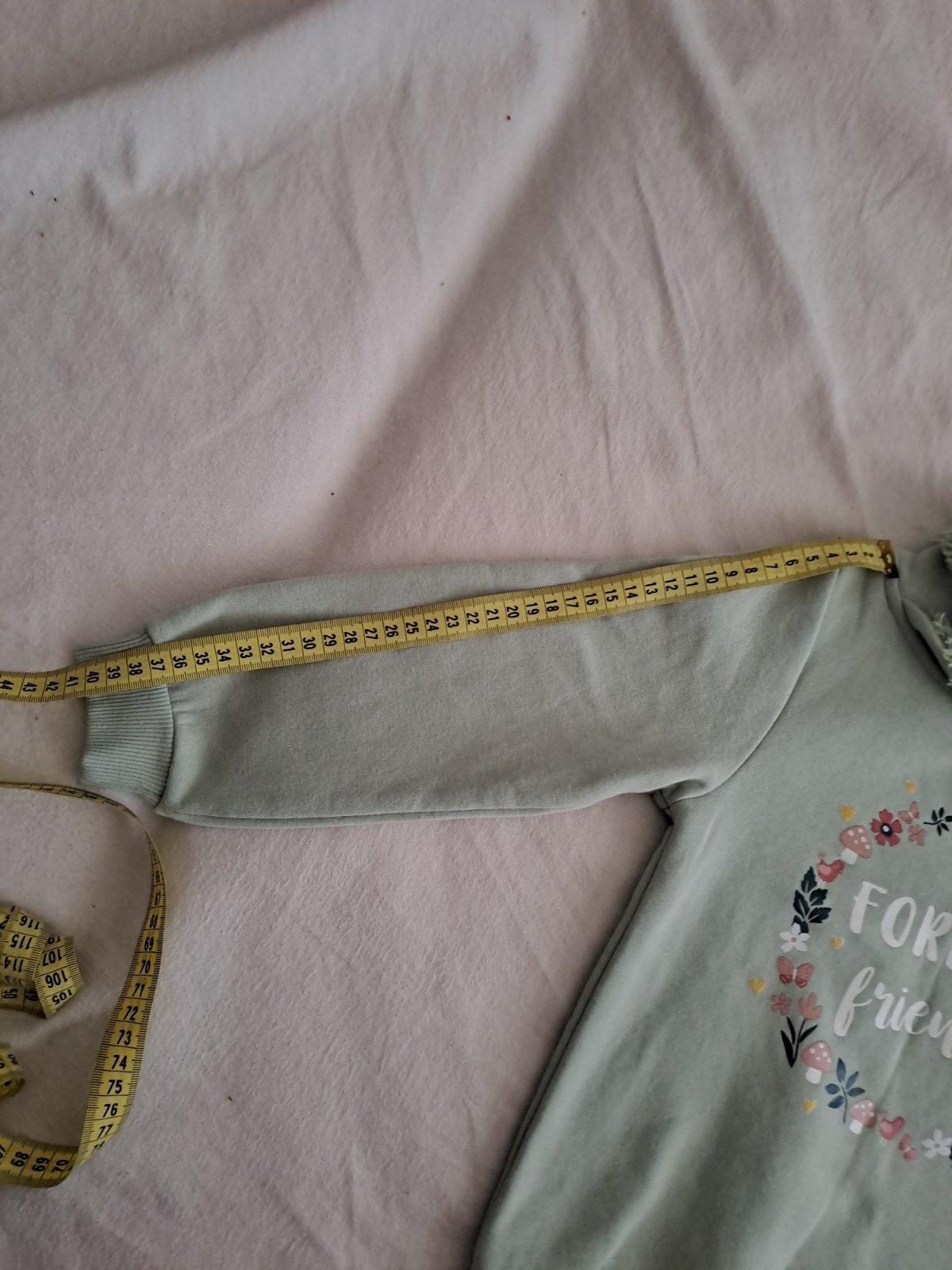 Bez poškodení. Treba ju pravidelne odzmolkovat lebo cca po troch praniavh sa vždy vytvoria nové. Príde mi väčšia, skôr 116 tak radšej čítajte rozmery. Dĺžka 45 CM Šírka 2x 34 CM Rukáv od ramena 40