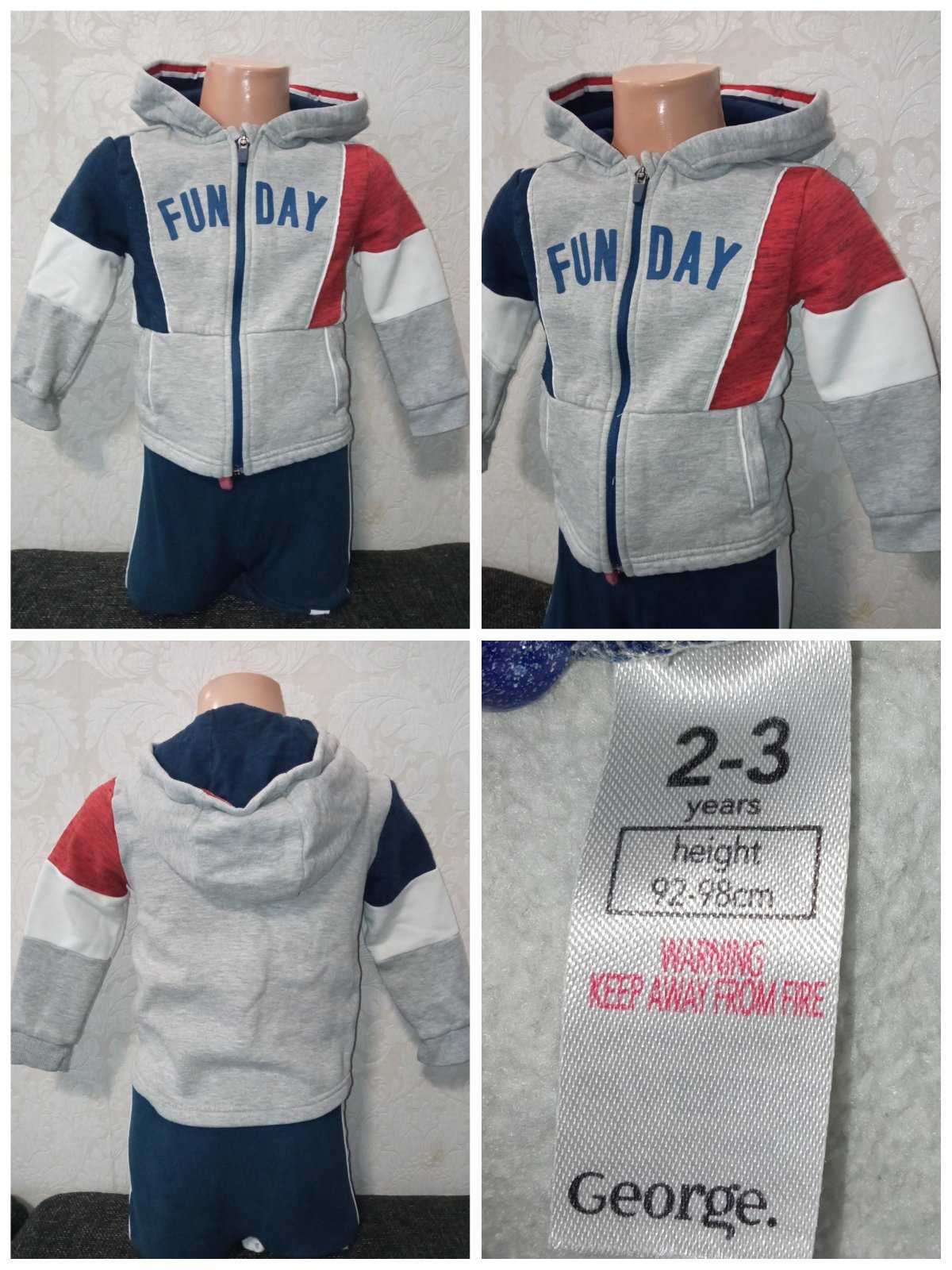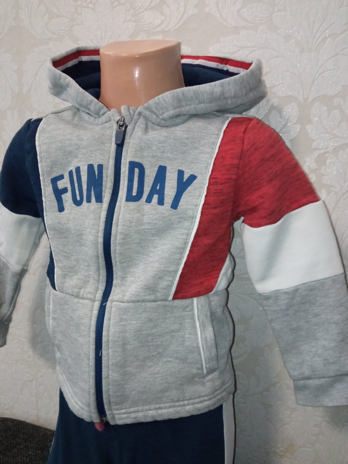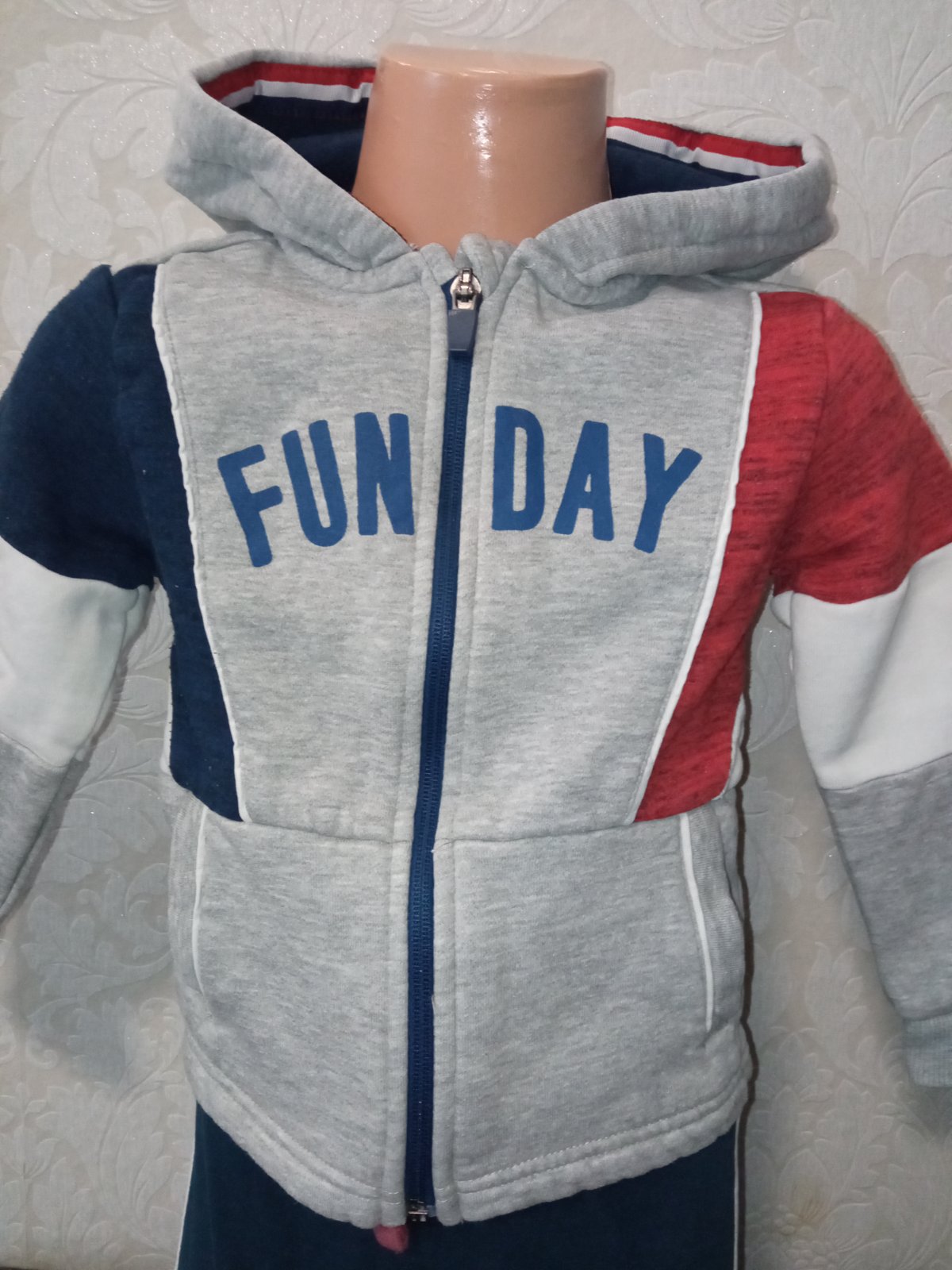 Chlapčenská mikina s kapucňou a nápisom FunDay, zapínanie na zips, dve bočné vrecká, vo vnútri flís, jemne elastická, materiál 75%bavlna,25%polyester, dvojité číslovanie 92-98.