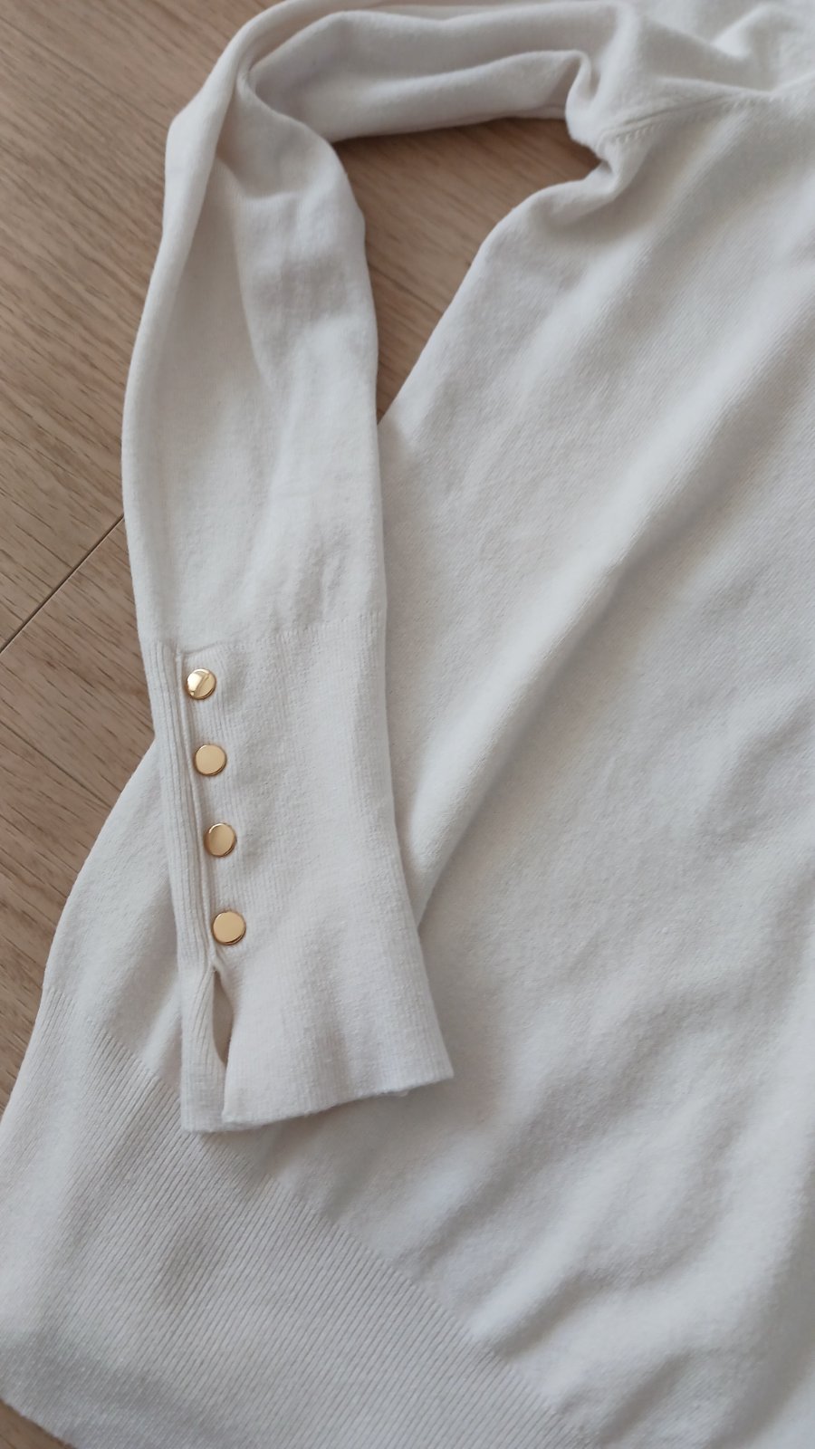 Pekny tensi bavlneny pulovrik, bez zmolkov, flakou. Nevitahany, nespeany, v perfektnom stave. Jedine co by ste pri velmi podrobnom skumani nasli je mali jemny pasik inej strukturi na rukave. Vidno ...