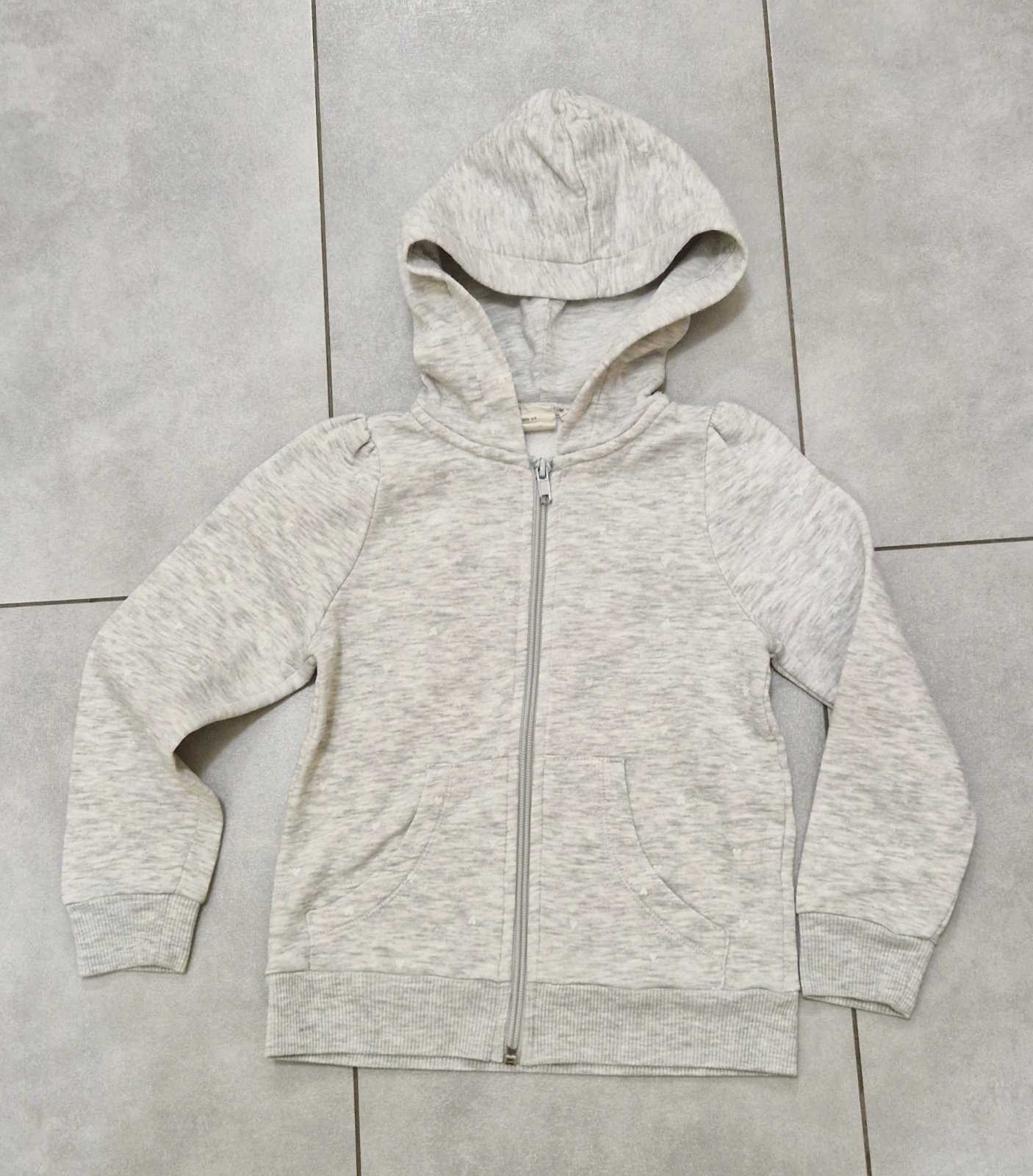 Mikina na zips s kapucňou zachovalom stave šedá s potlačou malých srdiečok bielej farby