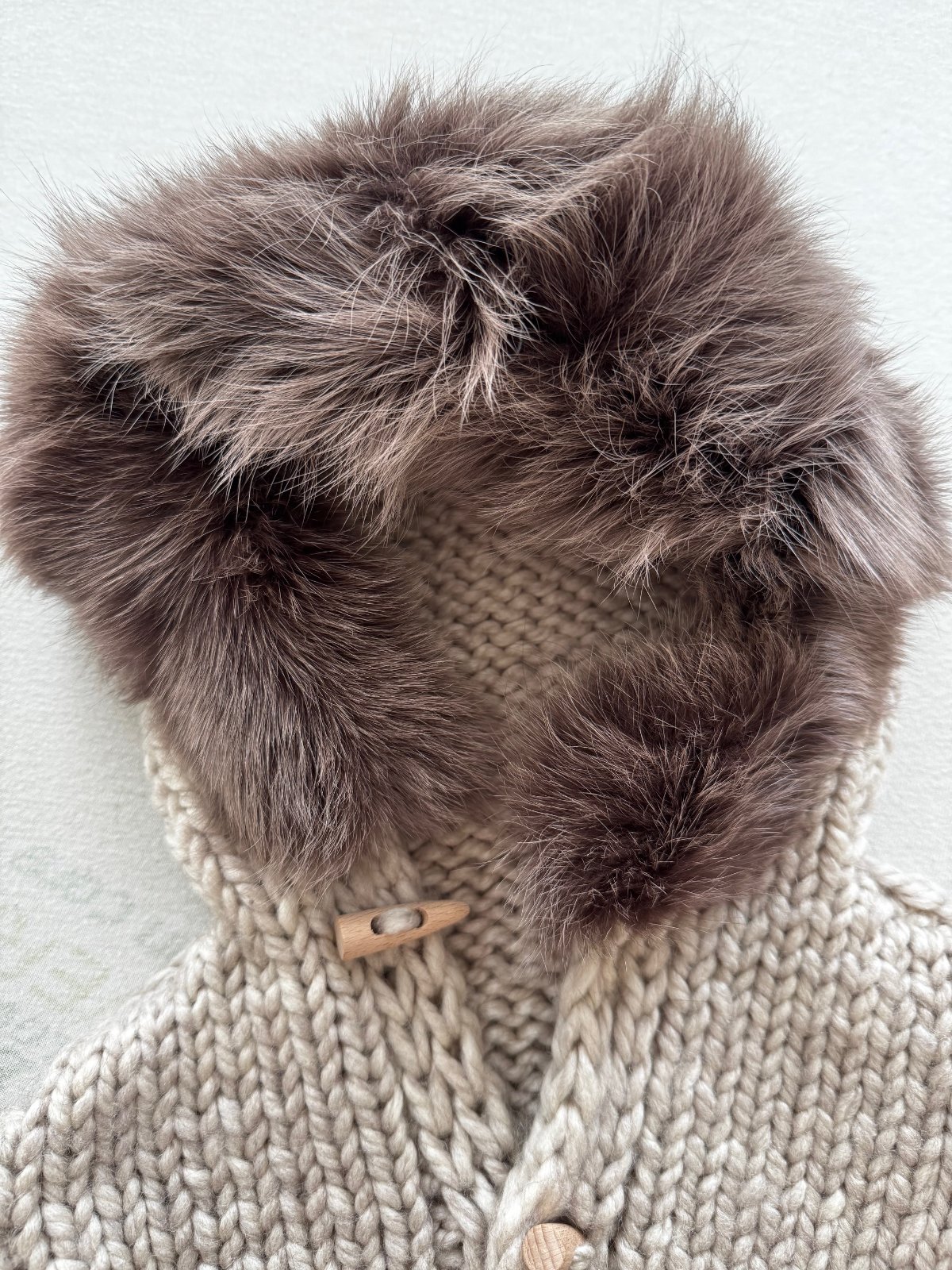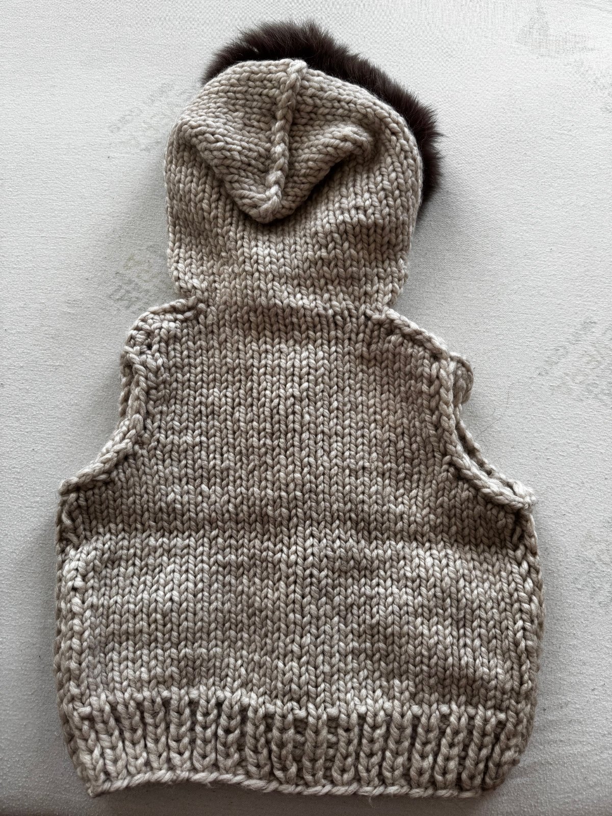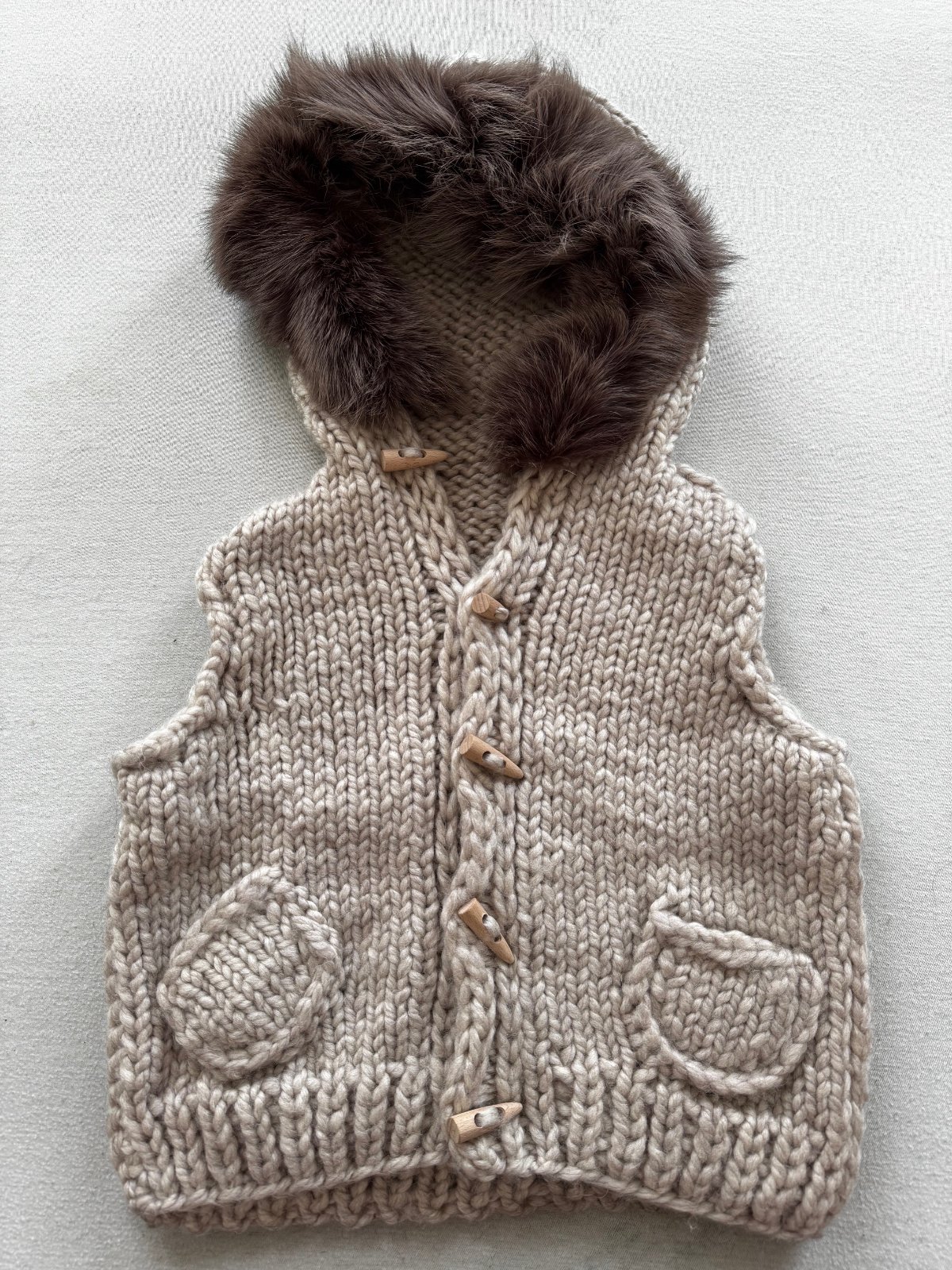 Nádherná štrikovaná vesta zn. IM, svybky s pravou kožušinou z mývala, vzatá 1x na fotenie, ručná práca, top stav bez poškodení, unisex vhodná pre chlapčeka alebo dievčatko, veľkosť cca 1 - 1,5 roka (celková dĺžka vpredu cca 39 cm a celková šírka pod pazuchami cca 42 cm). PC vysoká.