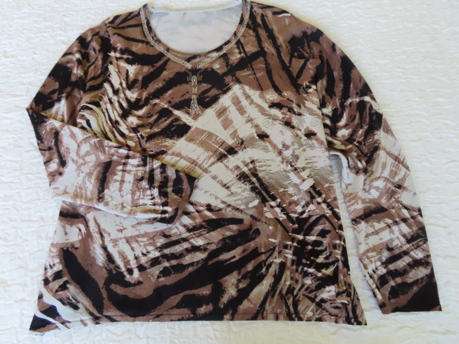 Pulóver má malé V-čko, okolo neho drobné trblietky do tvaru náhrdelníka.
