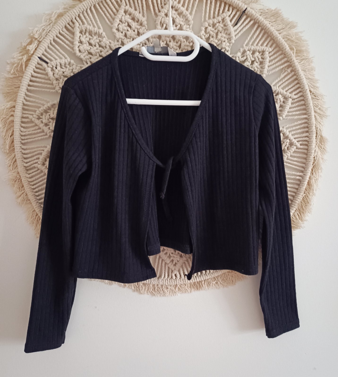 Bolerko z mäkučkého neškriabavého úpletu, s ozdobným trblietkavým volánikom po celom obvode. Zapínanie na malý gombíček. Veľkosť udávaná výrobcom: 122/128.