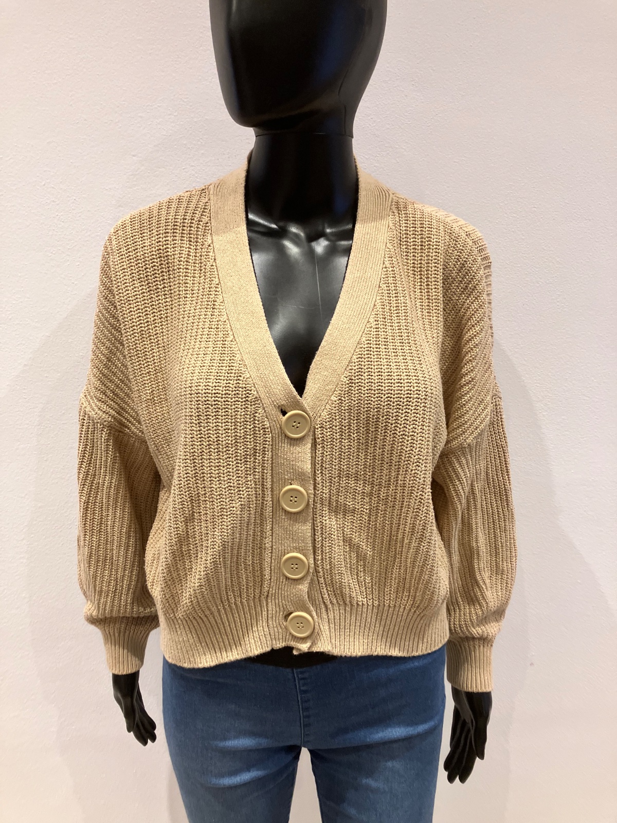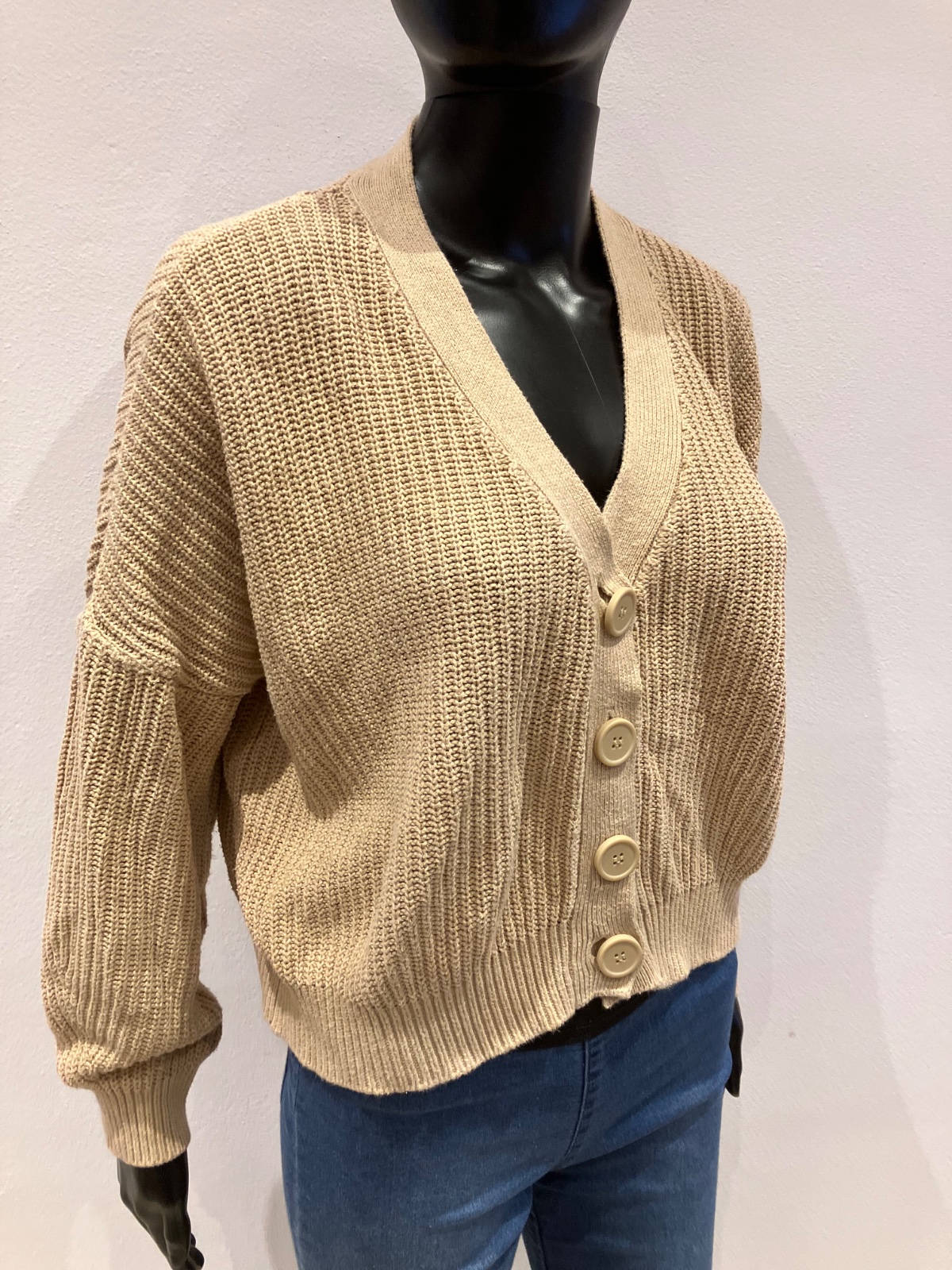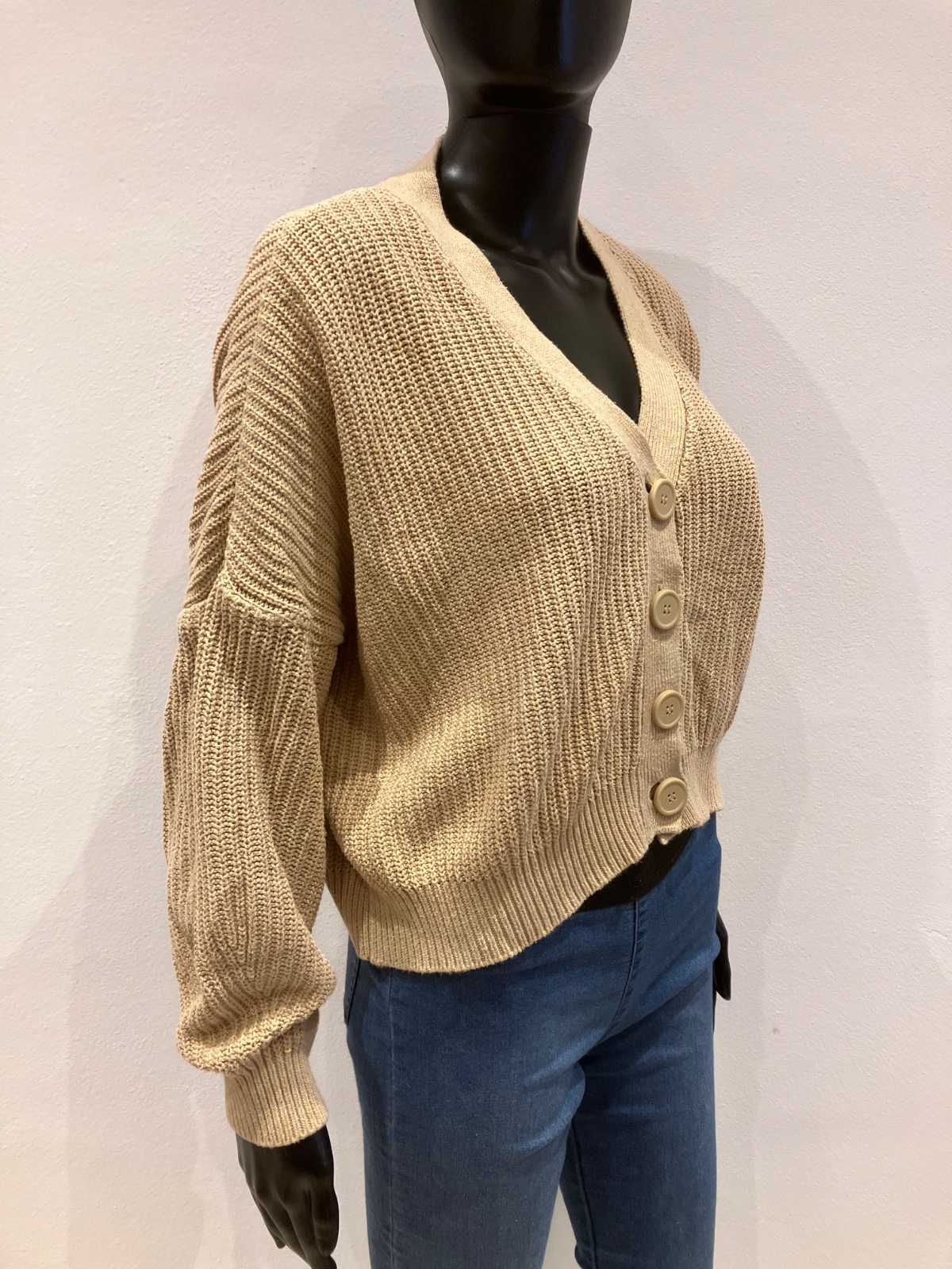 Dámsky ležérny sveter krátky, véčkový výstrih, zapínanie na gombíky, elastický, hrubší, materiál 100%bavlna.